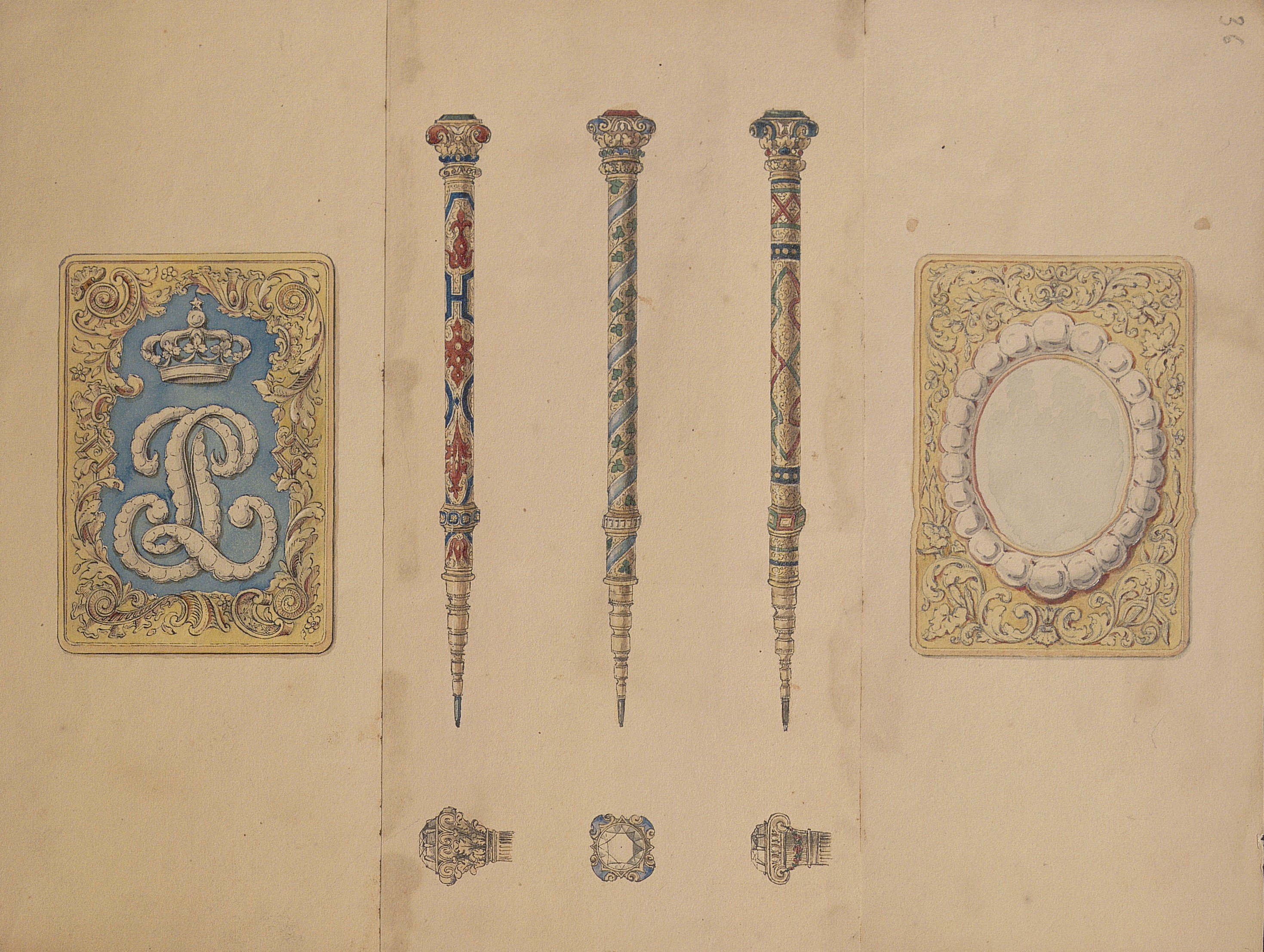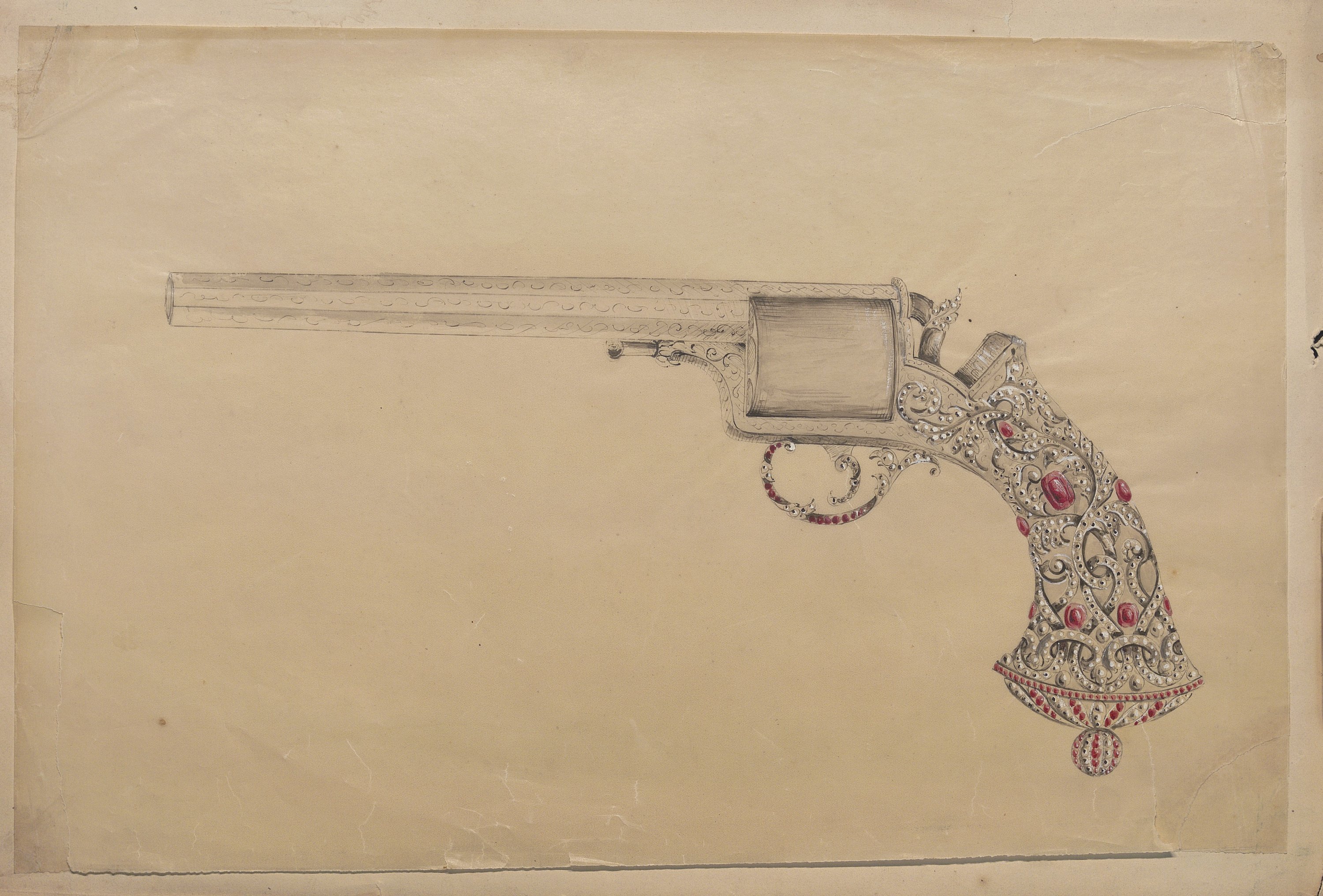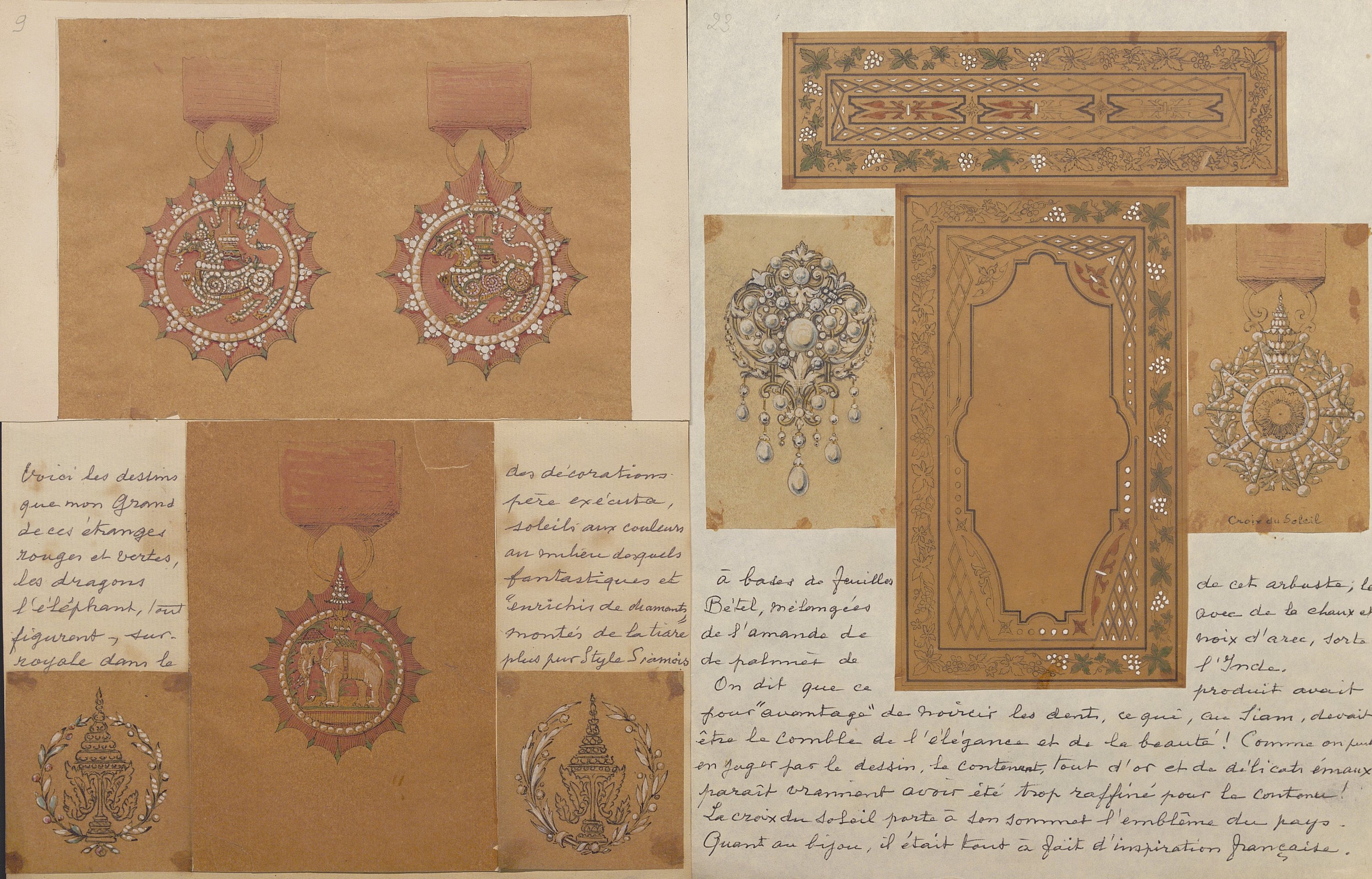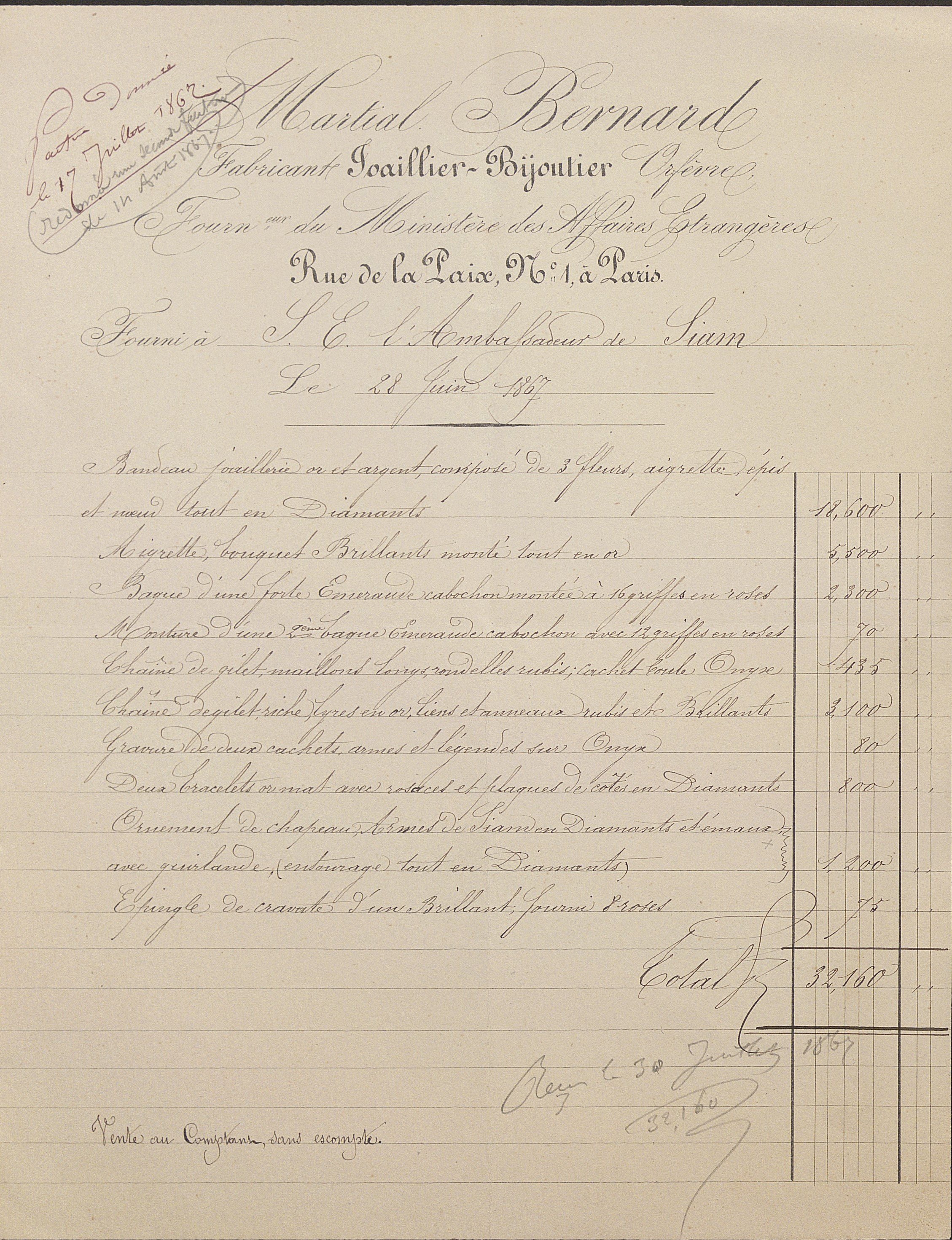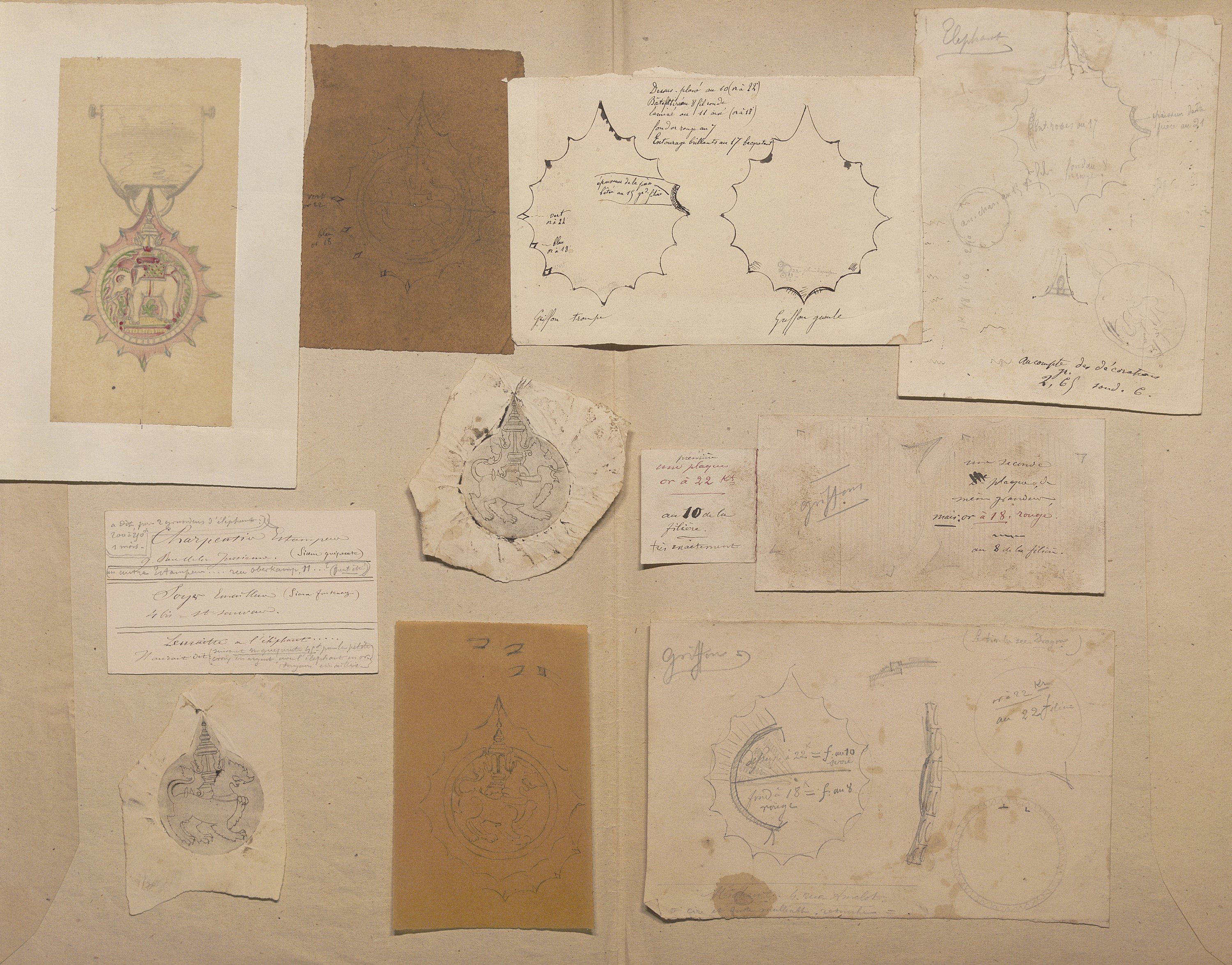 Joailliers du ministère des Affaires étrangères, nous y trouvons des commandes diplomatiques telles qu’un modèle de revolver dans le goût de la maison Devisme, encre et gouache, sur calque, 28 x 42 cm (déchirures) à la crosse ornée et sertie de pierres précieuses ; dossier contenant une vingtaine de croquis, notes manuscrites, copie de la facture (28 juin 1867) et traduction de la lettre de créance, concernant une commande de bijoux (aigrette, chaîne, bague, épingle, bracelets, etc) à l’adresse de l’ambassadeur du Siam, photo portrait format cdv de l’ambassadeur du Siam en France en 1868.