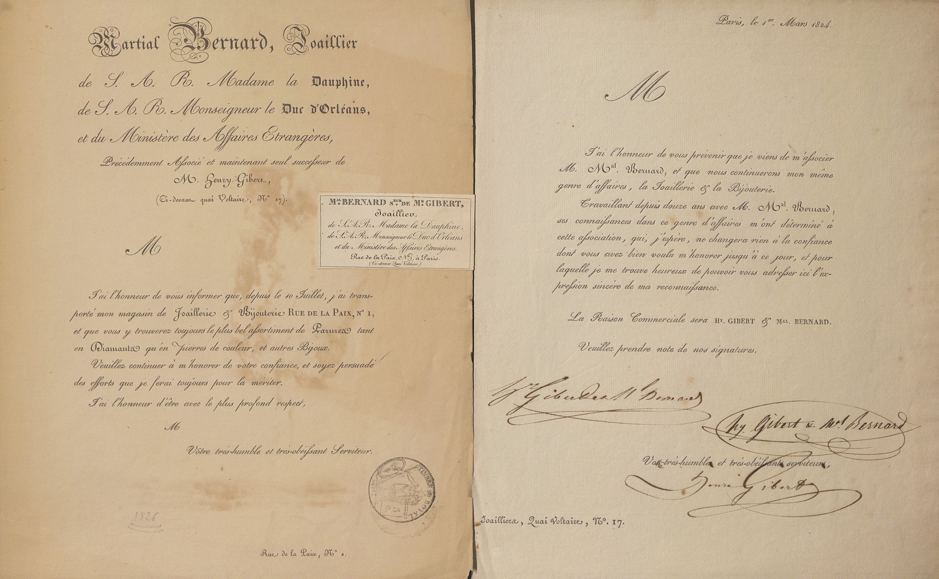 Ce dernier quitte le quai voltaire et emménage le 1er juillet 1826 au n°1 rue de la Paix s’affichant désormais comme « Joaillier-bijoutier, successeur de M. Gibert, joaillier de S.A.R. Madame la Dauphine, de S.A.R. le duc d’Orléans et du ministère des Affaires étrangères ».