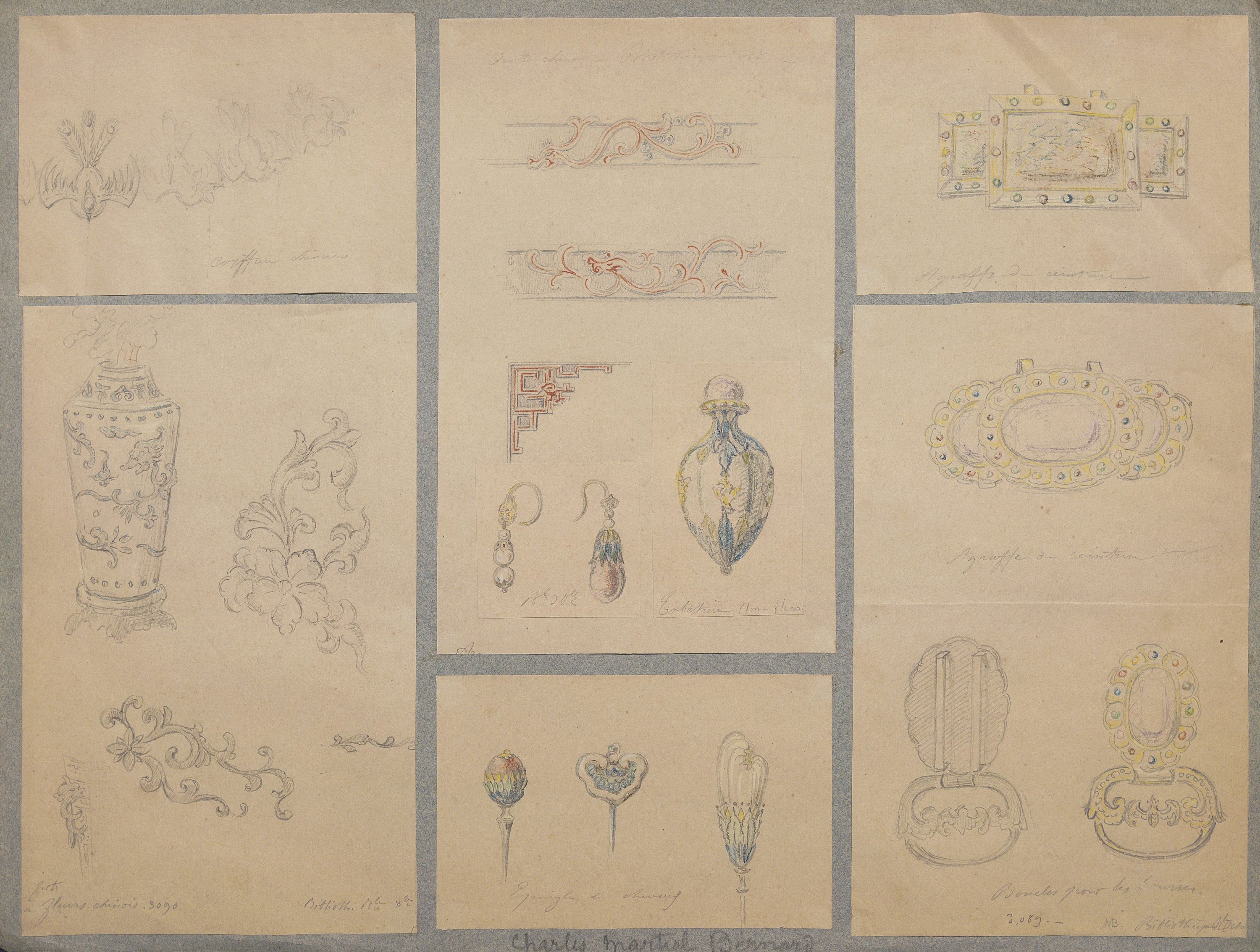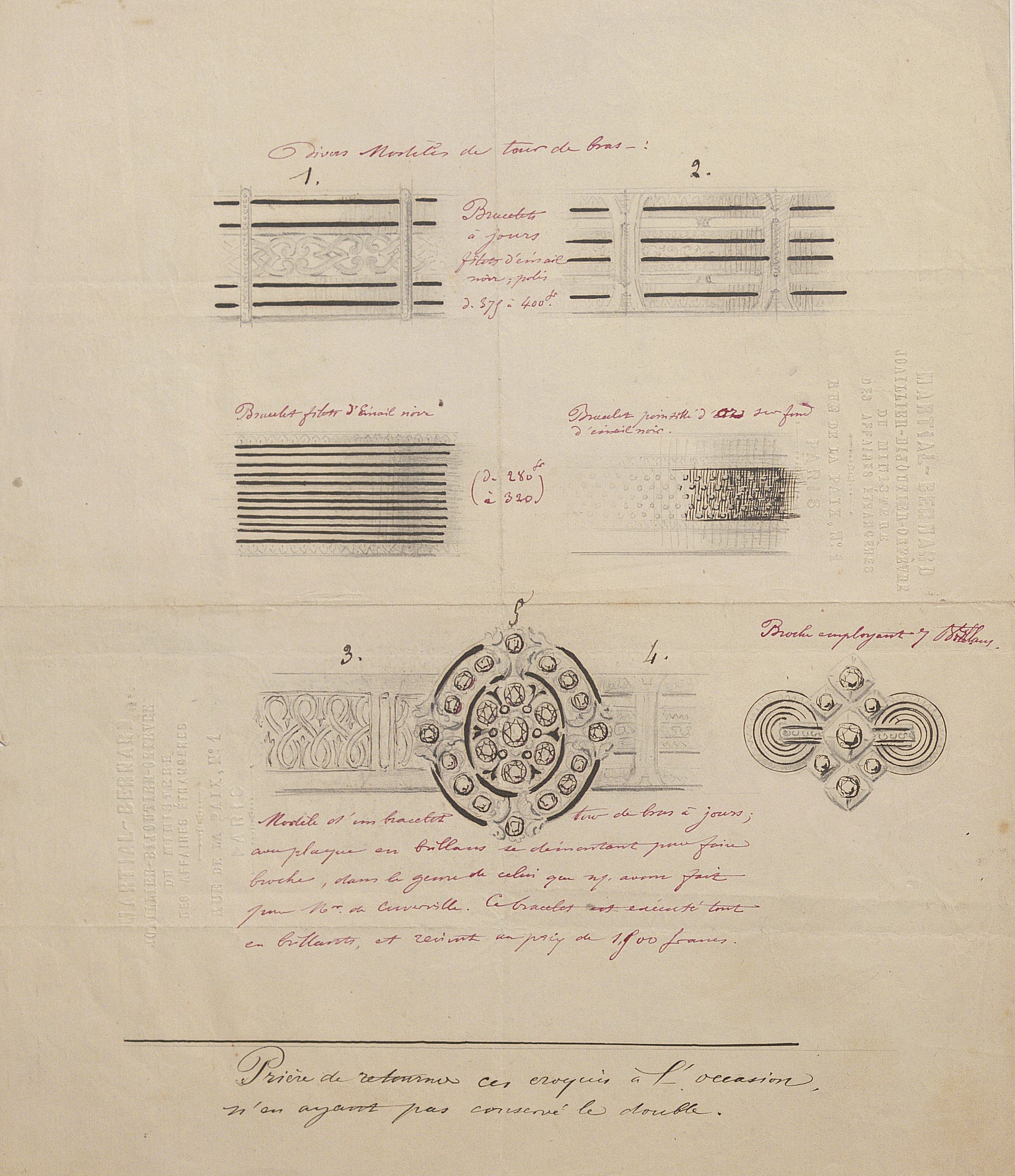 A côté de cet important ensemble de dessins de bijoux de luxe, sont conservés: Prospectus imprimé informant l’association Gibert/Martial Bernard (1824) ; Prospectus imprimé informant du transfert du magasin de joaillerie et bijouterie Martial Bernard au n°1 rue de la Paix (1826) ; Carte de visite « Martial Bernard Succr de Mr Gibert, joailler de la Maison du Roi et du Ministère des Affaires étrangères, rue de la Paix n°1 à Paris (ci-devant quai Voltaire) » ; « Liste des Brillans, perles, pierres fines, etc volés dans les appartemens de Madame la princesse d’Orange à Bruxelles dans la nuit du 25 au 26 septembre 1829 », 1 page in-4, avec planche illustrée des bijoux in-folio ; planche photographique, 27 x 20 cm, exposant les créations de la maison Martial Bernard à l’exposition de 1867 ; 5 clichés photographiques par Alexandre Quinet des joyaux de la Couronne vendus en 1887 ainsi qu’un carton de place réservée au nom de Martial Bernard ; Paquette « Société d’encouragement de la Bijouterie, de la joaillerie et de l’orfèvrerie, 20e anniversaire », Paris, Impr. Davy, 1896 ; planches gravées, 18e et 19e siècles, etc.