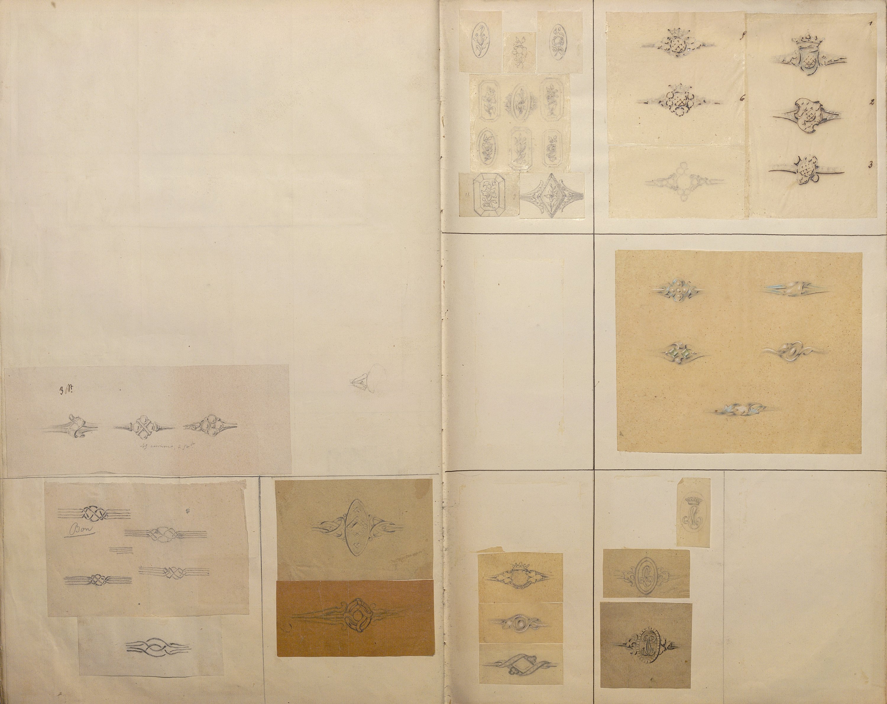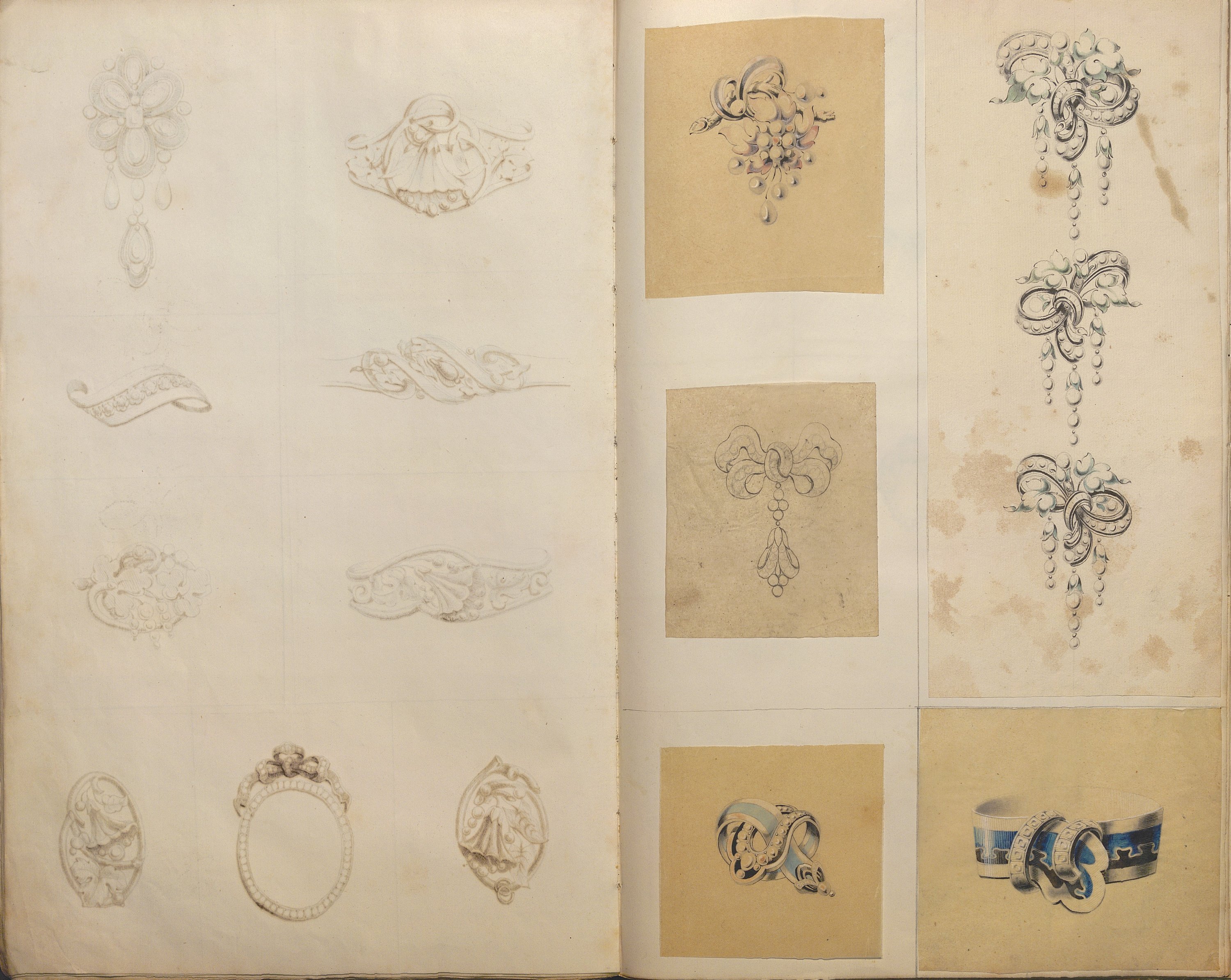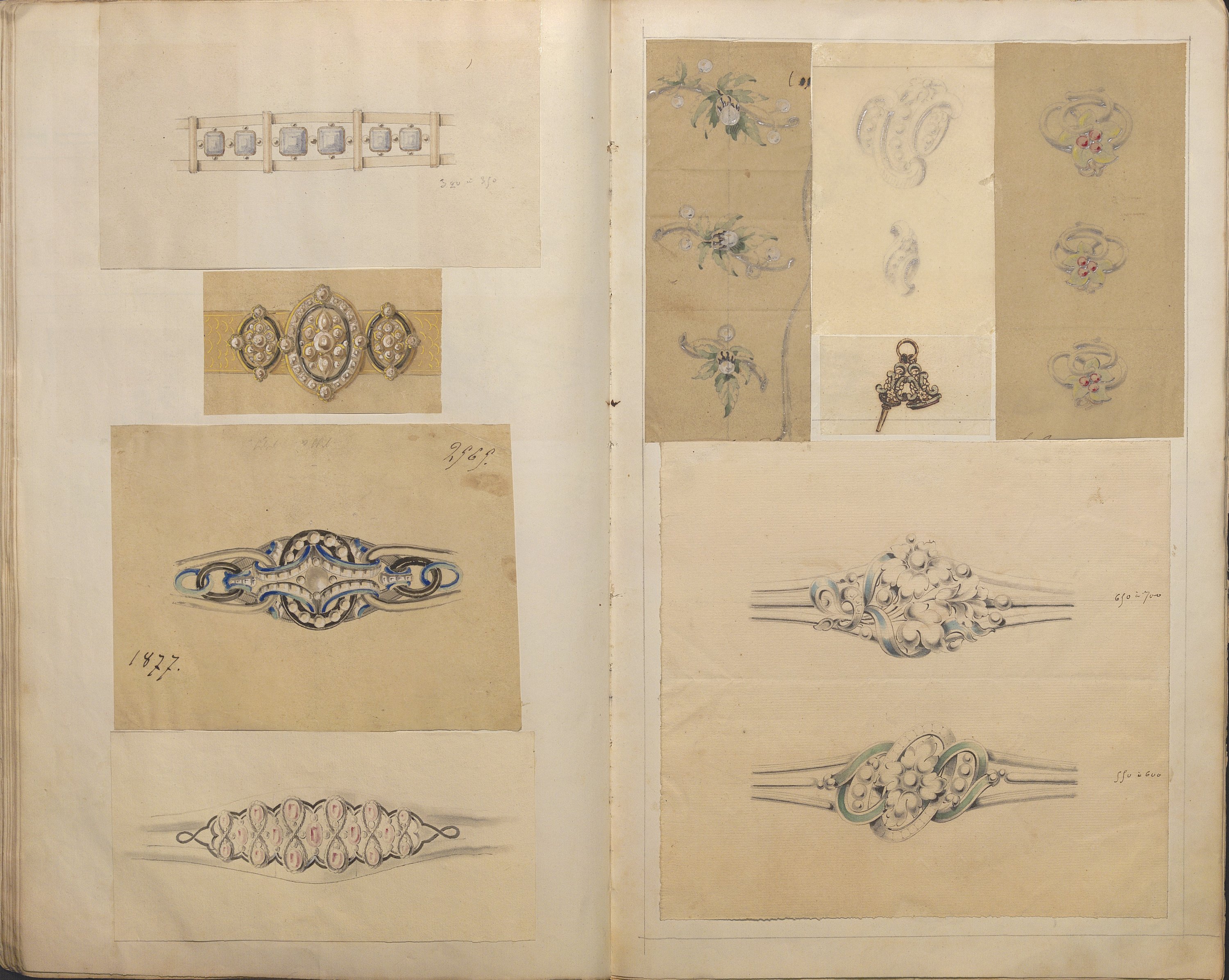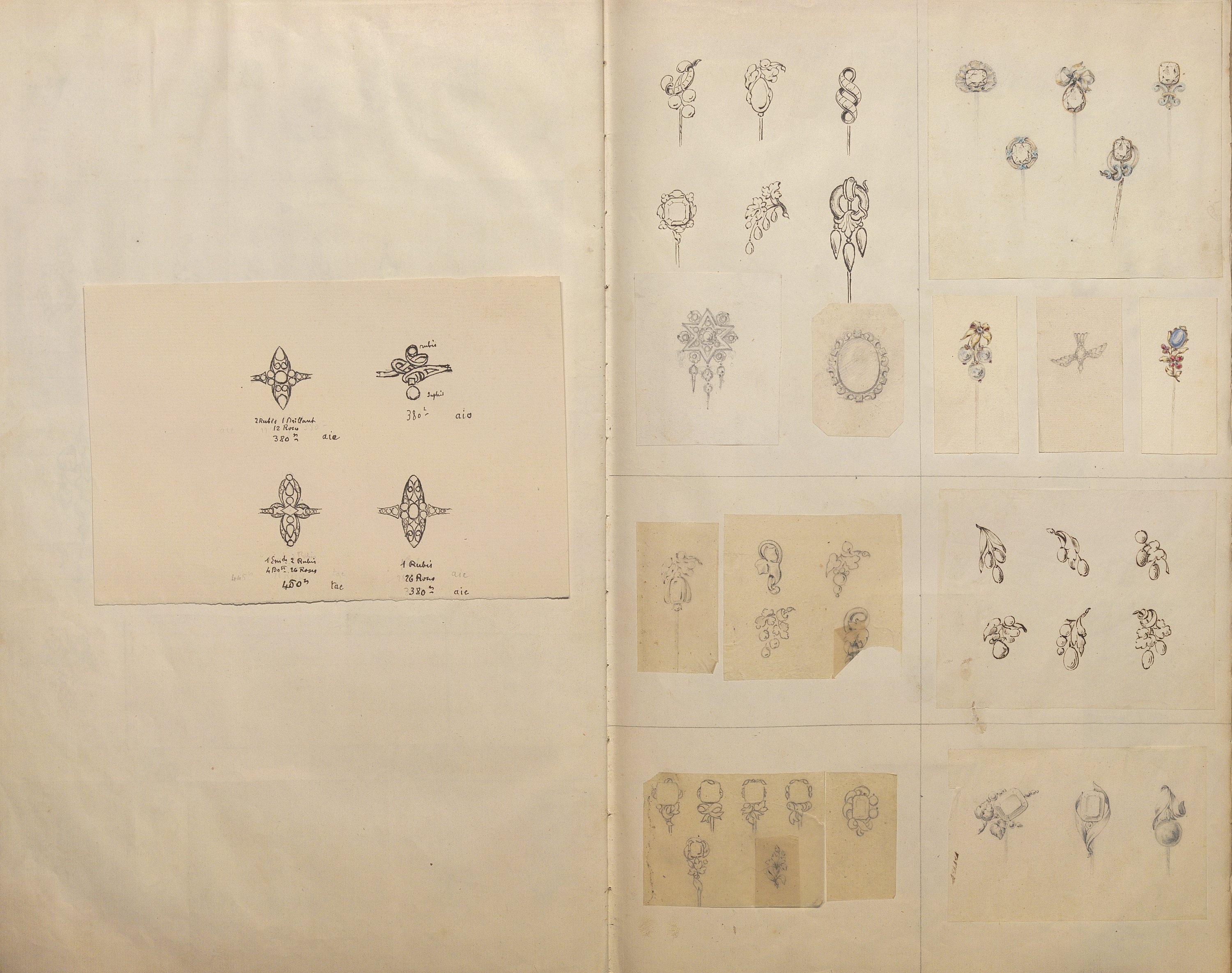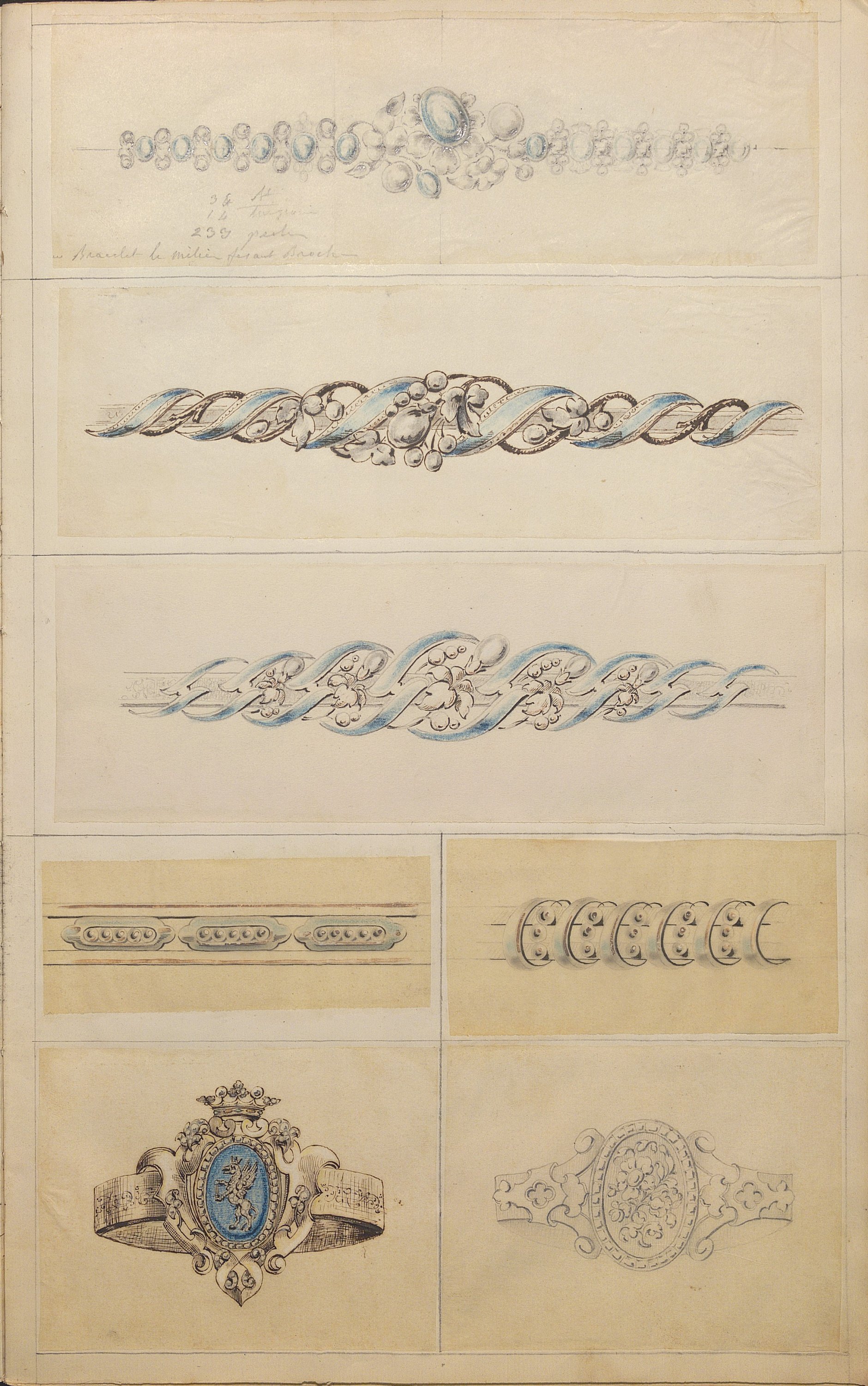 D’une grande richesse de modèles, ces centaines de dessins expriment l’esprit romantique et les orientations de l’art du temps: l’historicisme, l’orientalisme, le naturalisme raffiné. Les nombreuses planches sont consacrées aux modèles de broches (corsage, pendeloques, boutons, etc), diadèmes, bracelets-sautoirs démontrant l’extraordinaire faveur dont ces bijoux bénéficient, mais aussi cachets ou portes sceaux dont modèle pour la Dauphine (mars 1830), bagues, boucles d’oreille, colliers, coques de montre, croix, chiffres de Louis-Philippe roi des Français et de la Reine Marie-Amélie, du duc de Montpensier.