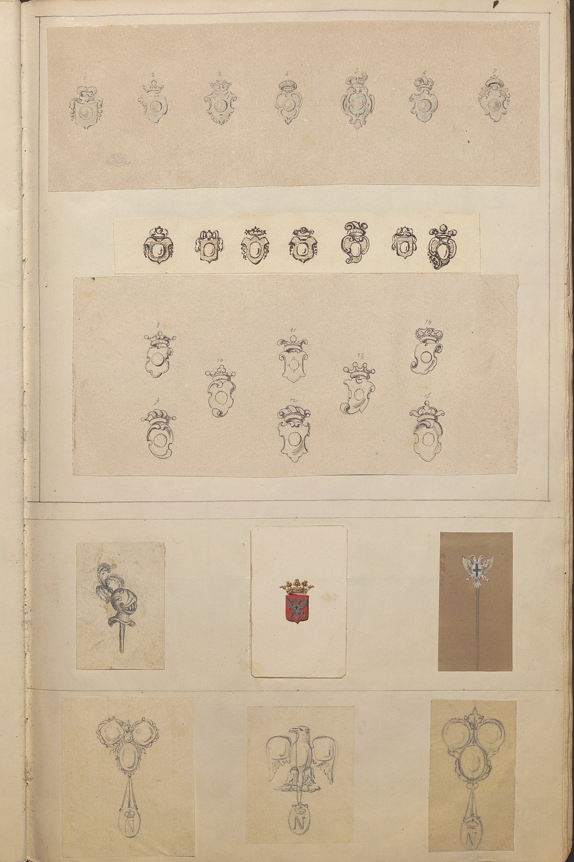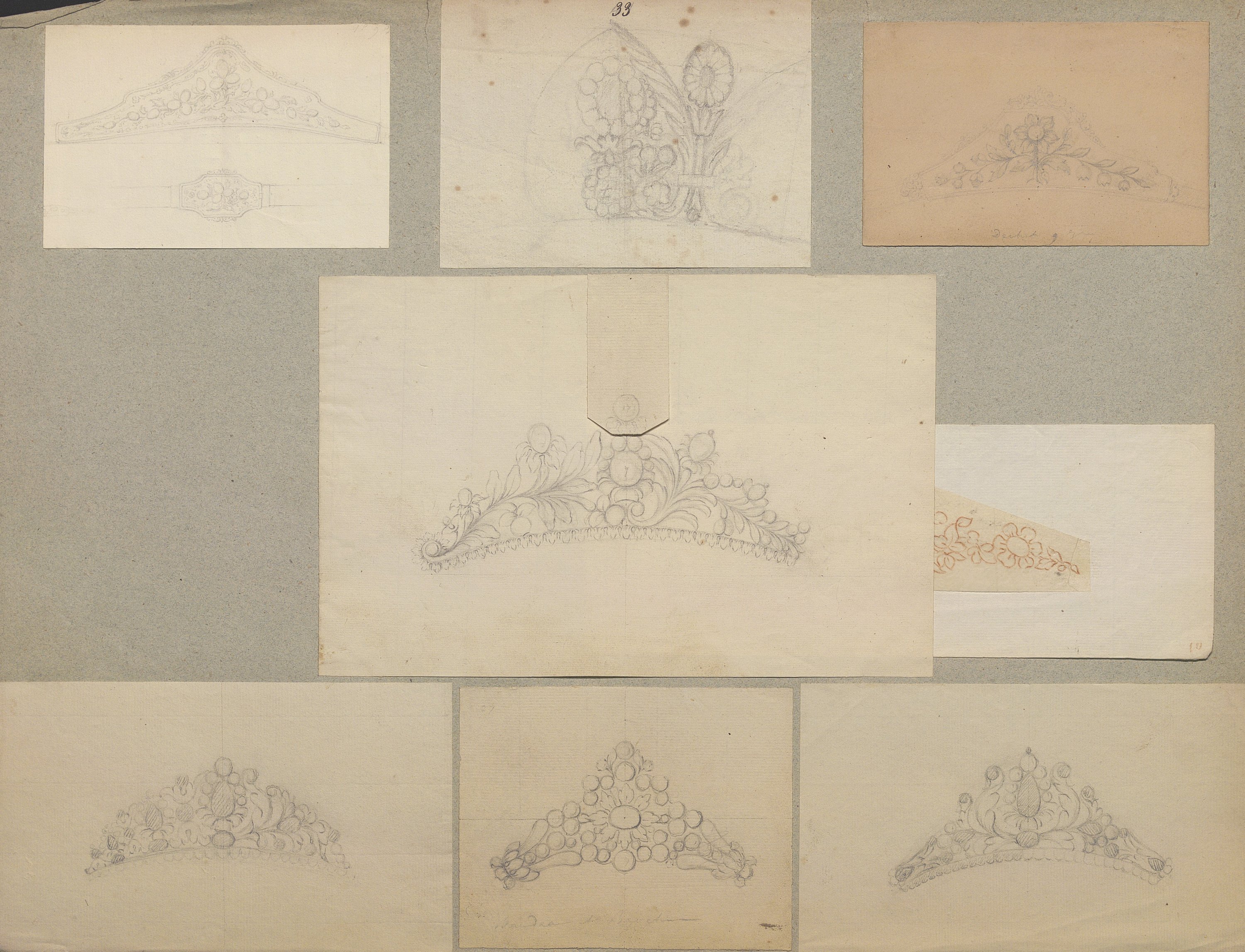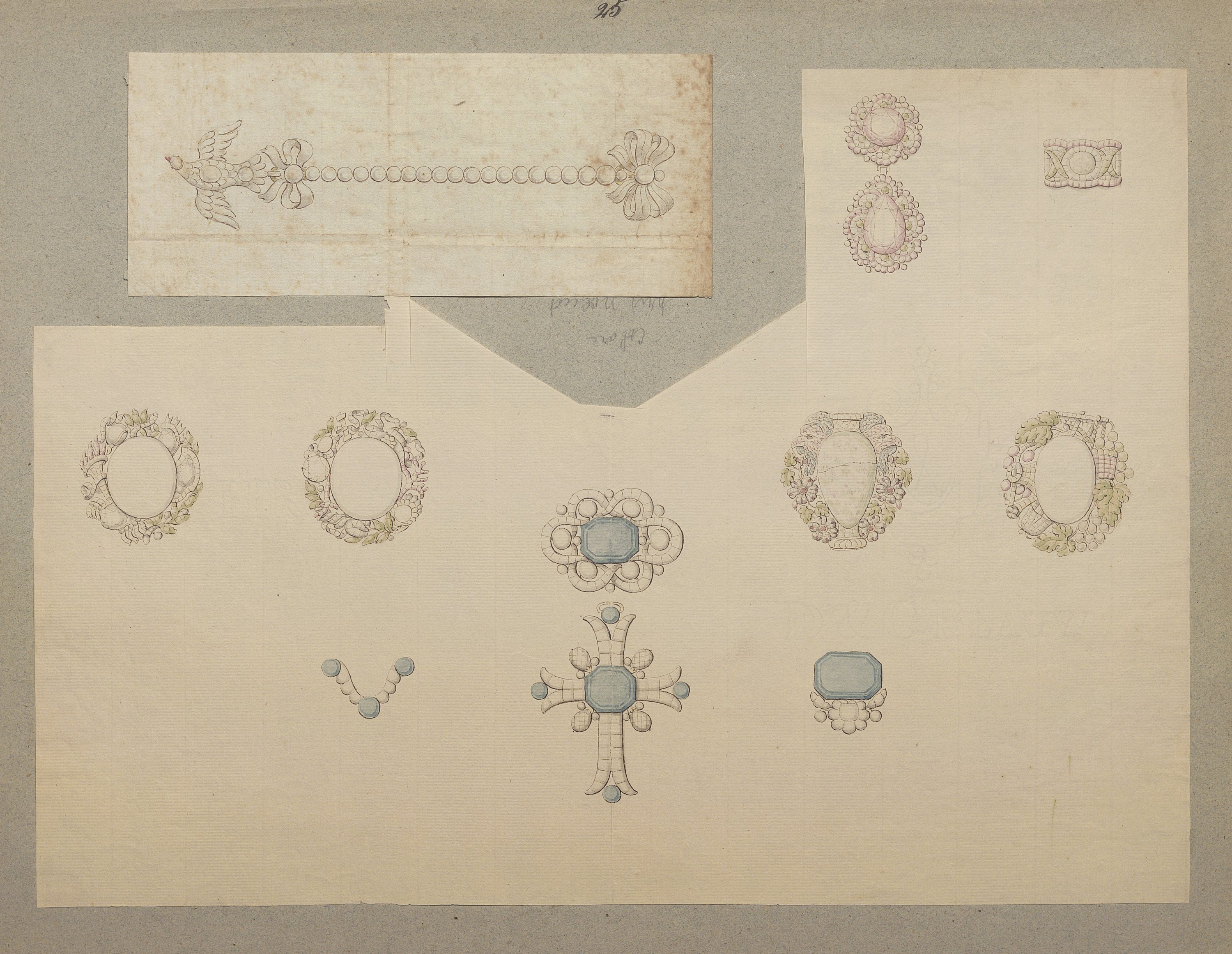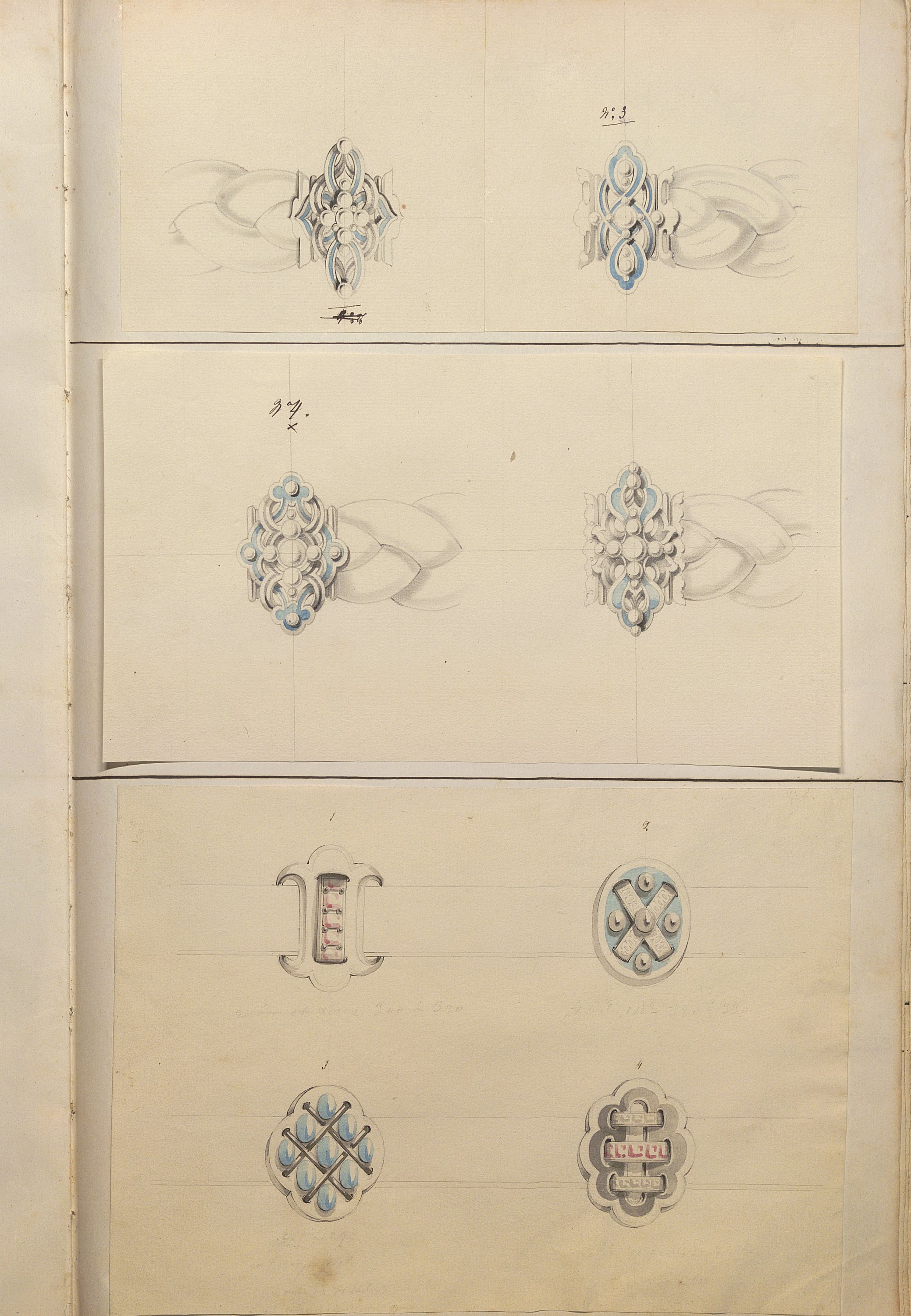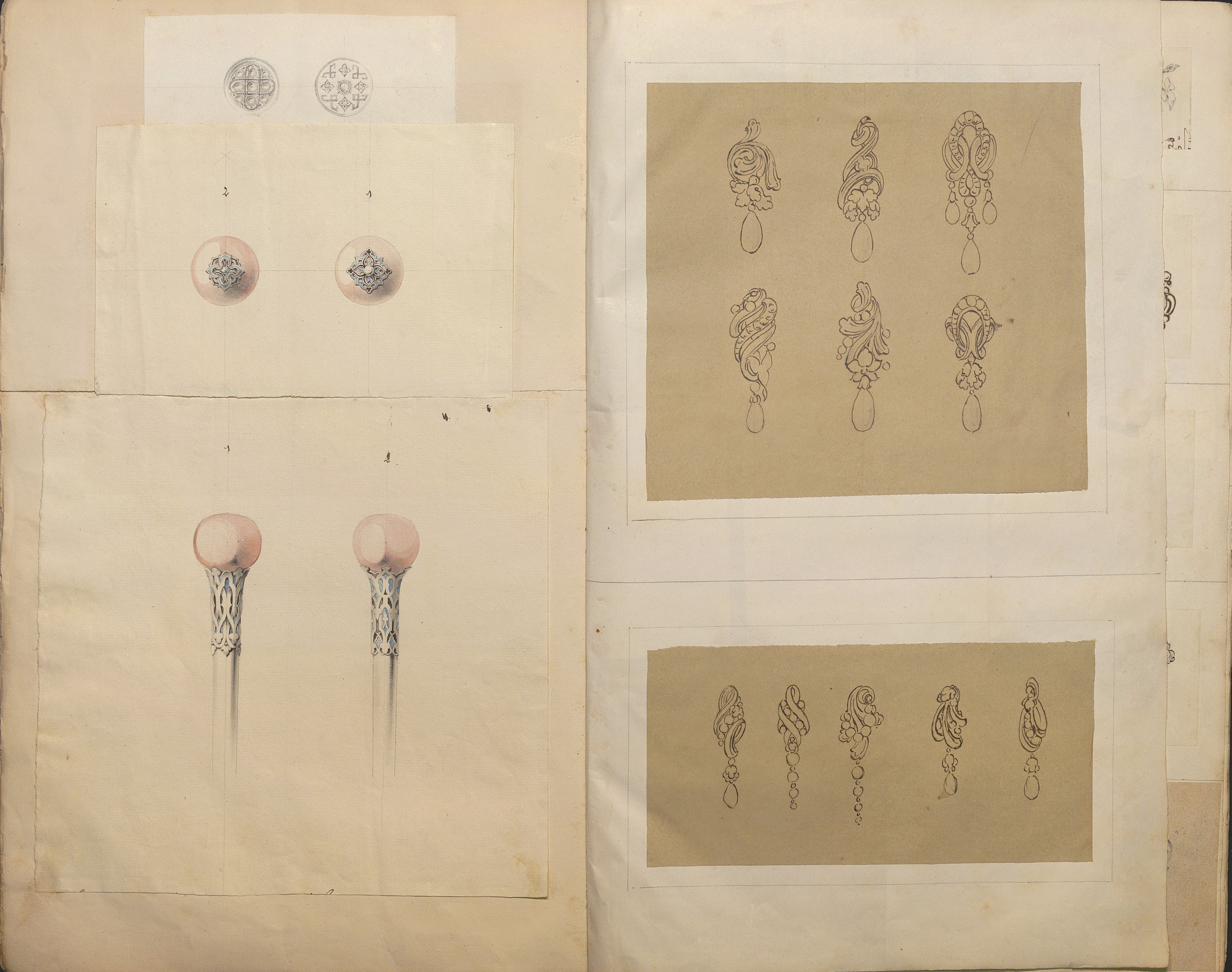 D’une grande richesse de modèles, ces centaines de dessins expriment l’esprit romantique et les orientations de l’art du temps: l’historicisme, l’orientalisme, le naturalisme raffiné. Les nombreuses planches sont consacrées aux modèles de broches (corsage, pendeloques, boutons, etc), diadèmes, bracelets-sautoirs démontrant l’extraordinaire faveur dont ces bijoux bénéficient, mais aussi cachets ou portes sceaux dont modèle pour la Dauphine (mars 1830), bagues, boucles d’oreille, colliers, coques de montre, croix, chiffres de Louis-Philippe roi des Français et de la Reine Marie-Amélie, du duc de Montpensier.