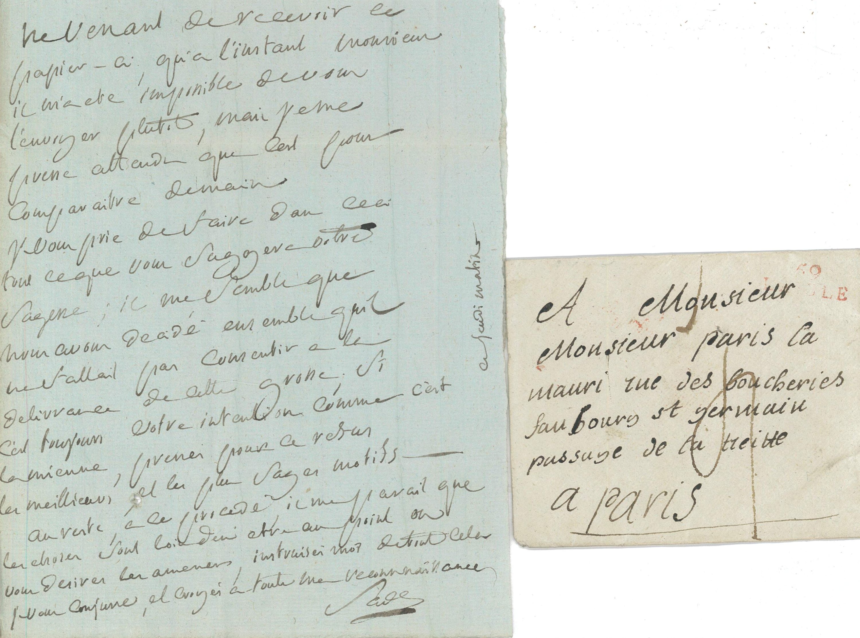« Comme vous m’avez dit monsieur que vous ne pouviez rien faire dans l’affaire du sieur Phélipeaux [Claude Paul Phélipeaux, écrivain et rentier parisien (1750-1806), époux de Jeanne Hay internée à l’asile de Charenton Saint Maurice] chez lequel ma bibliothèque est engagée et que ledit Phélipeaux veut faire vendre. J’ai tâché de m’arranger avec lui, j’ai besoin pour cela des papiers qui concernent cette affaire et surtout la sentence et du jugement vous m’obligerez sensiblement de vouloir bien les donner à la personne qui vous remettra la présente, j’en ai absolument besoin aujourd’hui. Il y a bien longtemps que je n’ai eu le plaisir de vous voir » + déclaration de procuration de Me Paris de Lamaury « qu’il est avoué à charge d’occuper et occupera pour Delle Constance Renelle épouse divorcée du sieur Quesnet [comédienne et dernière compagne du marquis de Sade] et le sieur Sade dts tous deux à Charenton St Maurice », 10 avril 1806, 1 page in-8 ;