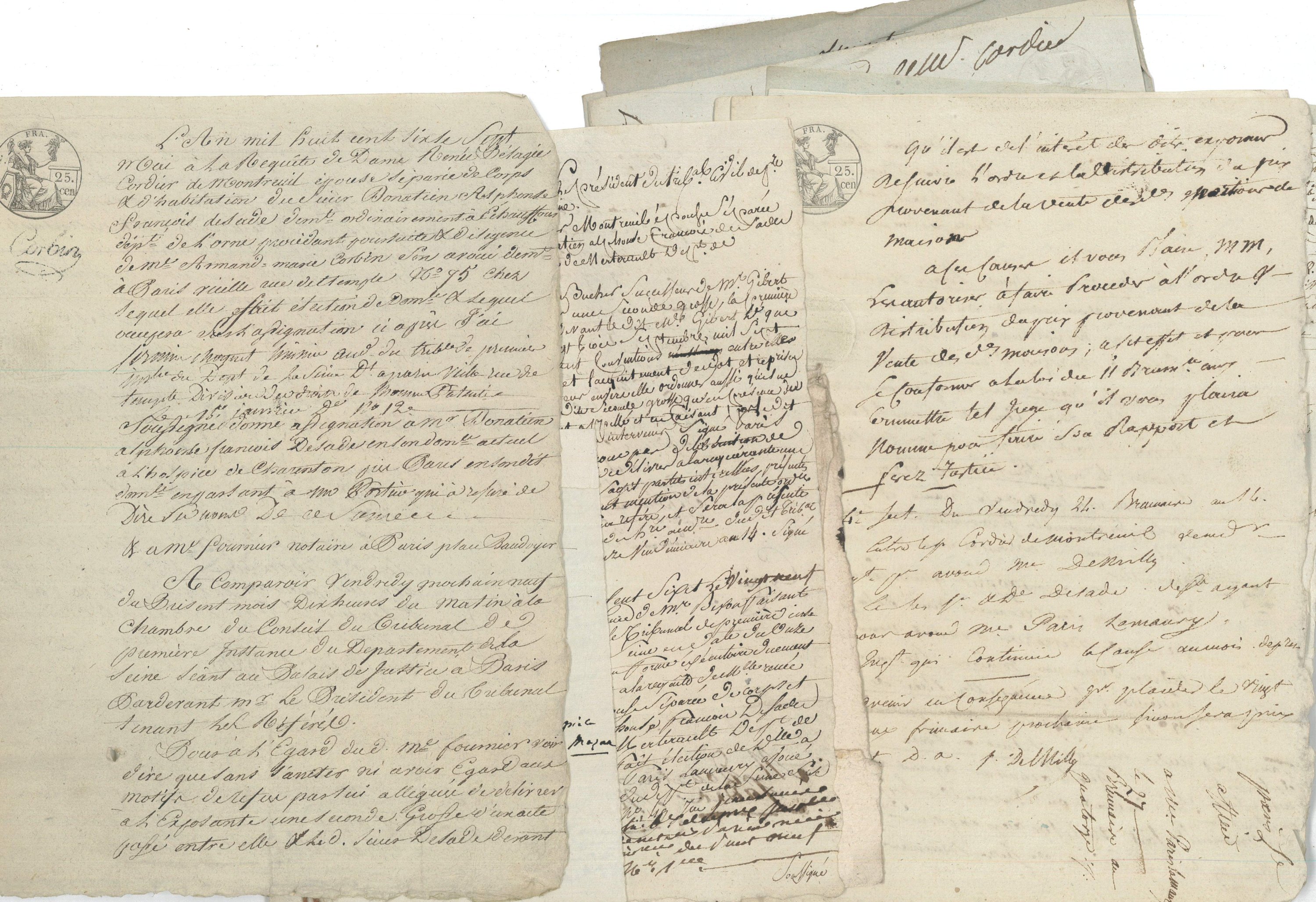 « Ne venant de recevoir ce papier-ci, qu’à l’instant monsieur, il m’a été impossible de vous l’envoyer plutôt, mais je me presse attendu que c’est pour comparaitre demain. Je vous prie de faire dans ceci tout ce que vous suggère votre sagesse ; il me semble que nous avons décidé ensemble qu’il ne fallait pas consentir à la délivrance de cette grosse. Si c’est toujours votre intention comme c’est la mienne, prenez pour ce refus les meilleurs et les plus sages motifs » + acte de comparution adressé à « M. Donatien Alphonse François de Sade à la maison de santé établie à Charenton St Maurice », 7 mai 1806, relatif à la délivrance réclamée par Renée Pélagie Cordier de Montreuil épouse séparée de corps et d’habitation du marquis de Sade, de la copie d’un acte passé par eux devant Gibert l’aîné le 23 septembre 1790, 2 pages in-8 + 14 pièces manuscrites diverses relatives à cette affaire ;