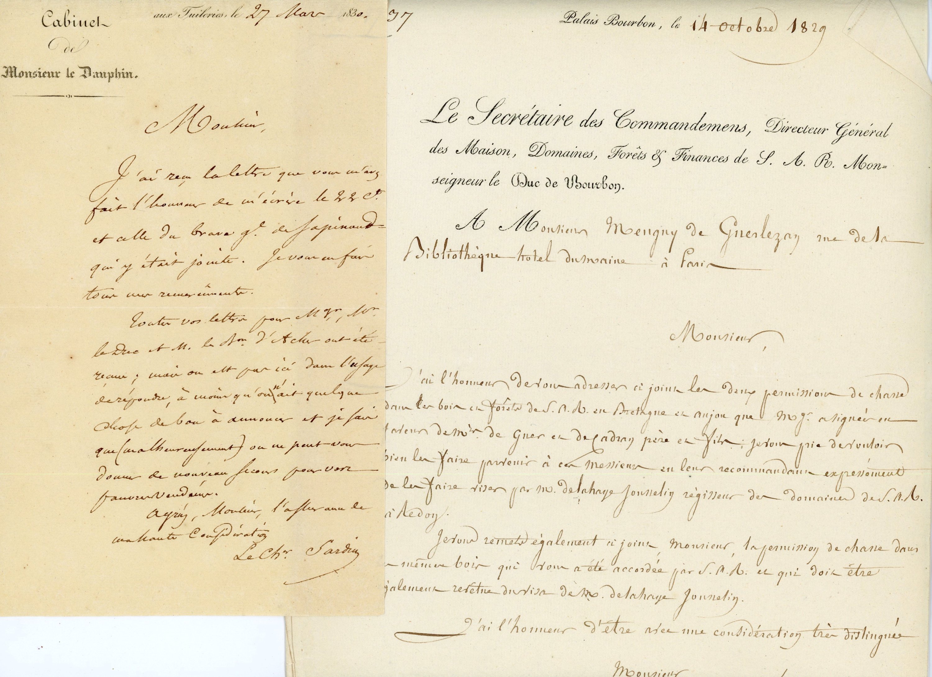 Réunion de + de 95 L.A.S. et L.S., 1820-1838, adressées à Joseph-Marie Menguy de Guerlezan, formats divers, en provenance des nombreux cabinets ministériels et des maisons princières (Dauphin et Dauphine, duc de Bordeaux, d’Orléans et de Bourbon), répondant aux demandes de secours et de sollicitations de placement, dont: