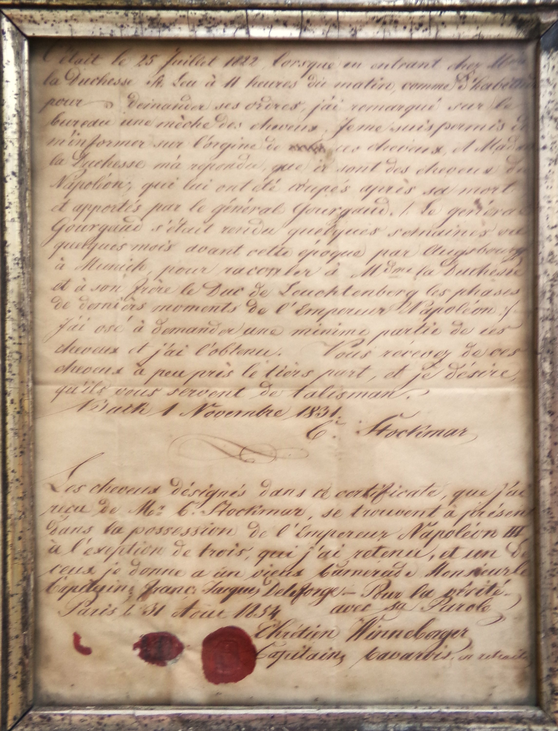 Les cheveux désignés dans ce certificate que j’ai reçu de M. C. Stockmar, se trouvent à présent dans la possession de l’empereur Napoléon III à l’exception de trois, que j’ai retenu et un de ceux je donne à un vieux camarade monsieur le capitaine Franc. Jacques Delaforge. Pour la vérité avec sa parole. Paris, 31 août 1854, Chrétien Winneberger » avec cachets de cire rouge.