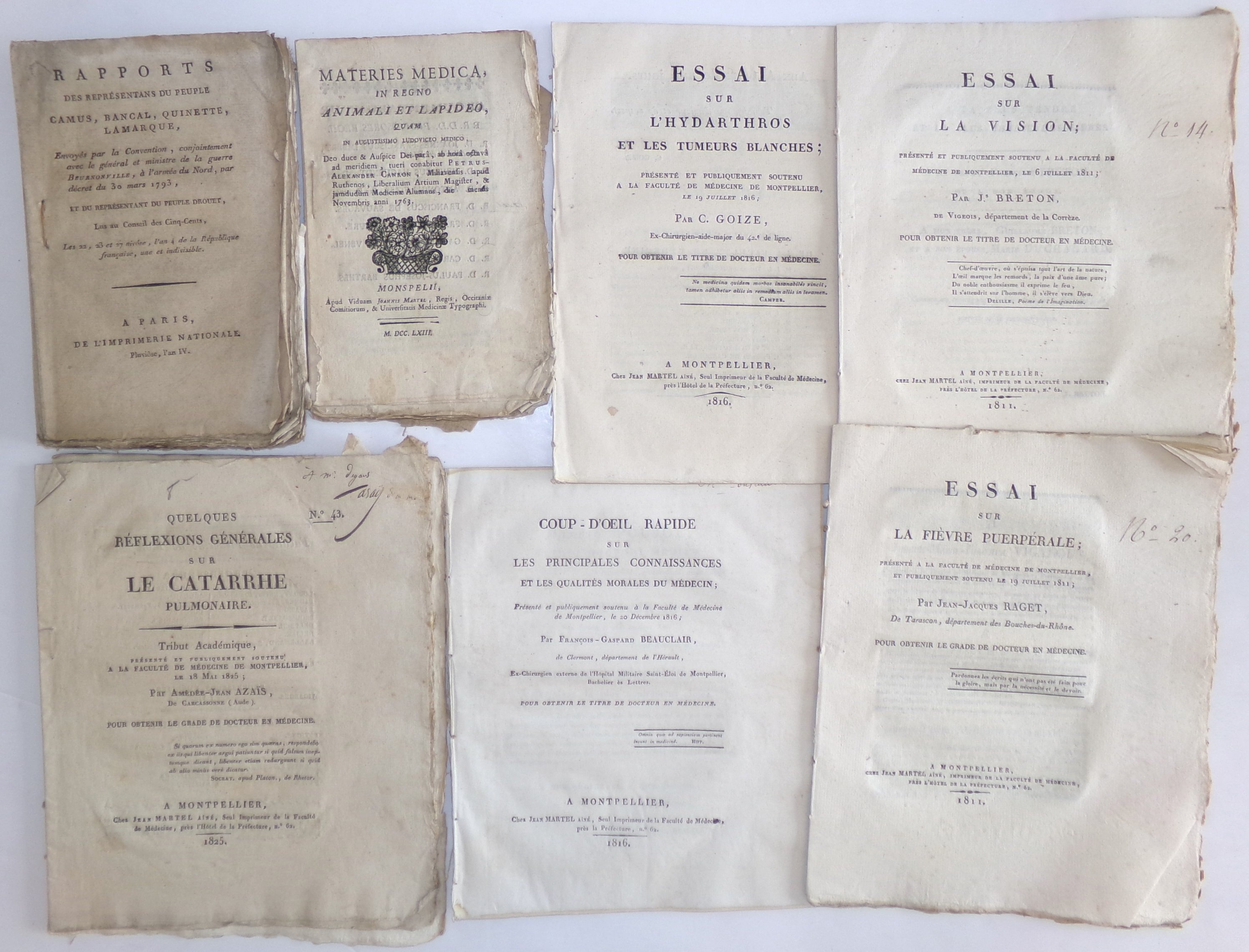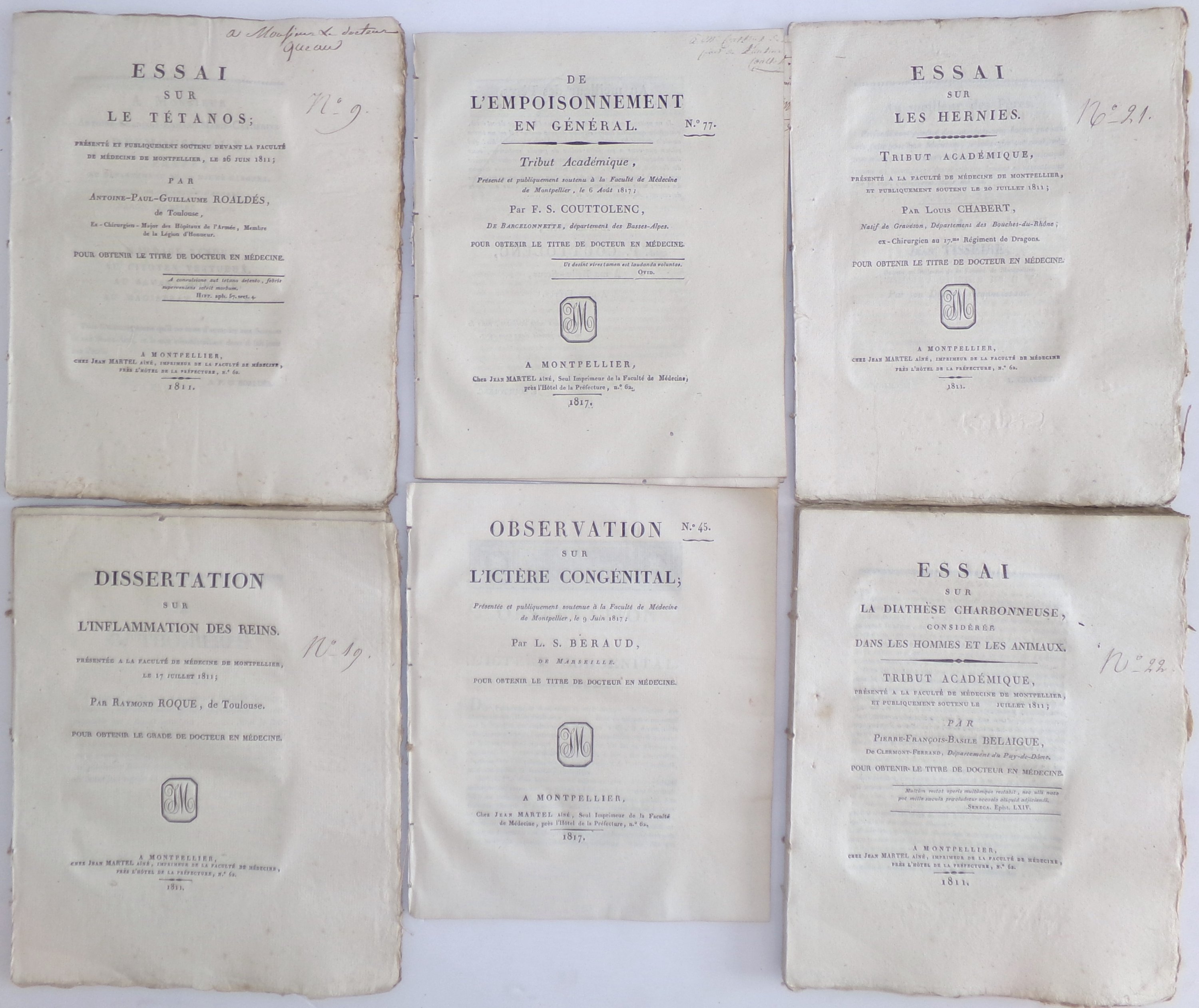 Essai sur l’étude des épidémies par Saint-Laurens, Montpellier, 1811 ; Des convulsions ou mouvemens convulsifs par Lestrade, Montpellier, 1811 ; Essai sur la diathèse charbonneuse par Belaigue, Montpellier, 1811 ; Essai sur les herniers par Chabert, Montpellier, 1811 ; Observation sur l’ictère congénital par Béraud, Montpellier, 1817 ; Essai médico-chirurgical sur la névroprosopalgie par Roux, Montpellier, 1817 ; de l’empoisonnement en général par Couttolenc, Montpellier, 1817 ; Dissertation sur la chlorose par Audemard, Montpellier, 1811 ; Dissertation sur l’inflammation des reins par Roque, Montpellier, 1811 ; Essai sur le tétanos par Roaldès, Montpellier, 1811 ; Essai sur la fièvre puerpérale par Raget, Montpellier, 1811 ; Essai sur la vision par Breton, Montpellier, 1811 ; Essai sur l’hydarthros et les tumeurs blanches par Goize, Montpellier, 1816 ; Coup d’œil rapide sur les principales connaissances et les qualités morales du médecin par Beauclair, Montpellier, 1816 ; Considérations générales sur la chaleur animale par Thune, Montpellier, 1811 ; Quelques réflexions sur le catarrhe pulmonaire par Azaïs, Montpellier, 1825 ; Considérations sur la vieillesse par Seguin, Montpellier, 1816 ; Considérations sur l’asphyxie par submersion par Sauzet, Montpellier, 1817.