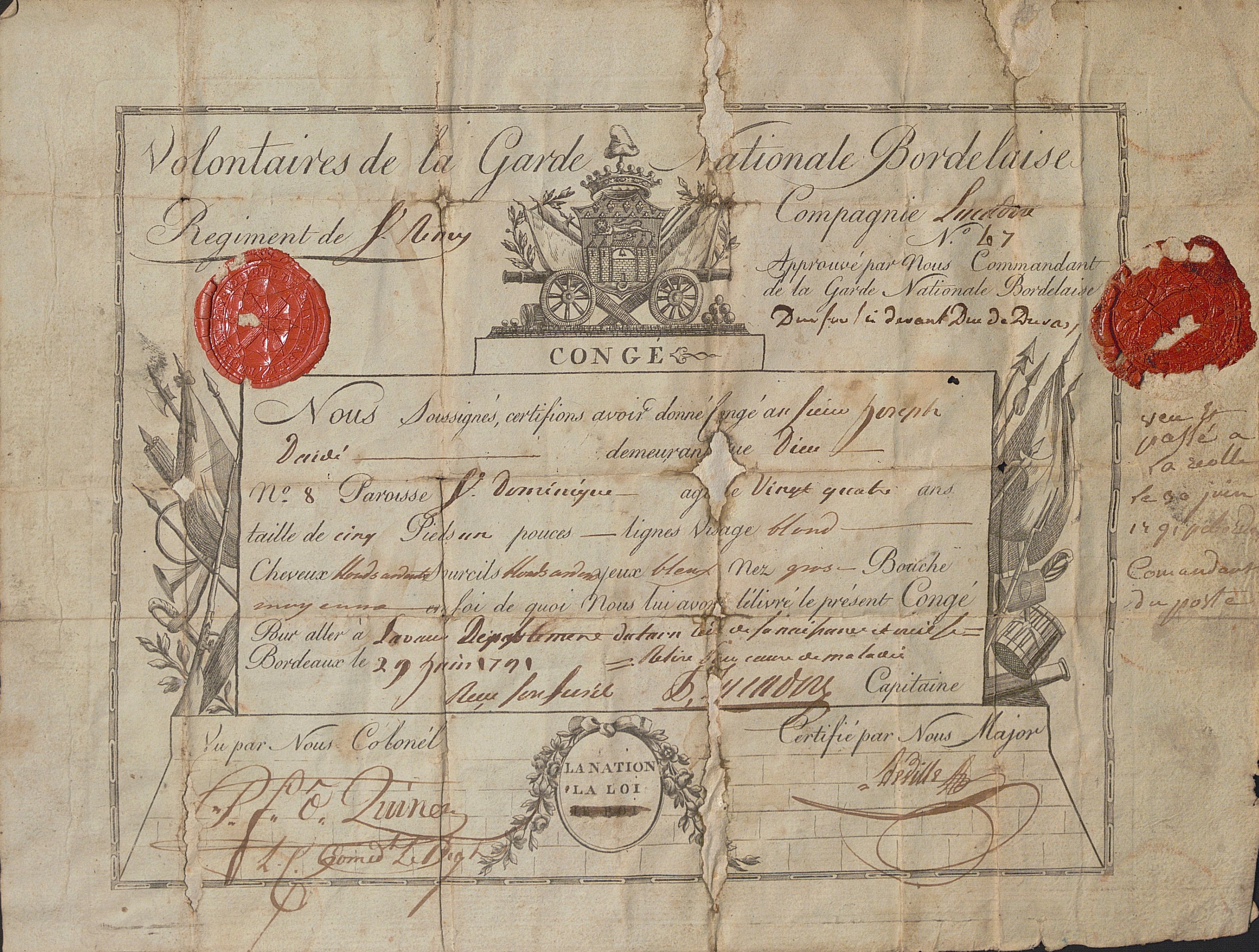 Congé militaire de la garde nationale bordelaise, 1791 ;