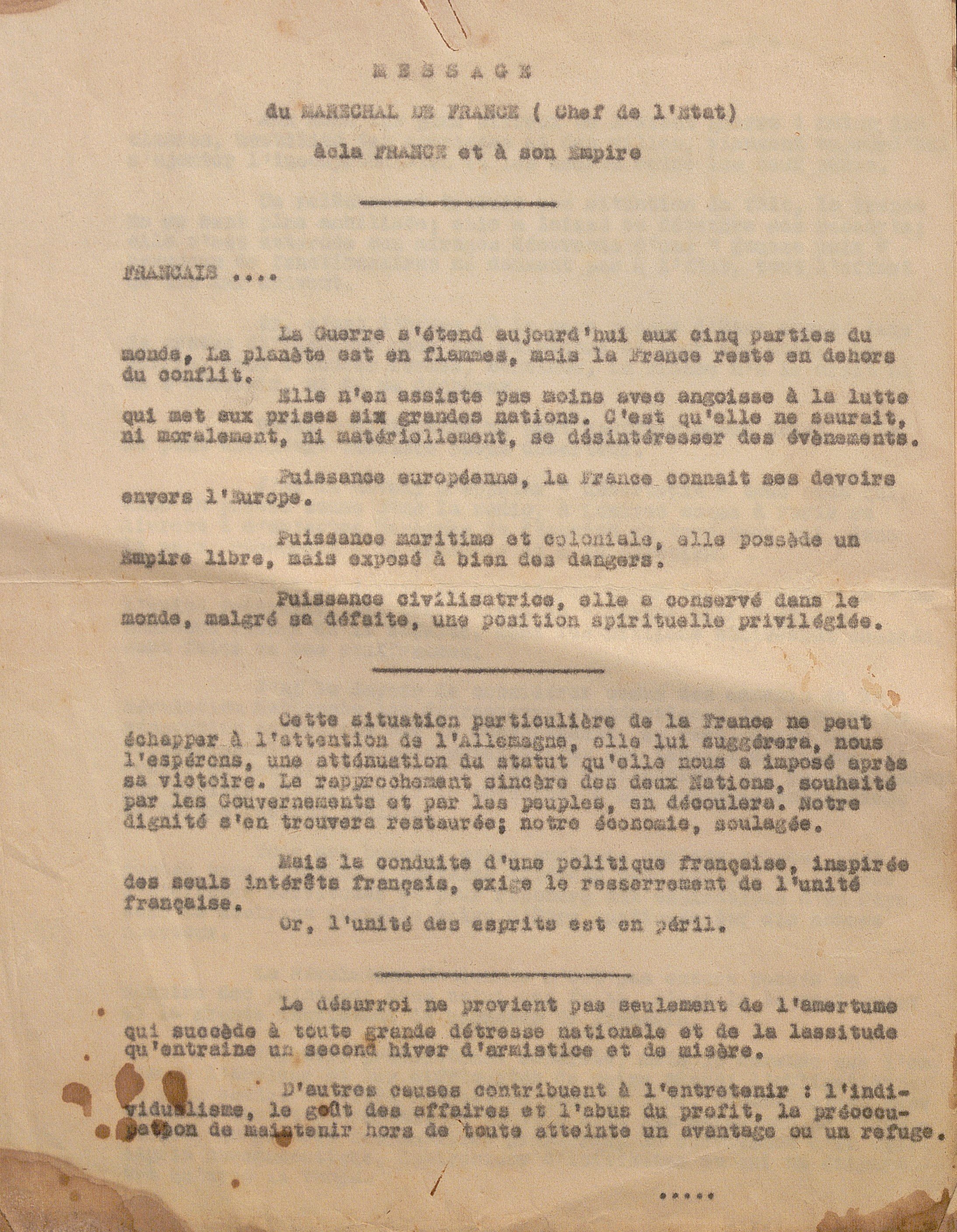 Message du maréchal Philippe Pétain, 1er janvier 1942, tapuscrit, de 5 pp. in-4 ;