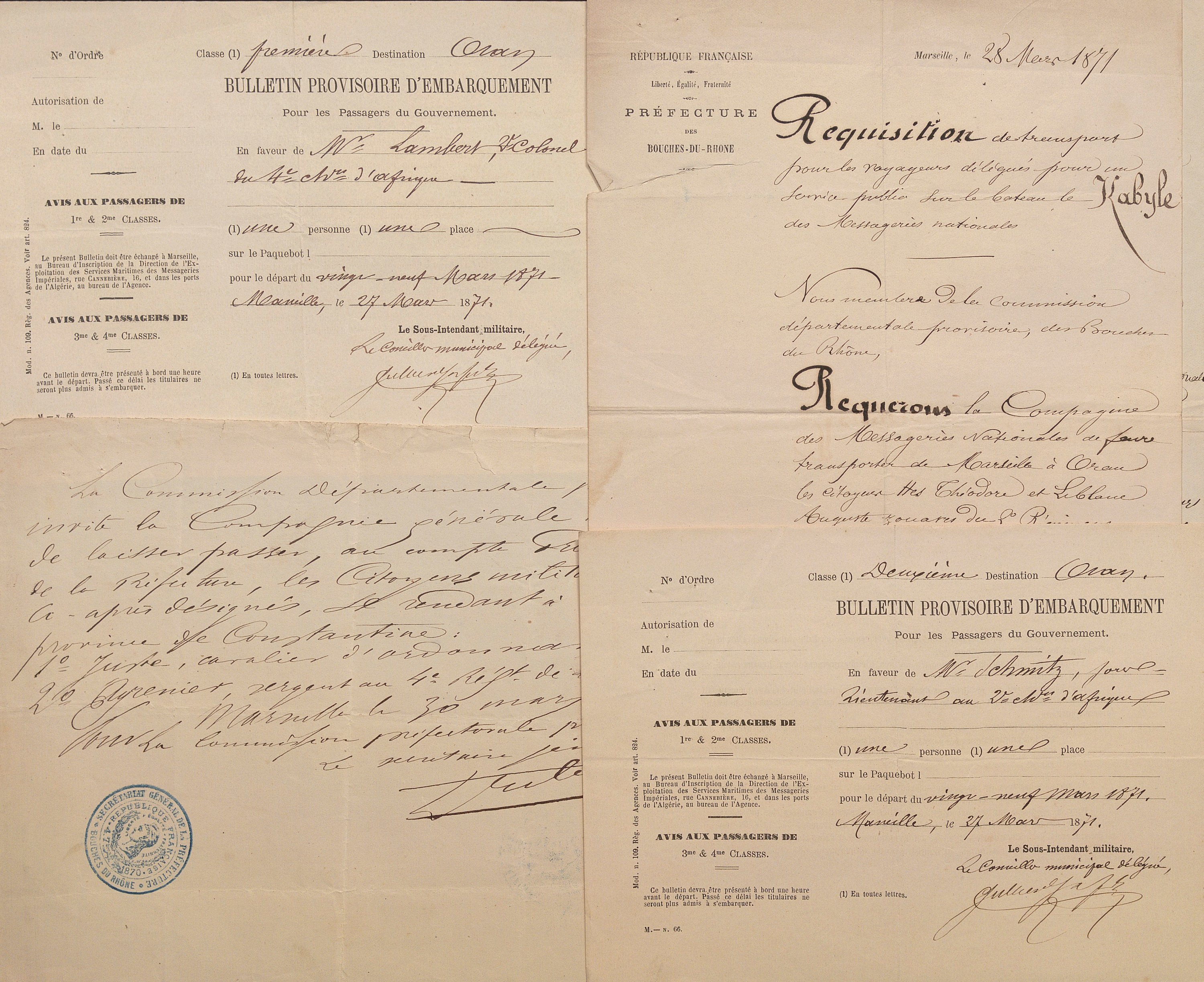 3 réquisitions de transport maritime et 2 bulletins provisoire d’embarquement, Marseille, mars 1871, à destination d’Oran ;