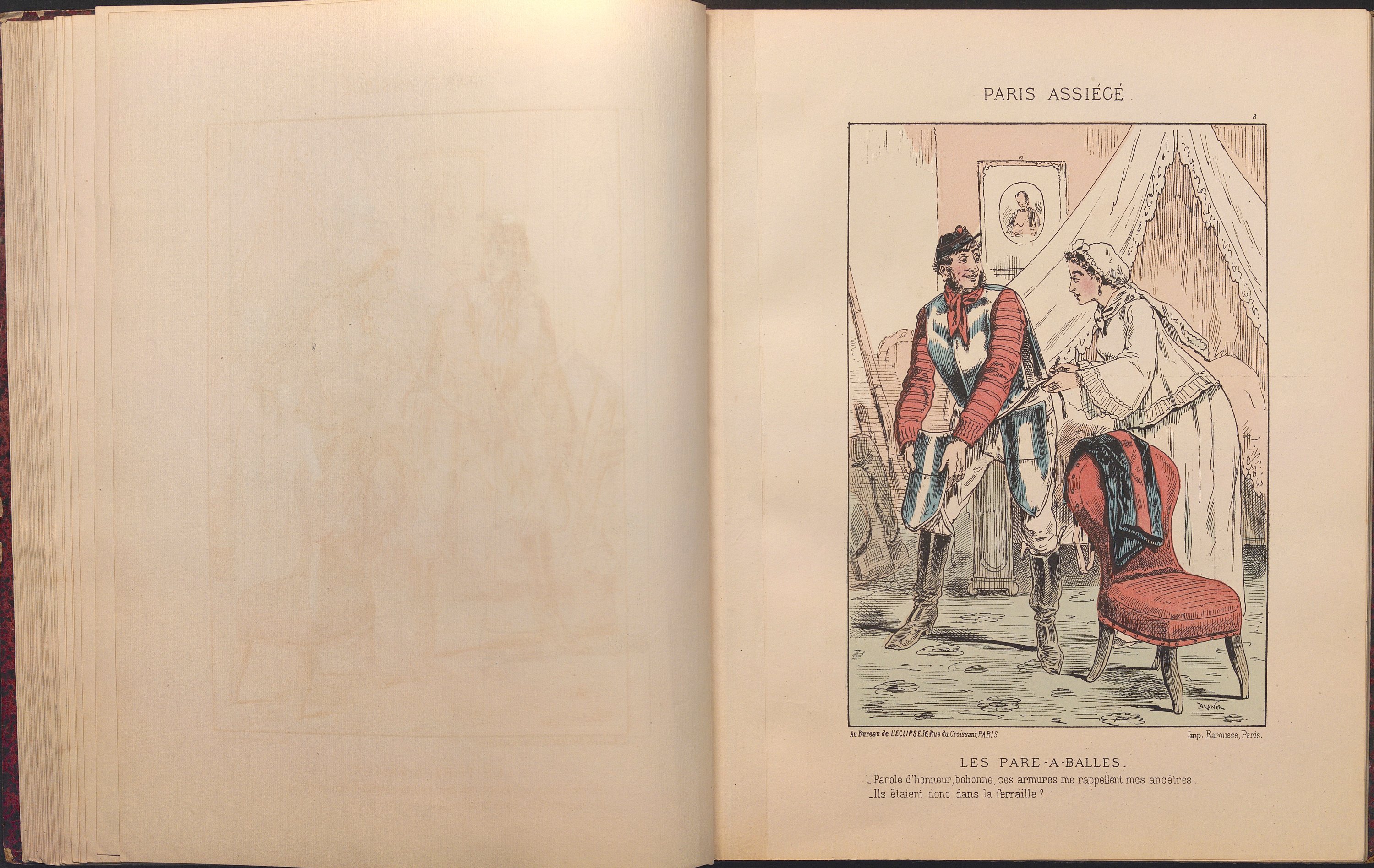 Jules Renard dit Draner (1833-1890), Souvenirs du Siège de Paris. Les Défenseurs de la Capitale. [Suivi de] Paris assiégé. Vie parisienne. [Suivi de] Les Soldats de la République. L'Armée française en Campagne.? Paris, Au Bureau de L'Eclipse, [1871-1872]. In-4 rel. ½ chagr. rouge, 2 ff. (titre) et 31 pl., 2 ff. (titre) et 31 pl.- 2 ff. (titre) et 31 pl. Complet des 96 pl. en couleurs montées sur onglets (qqs rouss., rest. à 1 pl.) B.E. à T.B.E.