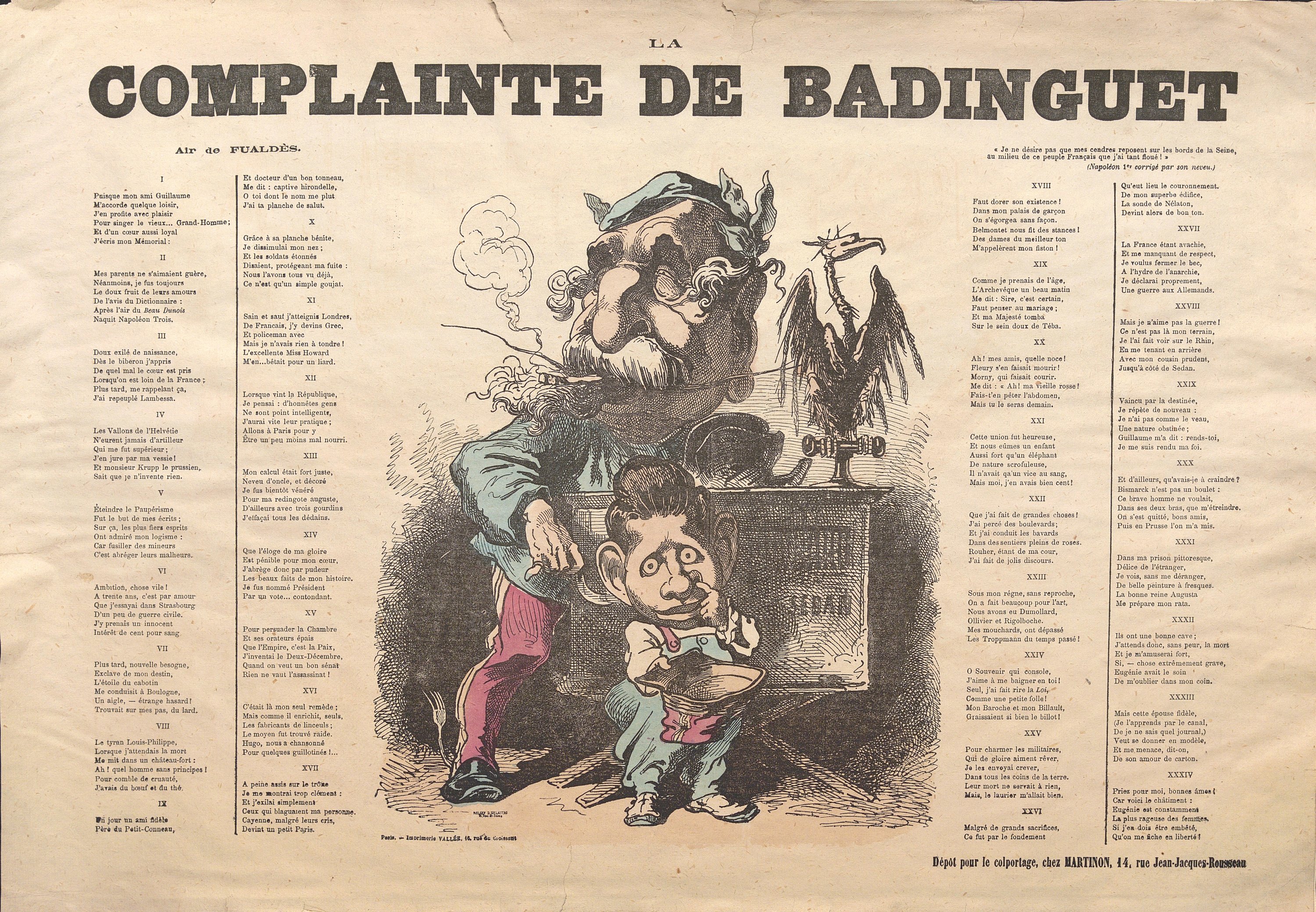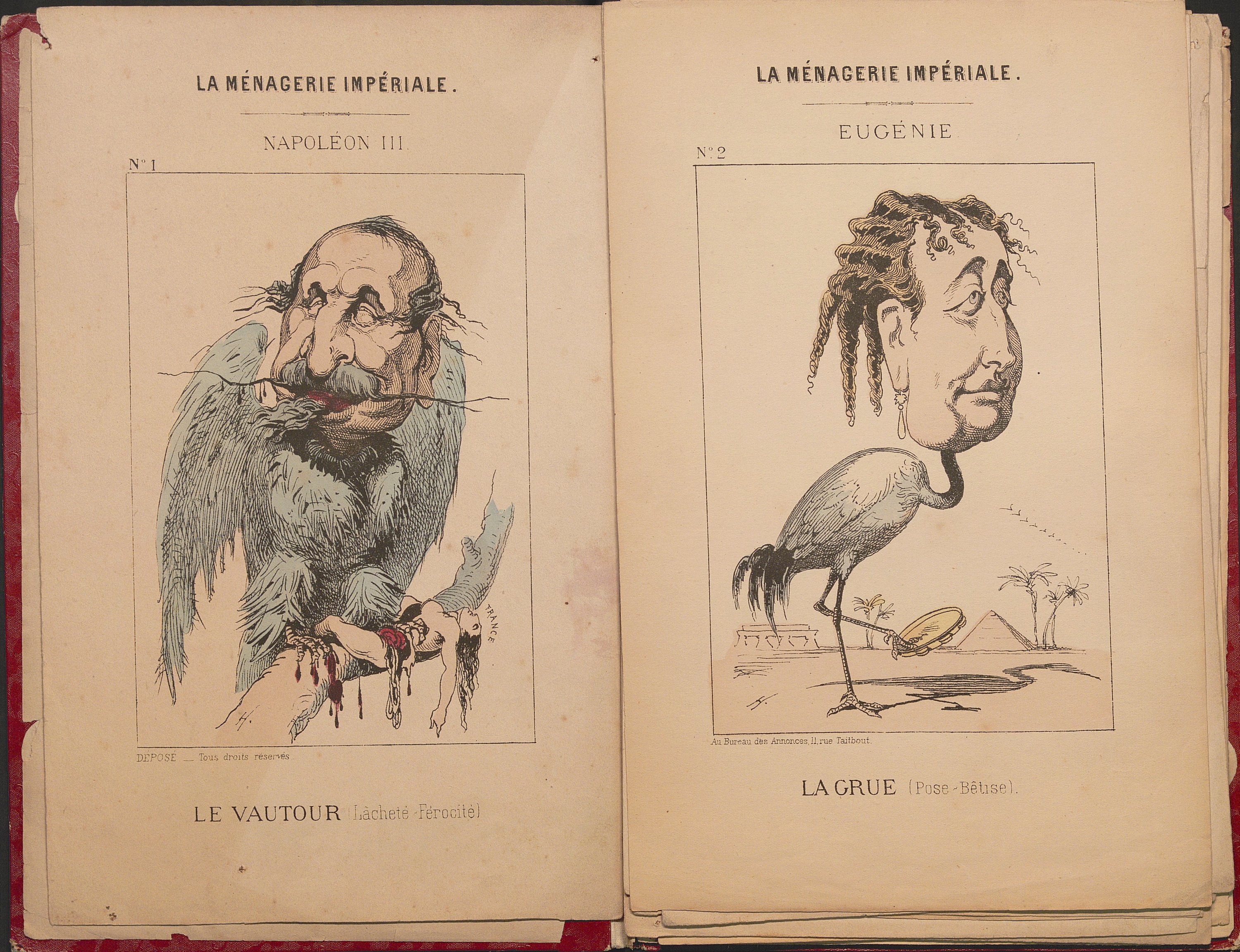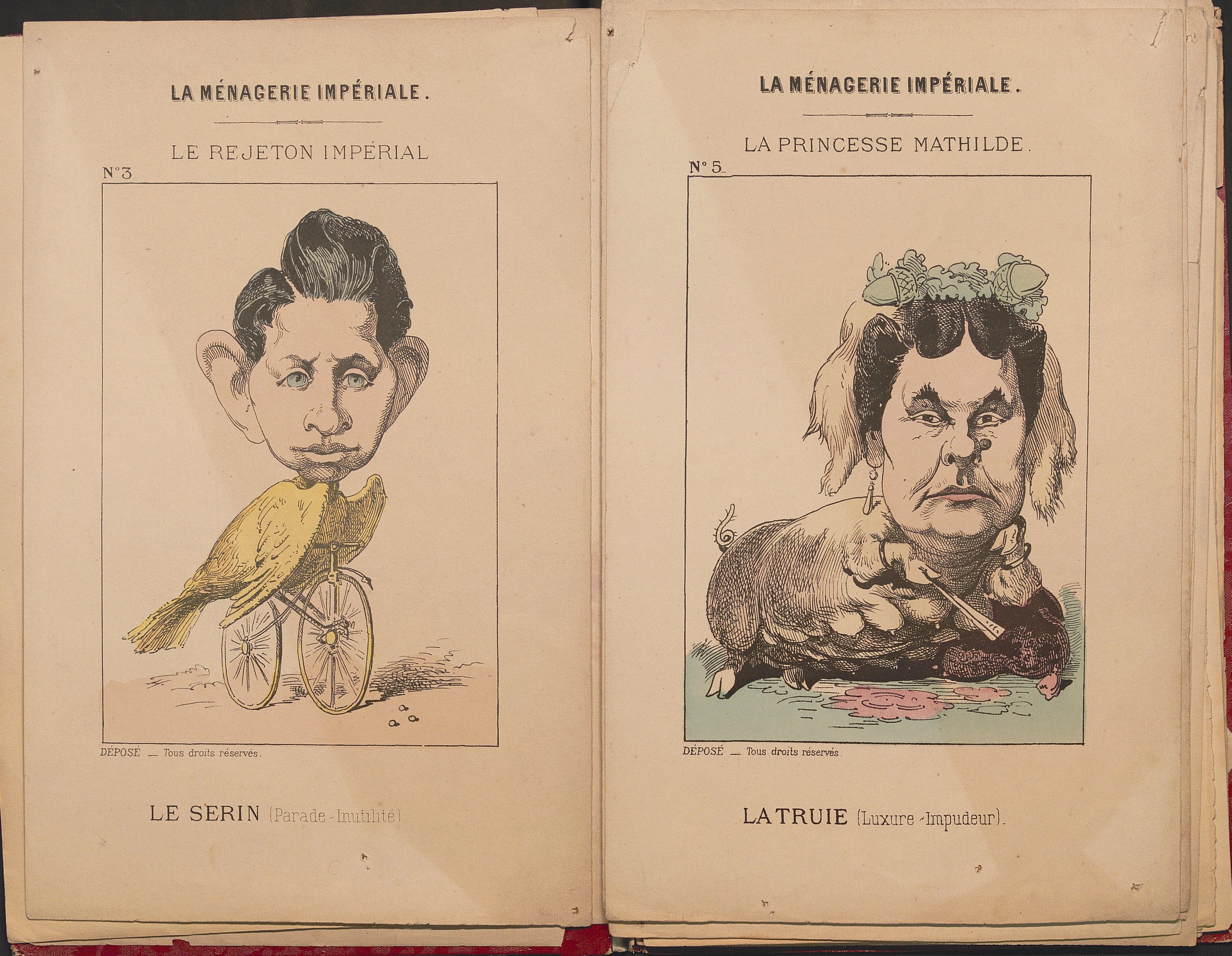 Paul Hadol (1835-1875): Nouvelle Carte d'Europe dressée pour 1870. Célèbre carte d'Europe satirique et anthropomorphe pour l'année 1870 Lithographie sur papier vélin à rehauts de couleurs d’époque, impr. par Vallée, 16 rue du Croissant à Paris, toutes marges, 43,5 x 61,5 cm (rest. avec perte de quelques mots dans la légende) ; La complainte de Badinguet [chanson], 34 x 48 cm (petits défauts) ; Série La Ménagerie impériale, incomplet, 23 n°/31, formats et états divers.