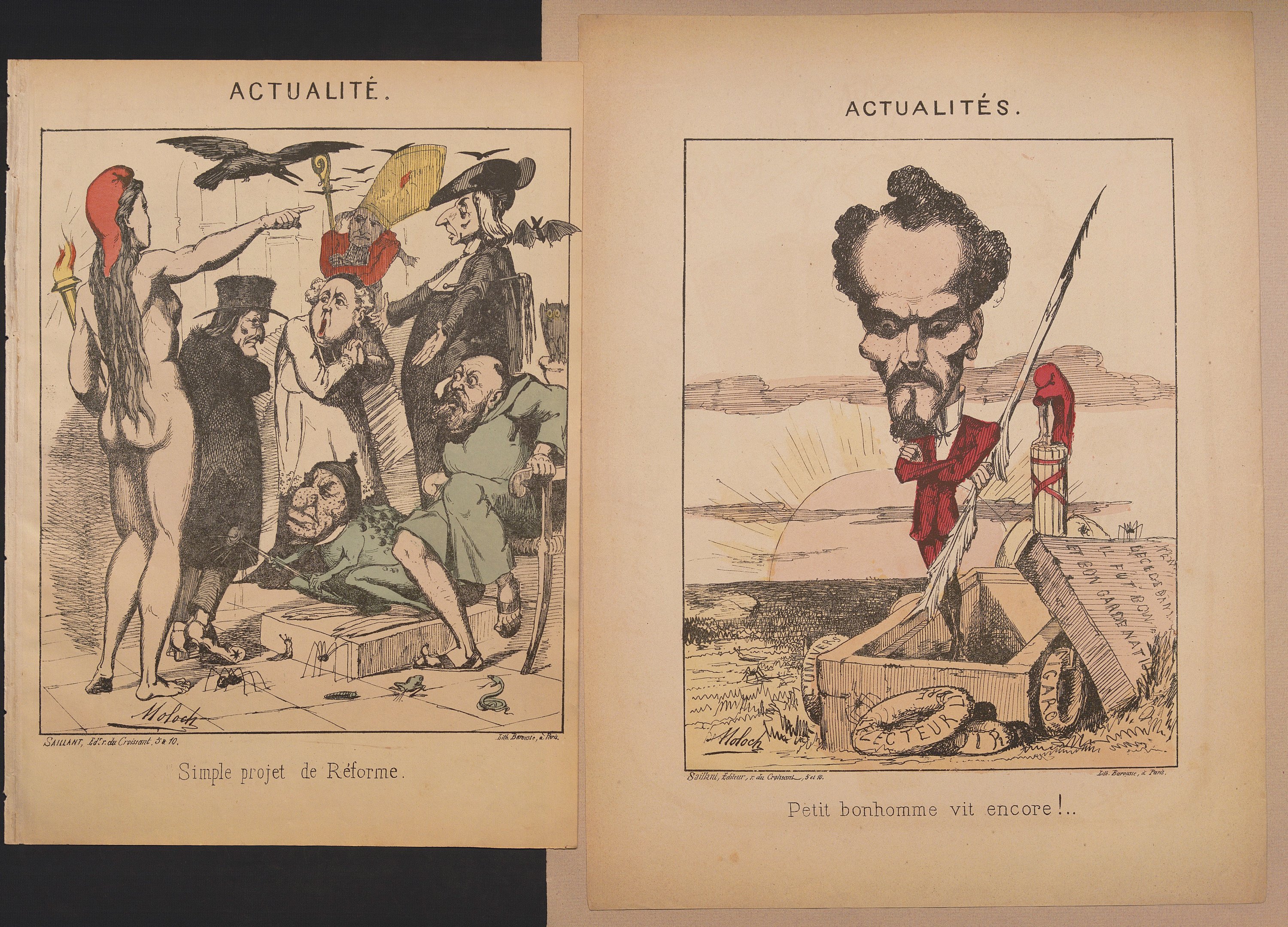 Réunion de 80 lithographies: Série Actualités, 7 pl. (sur 8), env. 34 x 27 cm ; Joli cadeau fait à la Prusse!, en N&B, 33,5 x 25 cm (petits déf.) ; Ses maitresses!, 33,5 x 26,5 cm ; Les binettes du jour n°1, 33,5 x 27 cm ; Hommes politiques, Vox populi, vox démolie!!, 34 x 27 cm ; Hommes d’état, La grande colère du père Jules Bavre, 36 x 27 cm ; série Les Prêtres, n°1 au n°27 (mque 18, 26, 28 et 29), formats et petits déf. divers, certains contrecollés sur feuillet ; série Paris dans les caves, n°1 à 8 et n°11 (sur 39), 34,5 x 26 cm ; série Les Silhouettes de 1871, n°4 à 9, 13-14, 18-20 (sur 26), en majorité 35 x 26,5 cm (petits déf.) ; Badingoscope n°7, en N&B, 33,5 x 28 cm ; série Les Fils de Cerbère, n°8, 10, 12, 14 et 16 (sur 19), 35,5 x 27 cm ; série L.L. Ex. Ex. les Automédons, page de titre, n°2-5, 8-10, 12-19, 24 (sur 24), 34,5 x 27,5 cm (petits déf.).