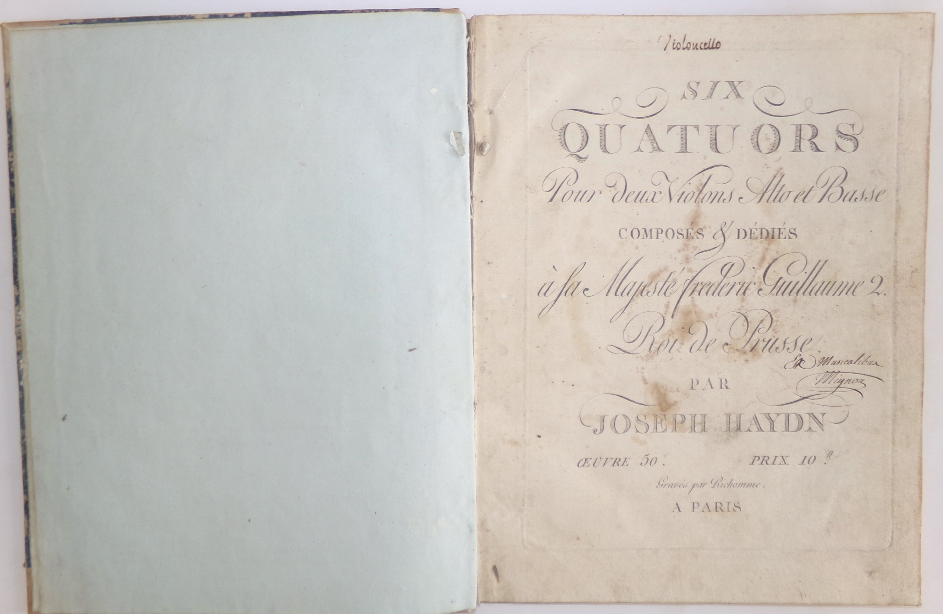 (1 vol.) Six quatuors pour deux violons alto et Basse composés & dédiés à Sa Majesté Frédéric Guillaume 2 Roi de Prusse par Joseph Haydn. Paris, Richomme. Œuvre 50. [Violoncello] 29 et 19 pp. ;