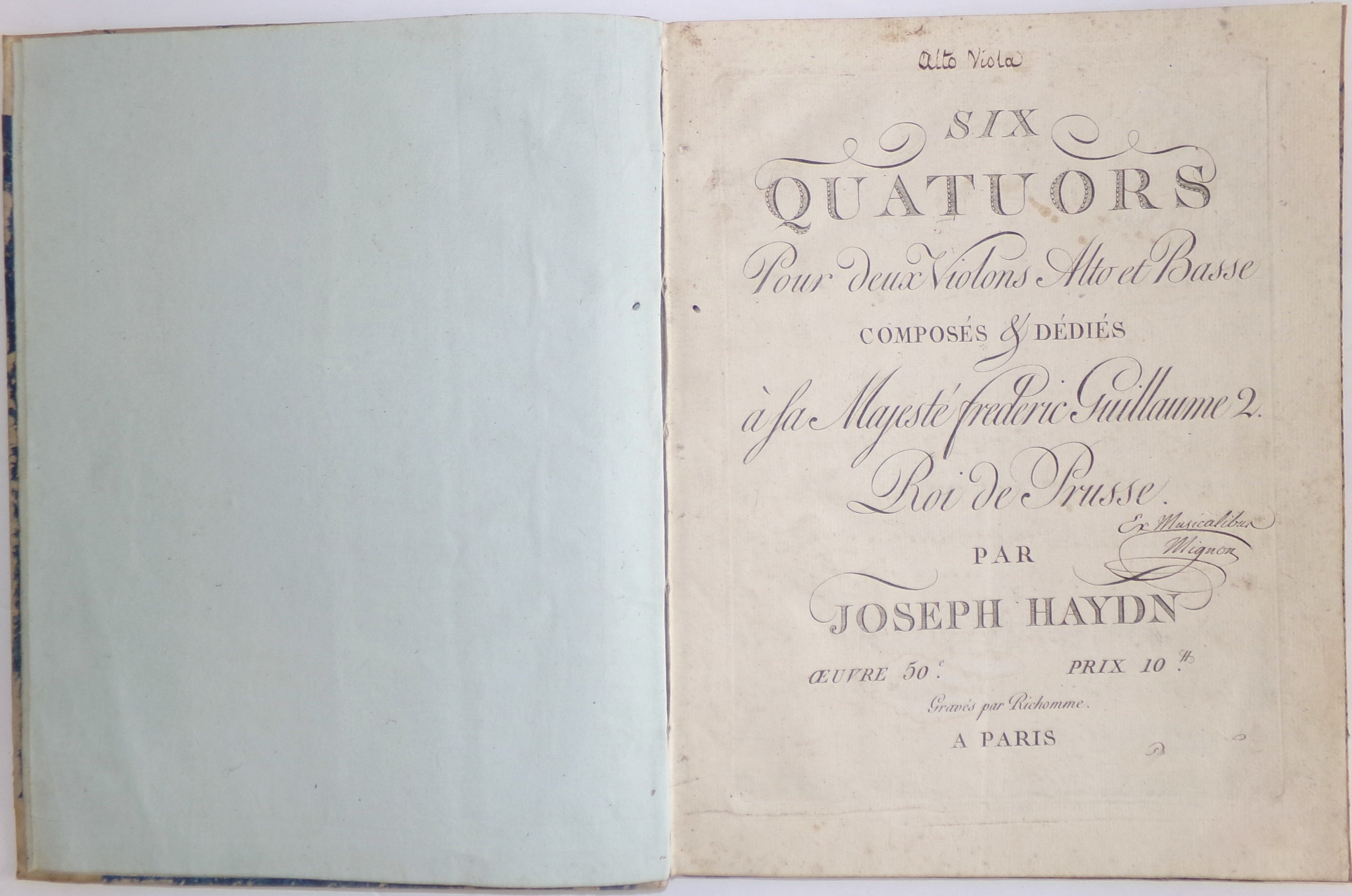 (1 vol.) Six quatuors pour deux violons alto et Basse composés & dédiés à Sa Majesté Frédéric Guillaume 2 Roi de Prusse par Joseph Haydn. Paris, Richomme. Œuvre 50. [Viola] 31 et 19 pp.