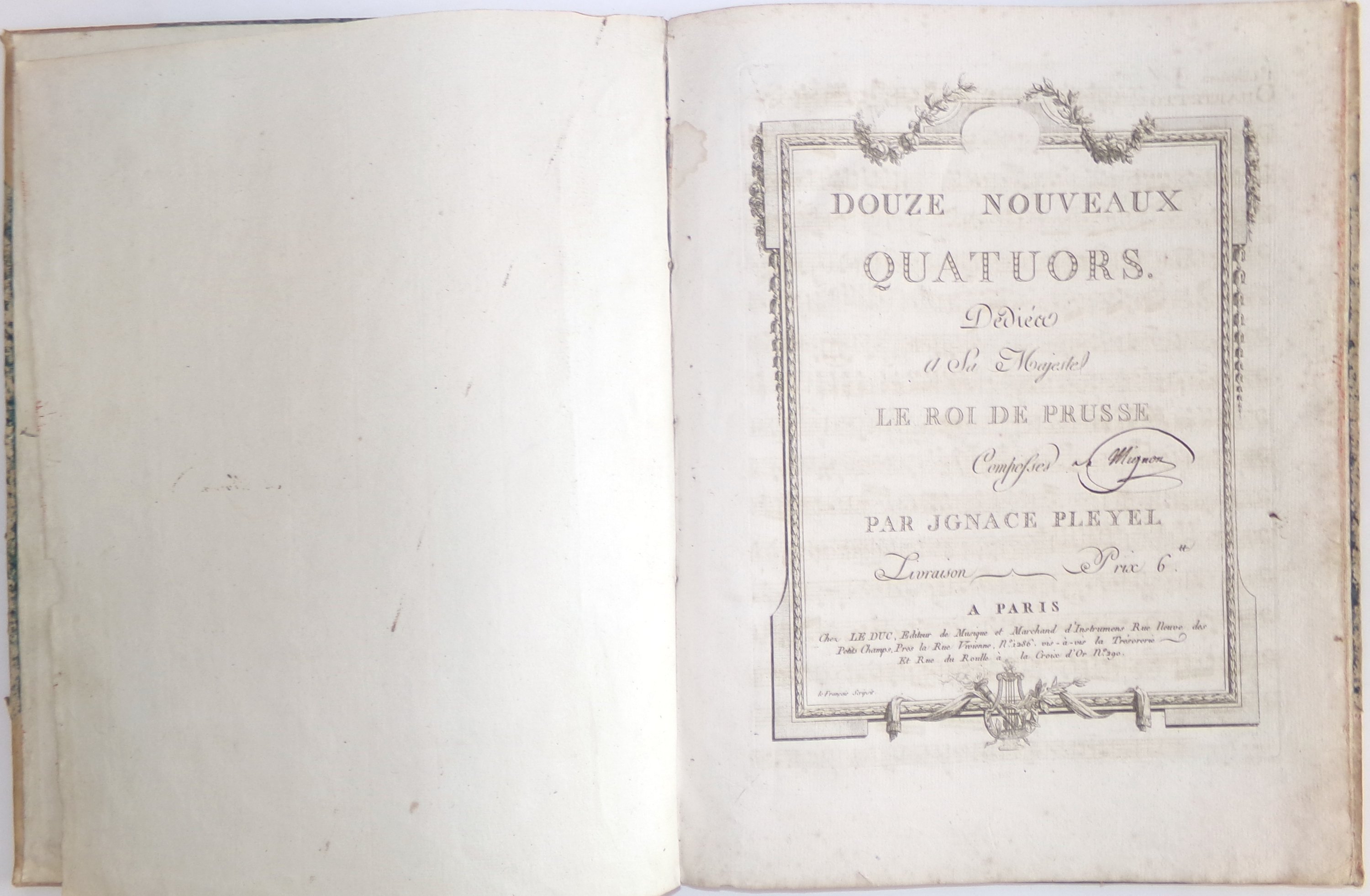 (1 vol.) Douze nouveaux quatuors dédiés à Sa Majesté le Roi de Prusse composés par Ignace Pleyel, [pour basso]. Paris, chez Le Duc éditeur de musique. 10 pp. ; suivi de Six quatuors concertants pour deux violons Alto et Basso composés et dédiés à Sa Majesté le Roy de Naples par Ferd. Fraenzl le fils élève de M. Pleyel / Oeuvre 1, 1 partie (Violoncello]. Paris, chez Sieber musicien. 8 pp. ;