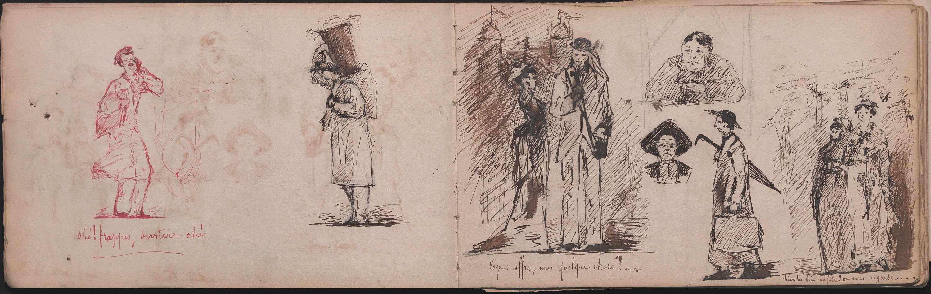 Carnet de dessins à la mine de plomb et à la plume, 13 x 21 cm, personnages et scènes parisiennes, milieu du 19e siècle.