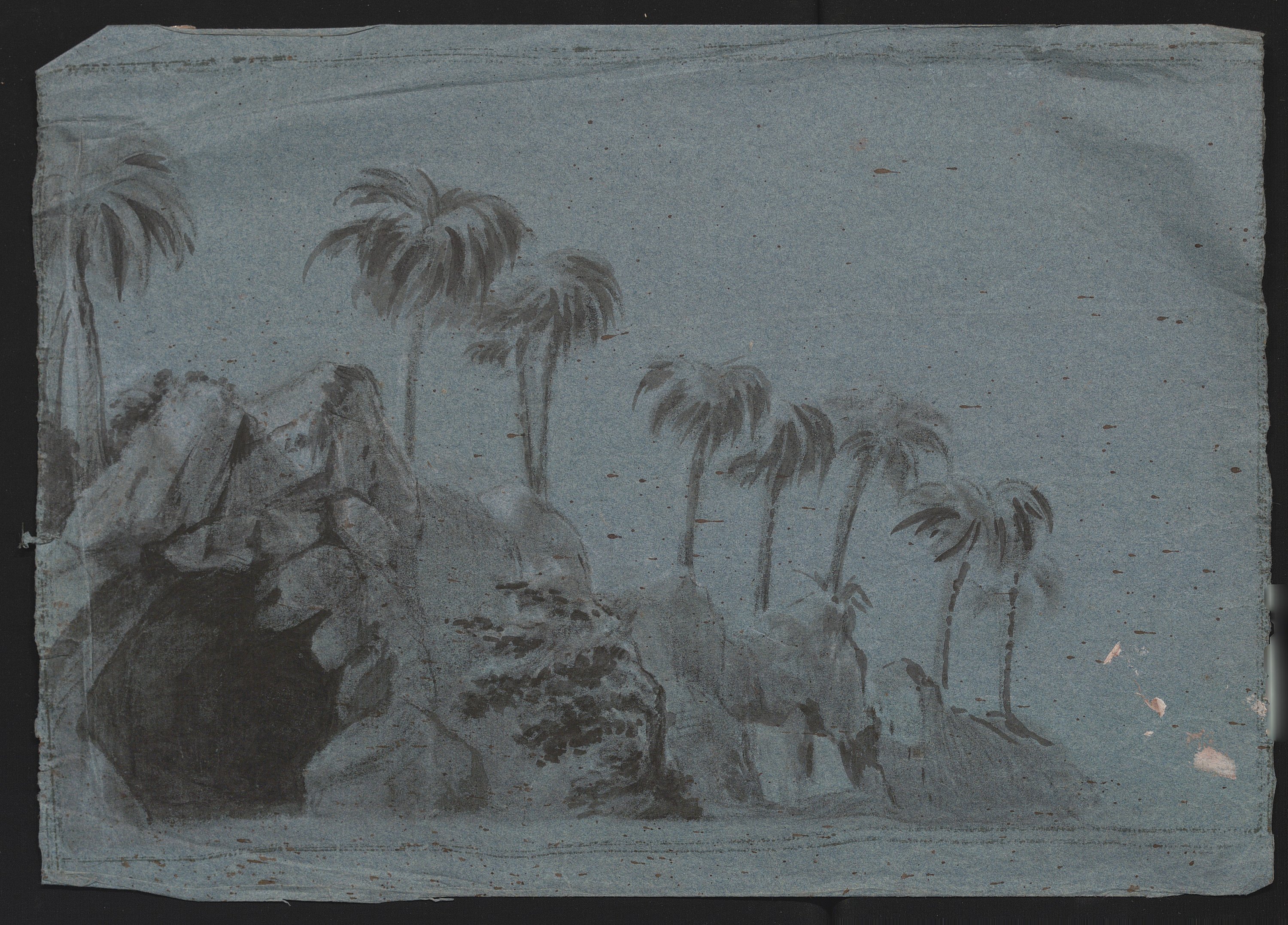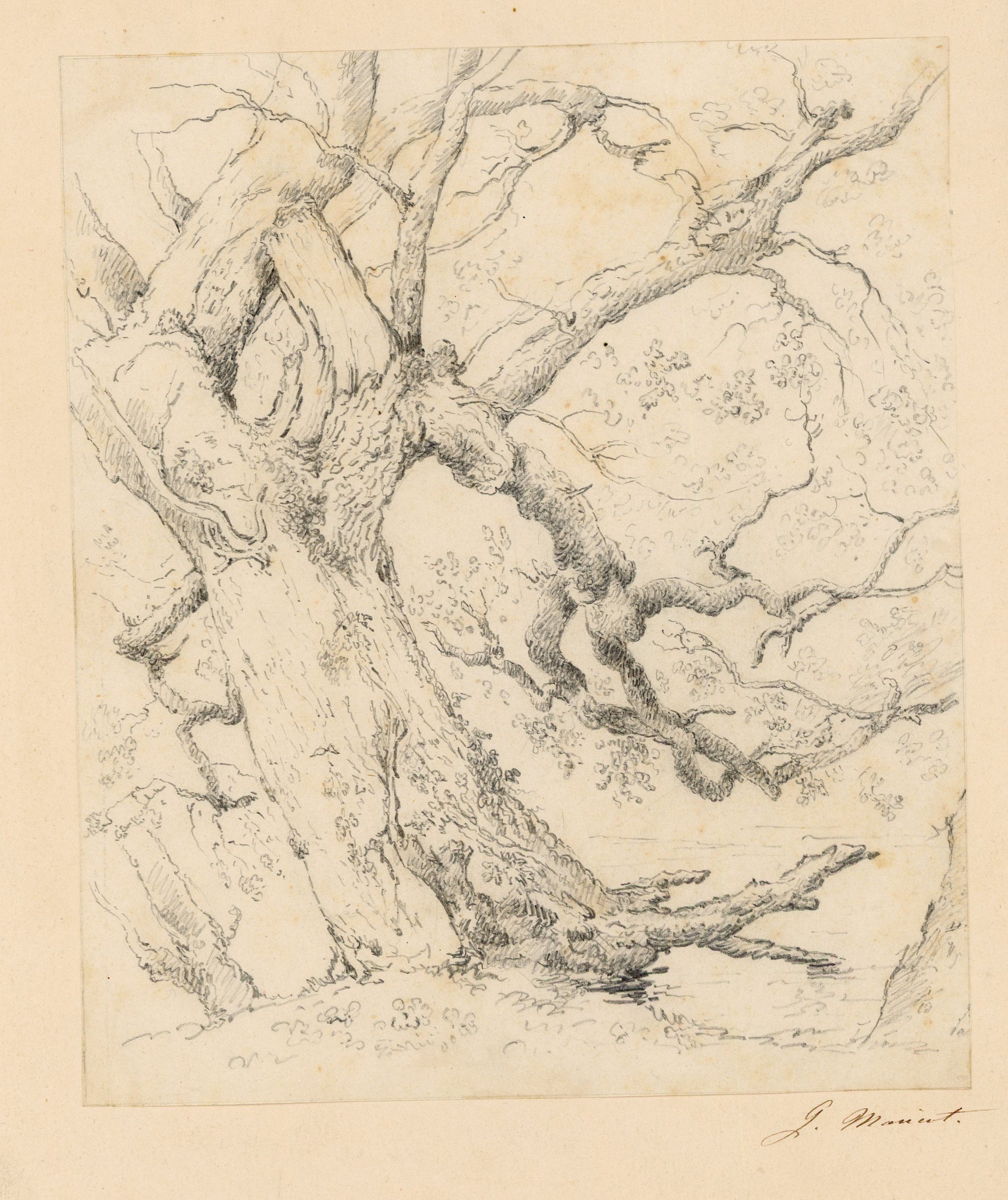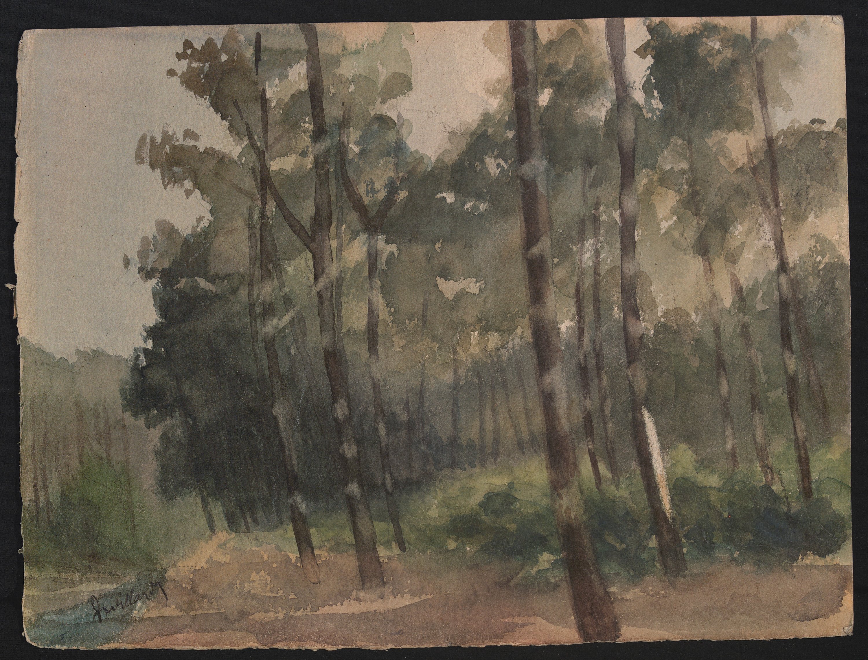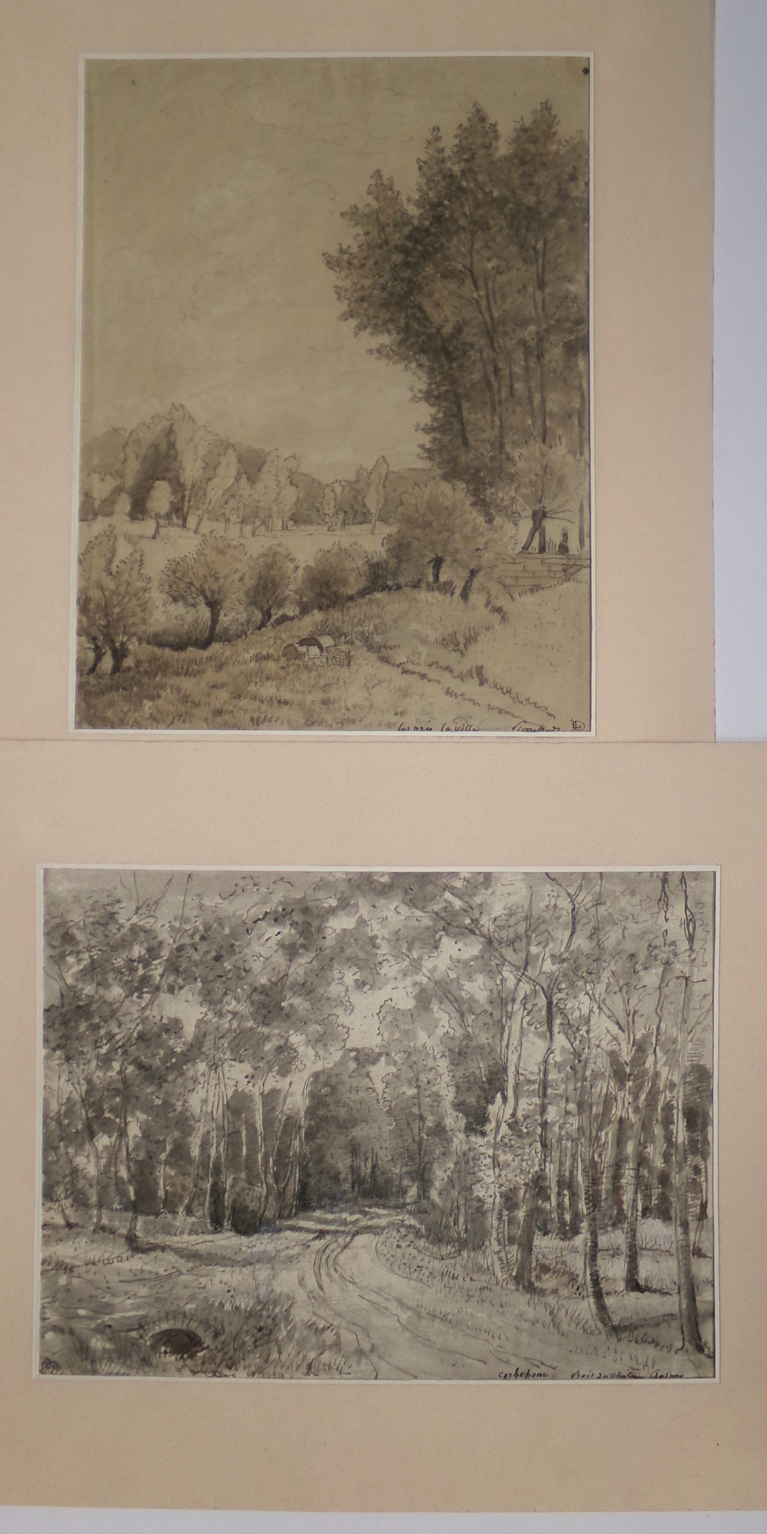 Réunion de 23 œuvres originales, techniques diverses (fusain, aquarelle, lavis, etc), formats divers, certaines signées, dont « Corbehem, bois du château Gosnay » et « Les prés la ville - Pierrefonds », lavis signés « L.D. », 26,5 x 35 cm et 35 x 26,5 cm ; Paysage de forêt, dans le goût de l’école de Barbizon, aquarelle, 18 x 25 cm ; Paysage, crayon sur papier gris, avec marque en rouge « Eugène Lepoittevin », 25 x 31 cm ; Promeneur, crayon signé Charles Ransonnette (1793-1877), 17 x 13,5 cm ; etc.