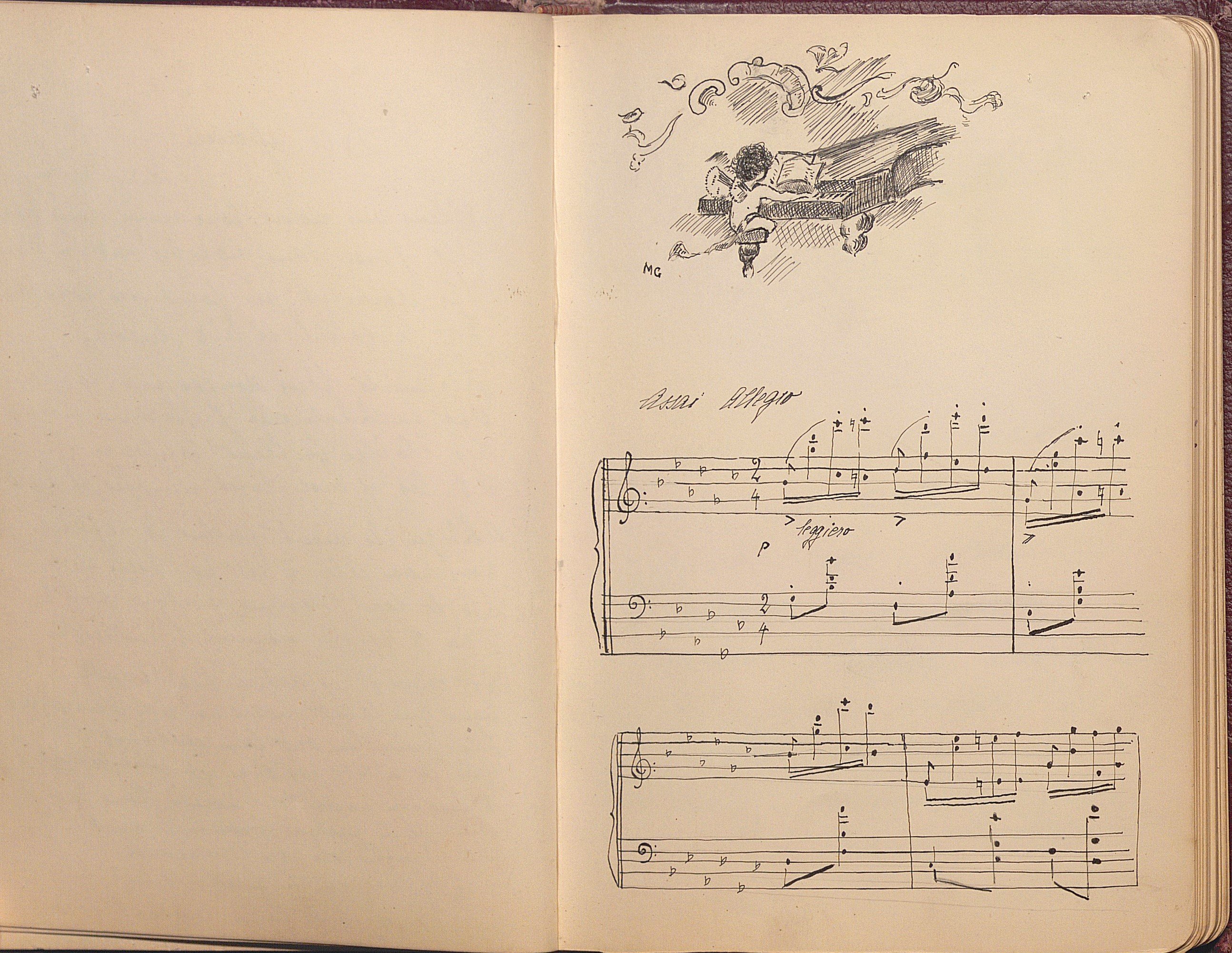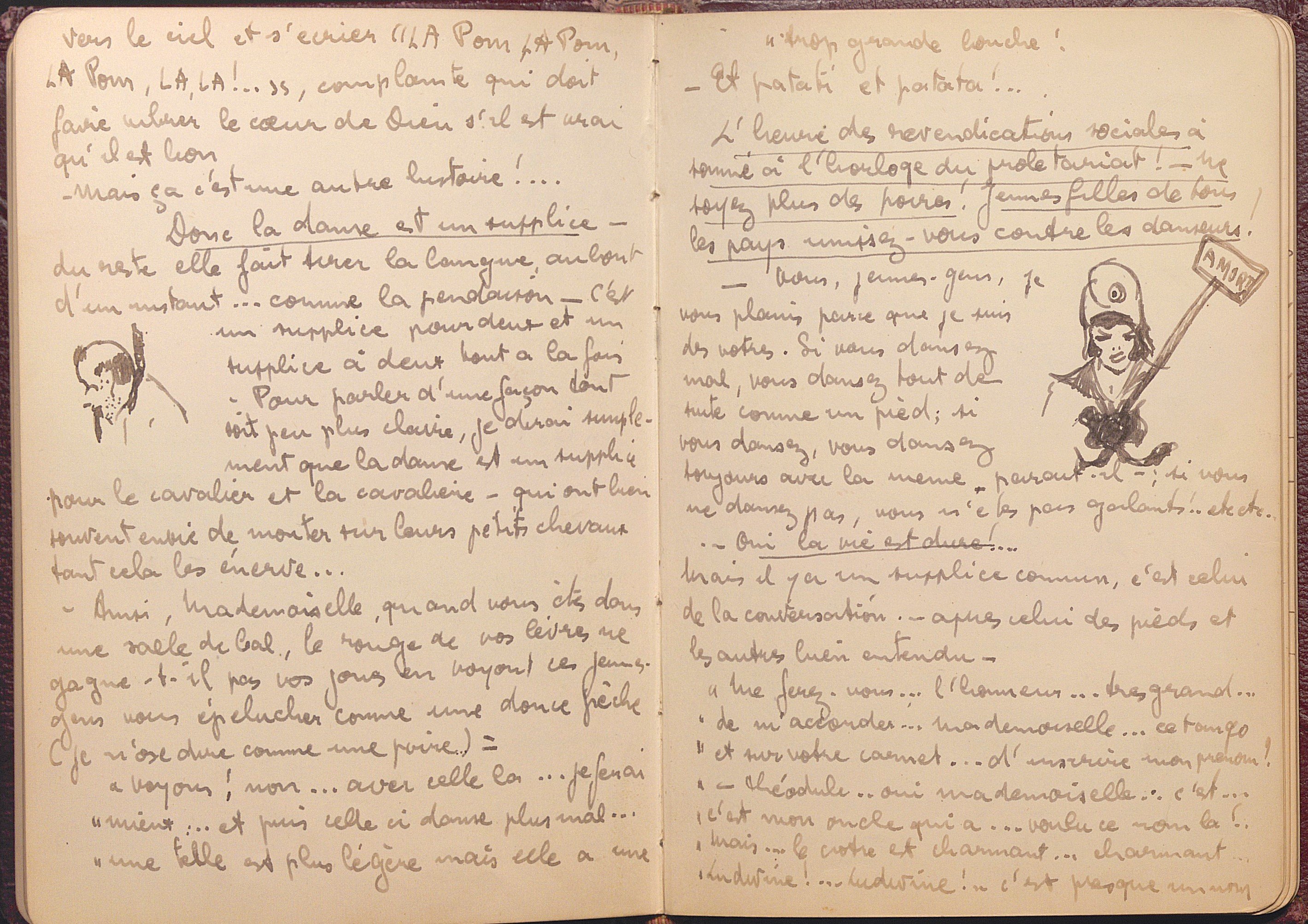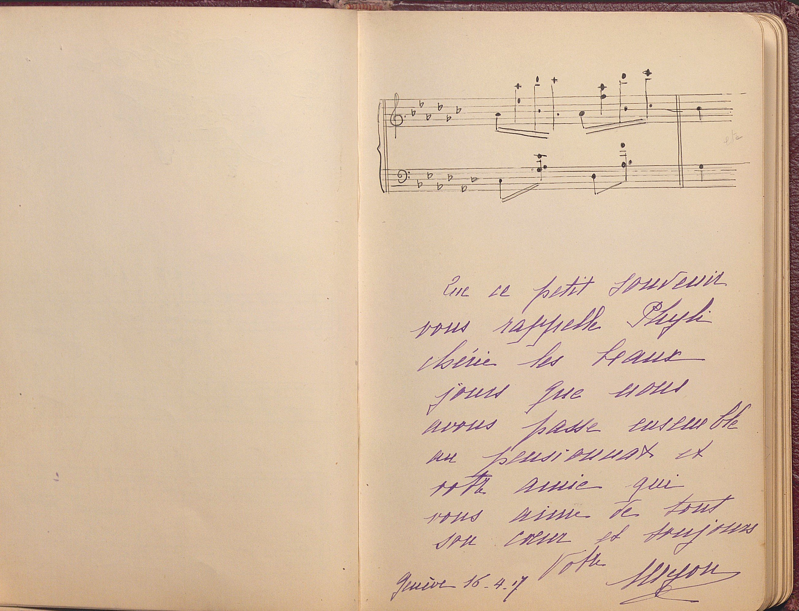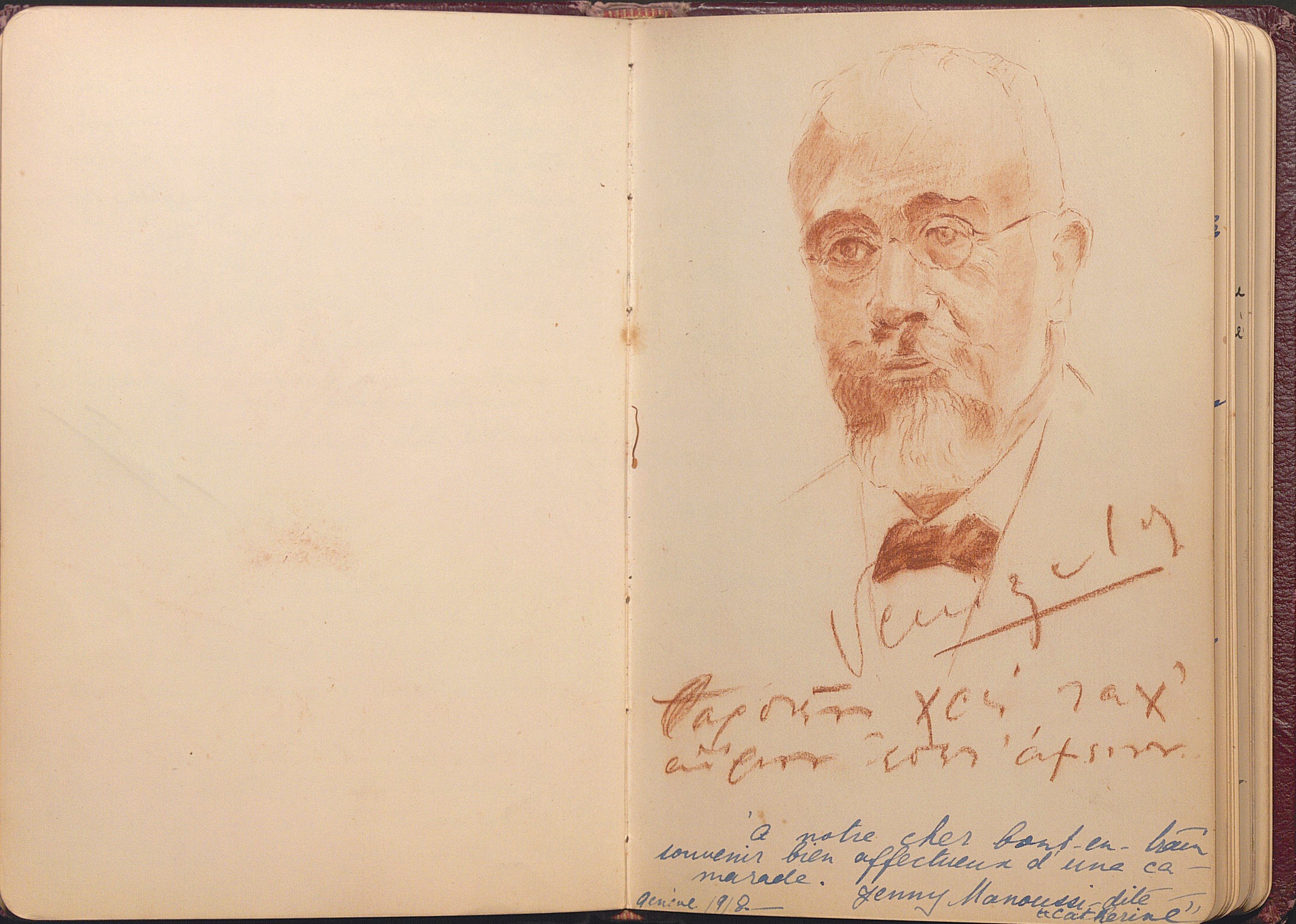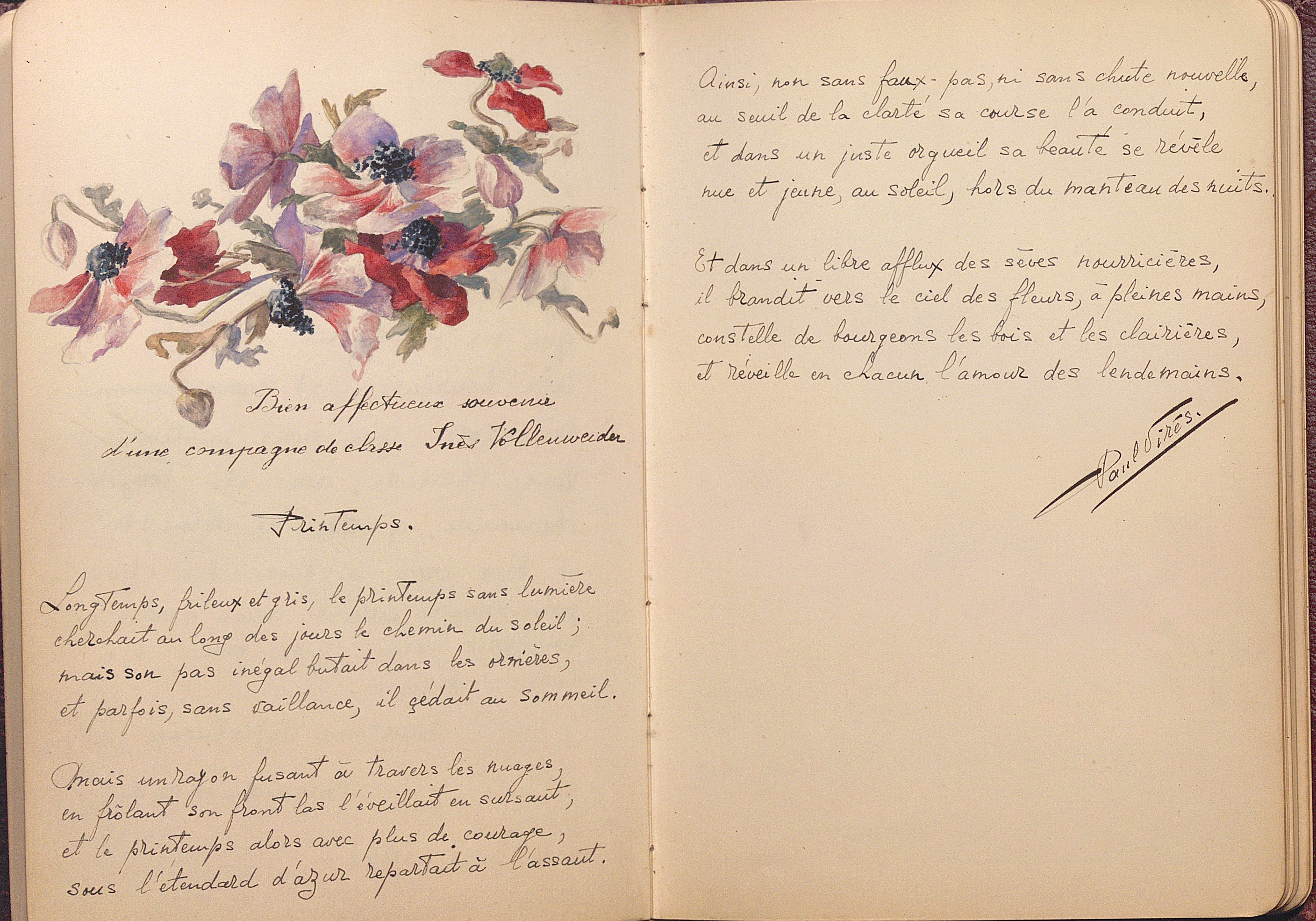 Petit carnet amicorum manuscrit, in-8 env. 43 feuillets, 1912-1926, ayant appartenu à Philiberte Abre (1900-1989) fille d’un banquier de Bonneville (Haute-Savoie), contenant poèmes, partitions musicales, citations, dessins, d’après des œuvres d’Emile Verhaeren, Sully Prudhomme, Verlaine, Victor Hugo, etc, dédicacés par des camarades de pensionnat de l’école des beaux-arts de Genève, mais aussi des camarades de retraites ou de vacances au Clos à Ayze (Haute-Savoie), La Clusaz, Couveloup à Saint Vital.