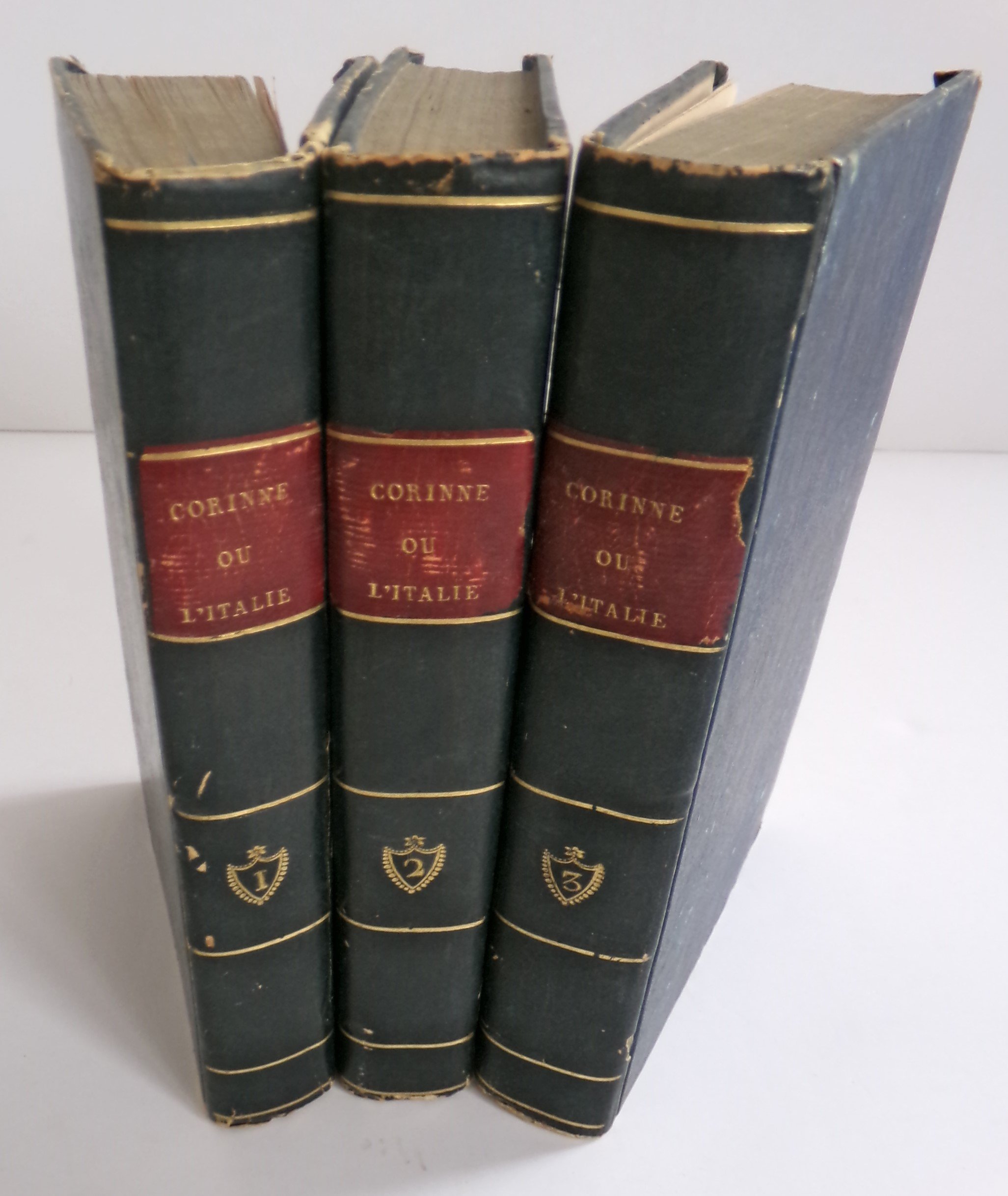 Corinne ou l'Italie. Lib. stéréotype chez H. Nicolle, Paris 1807. 3 vol. in-12 rel. d’époque. (4)-384-(4)-424-(4)-443 pp. Deuxième édition parue la même année que l'originale. Rare.