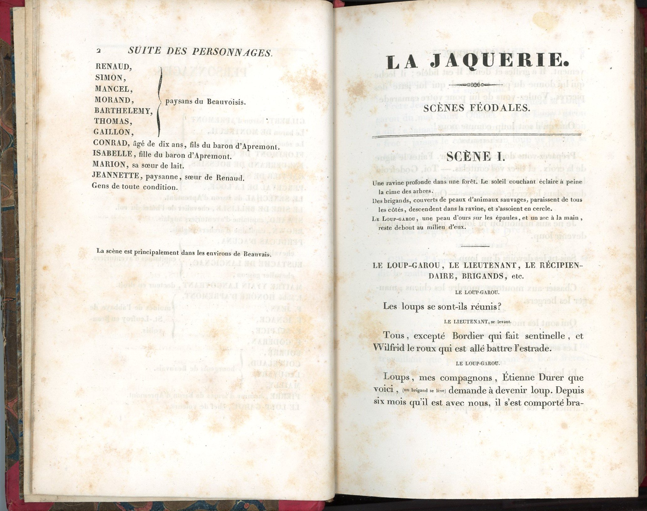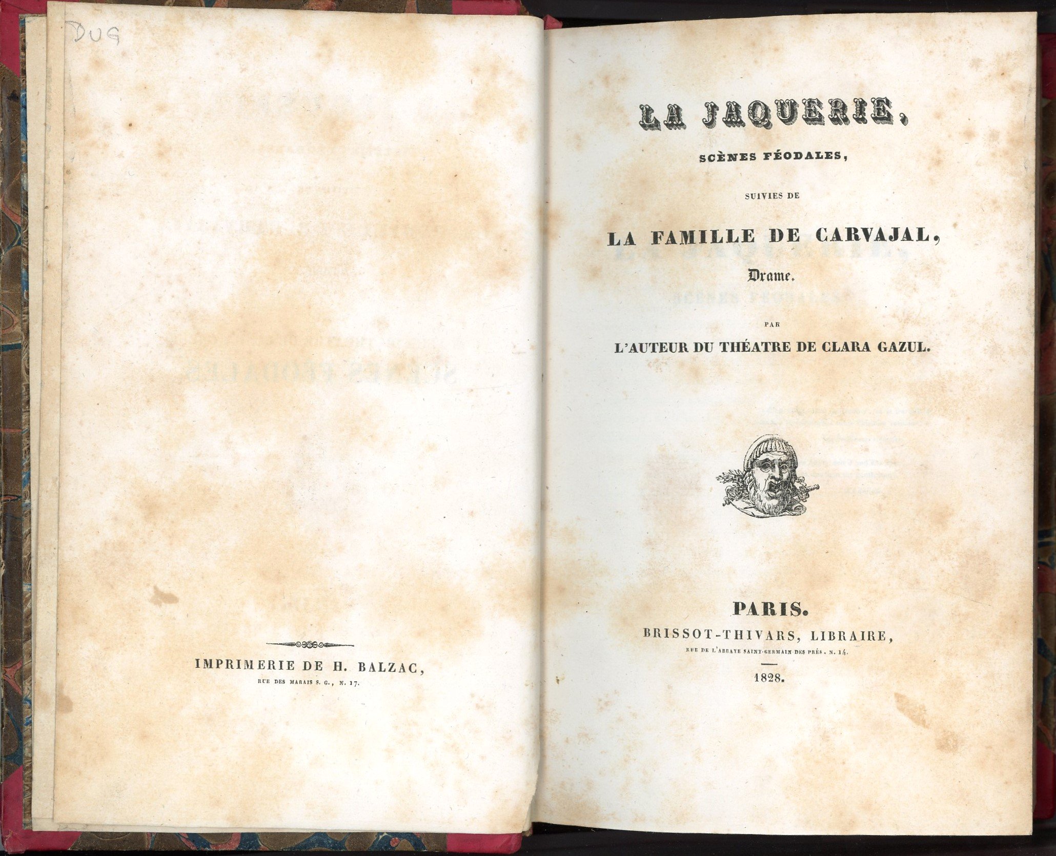 La Jacquerie, scènes féodales, suivies de la Famille de Carjaval, drame. Par l'auteur du théâtre de Clara Gazul. Paris, Brissot-Thivars, 1828. In-8, rel. ½ basane rouge (frottements), 423 pp.