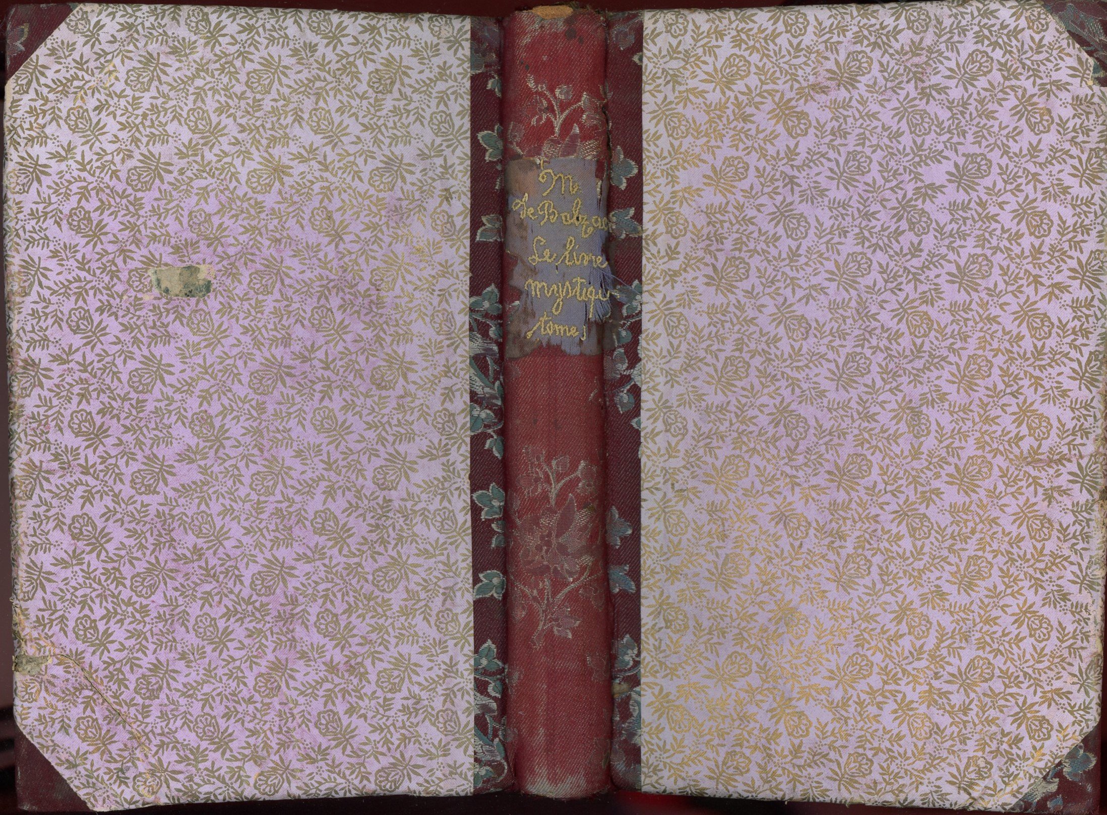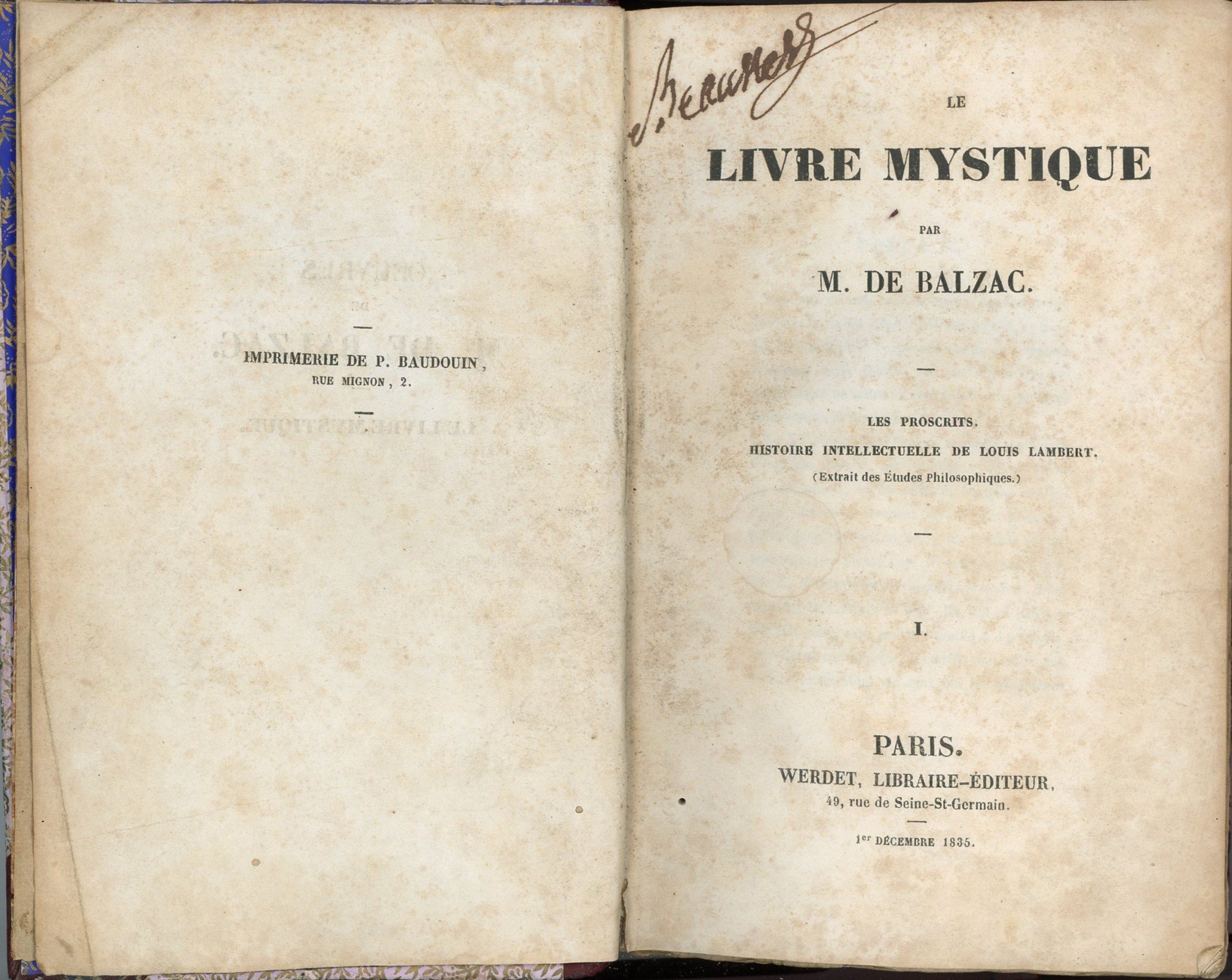 Le Livre Mystique. Tome 1: Les Proscrits, Histoire Intellectuelle de Louis Lambert (Extrait des Etudes Philosophiques), Tome 2: Séraphira (Extrait des Etudes Philosophiques). Paris, Werdet 1er décembre 1835. In-8 rel. couverte de tissus, 352 et 357 pp. (rousseurs, trous de ver).