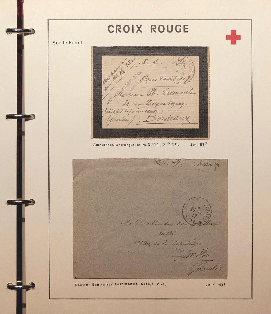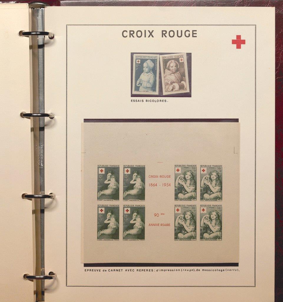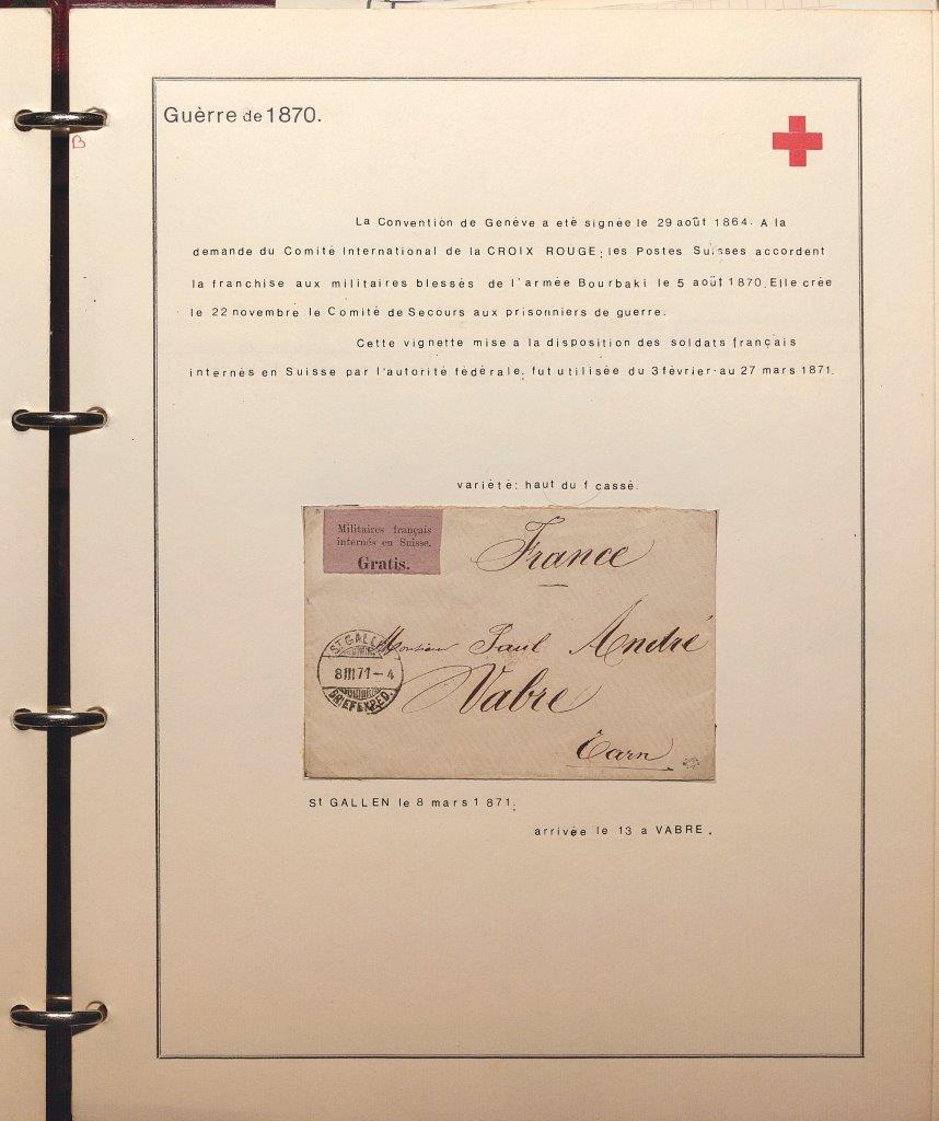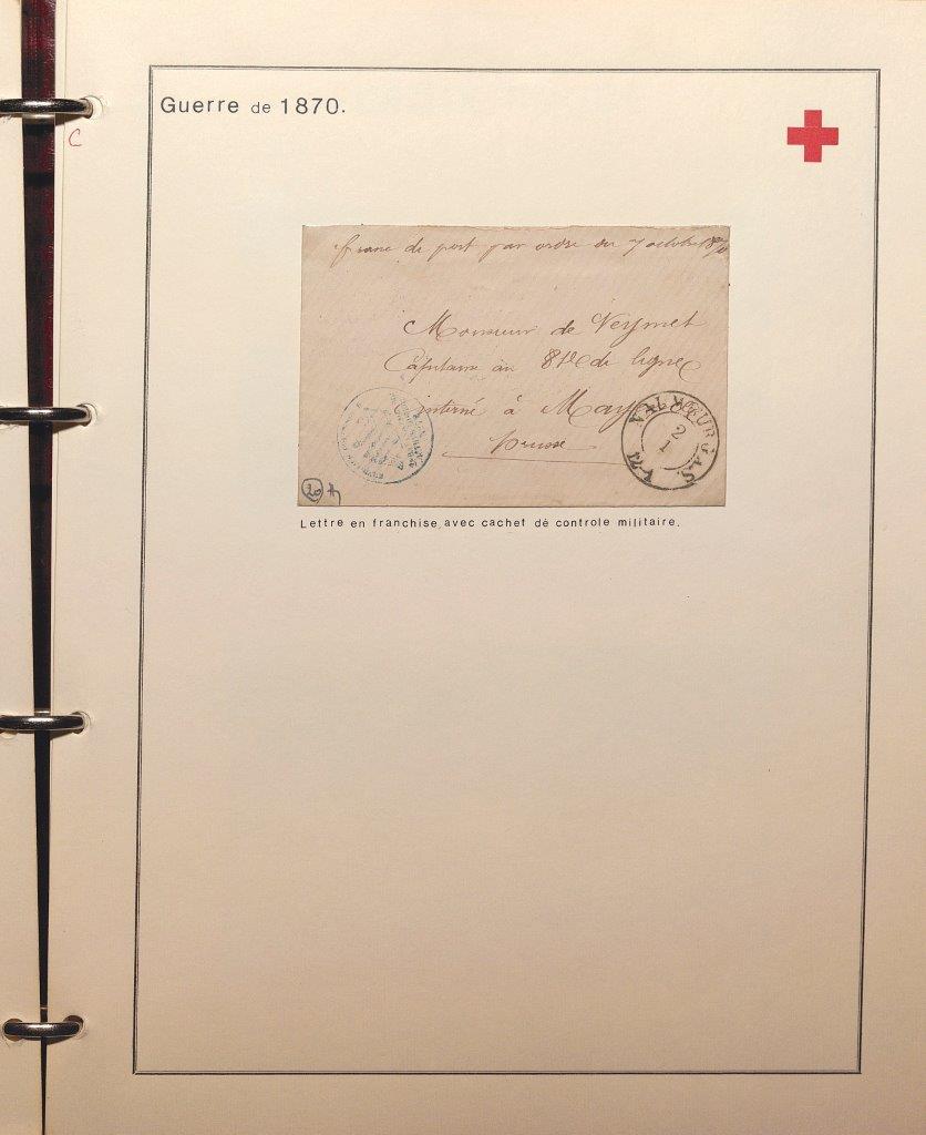 Intéressante collection sur le thème de la Croix-Rouge réunie en 2 classeurs, 31 x 26 cm, 45 pages, à travers les marques postales, cartes postales, timbres oblitérés et neufs, correspondances et divers, depuis la guerre de 1870-1871 jusqu’aux années 1970, dont : Vignette « Militaires français internés en Suisse – Gratis » utilisées en Suisse du 3 février au 27 mars 1871 sur enveloppe affranchie ; nombreux documents relatifs aux ambulances, hôpitaux auxiliaires et prisonniers durant la guerre 1914-1918 et la guerre 1939-1945 ; séries des émissions au profit de la Croix Rouge de 1951 à 1973 (carnets, timbres) ; 2 épreuves d’artiste signées Jules Piel de l’année 1963 ; etc.