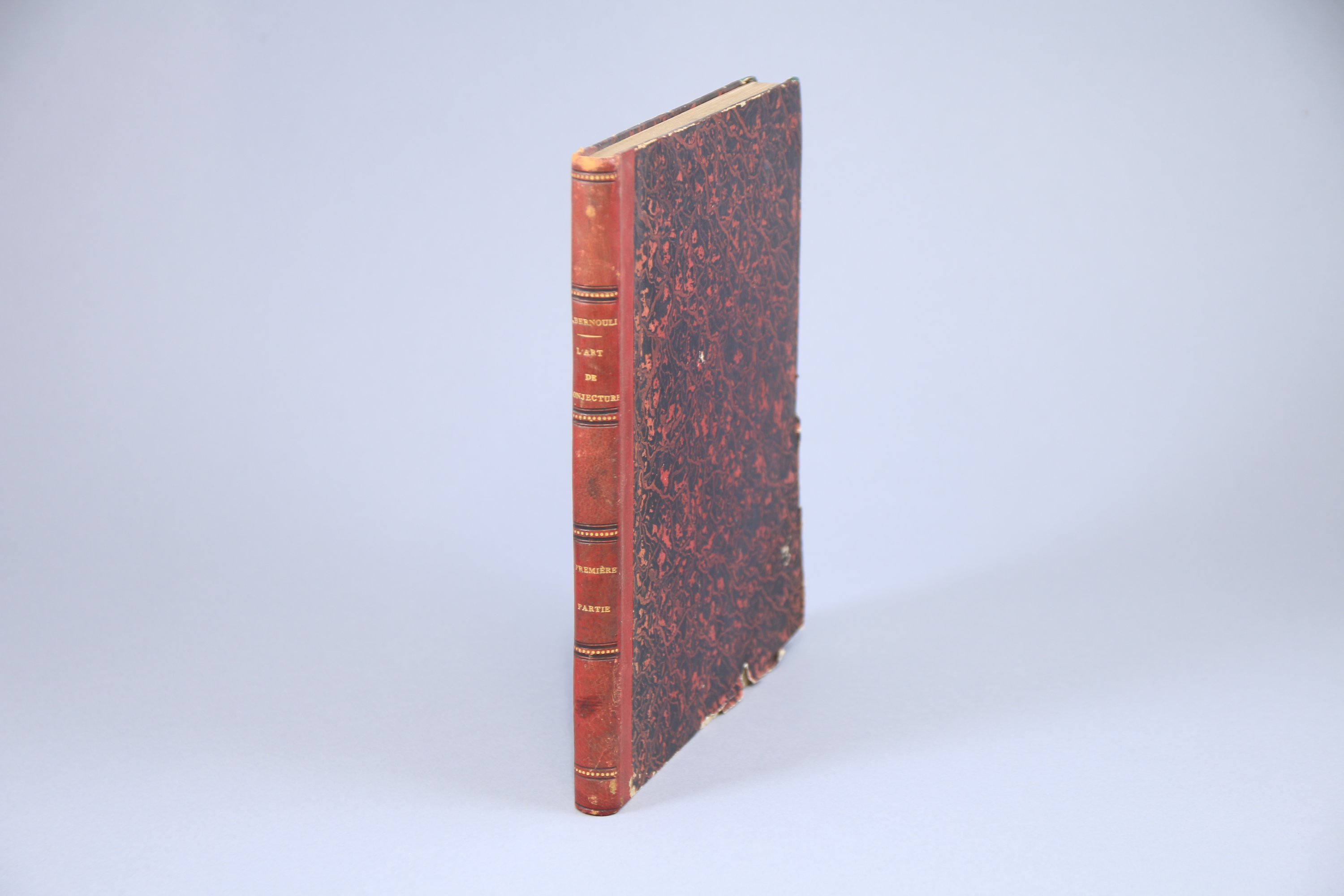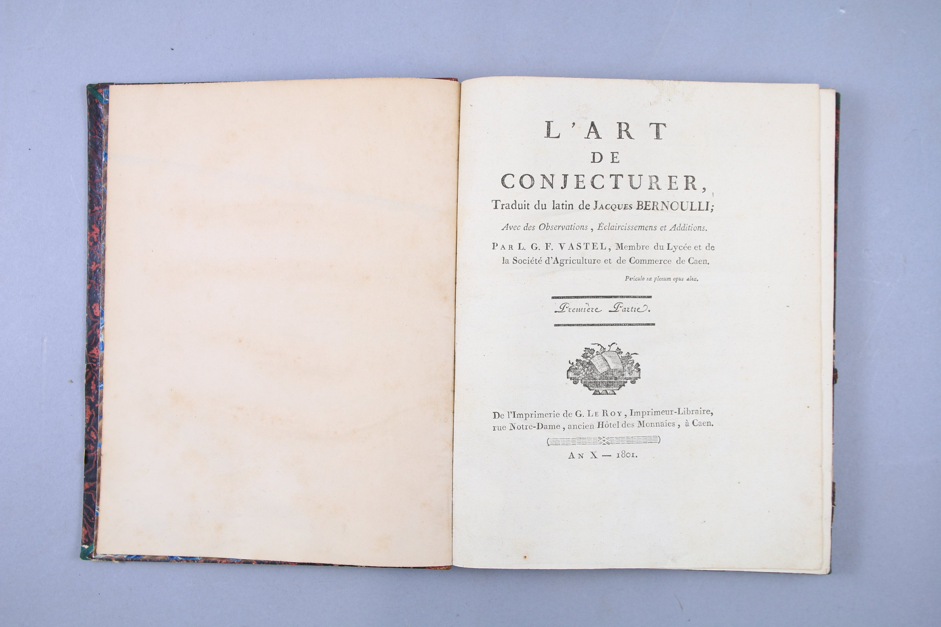 BERNOULLI (Jacques). L'art de conjecturer, traduit du latin de Jacques Bernoulli, avec des observations, éclaircissemens et additions par L.-G.-F. Vastel. Caen, Impr. de G. Le Roy, 1801. In-8, (1) f. de titre, ii pp., 180 pp., un tableau dépliant ; demi-maroquin rouge du XIXe s., dos lisse.