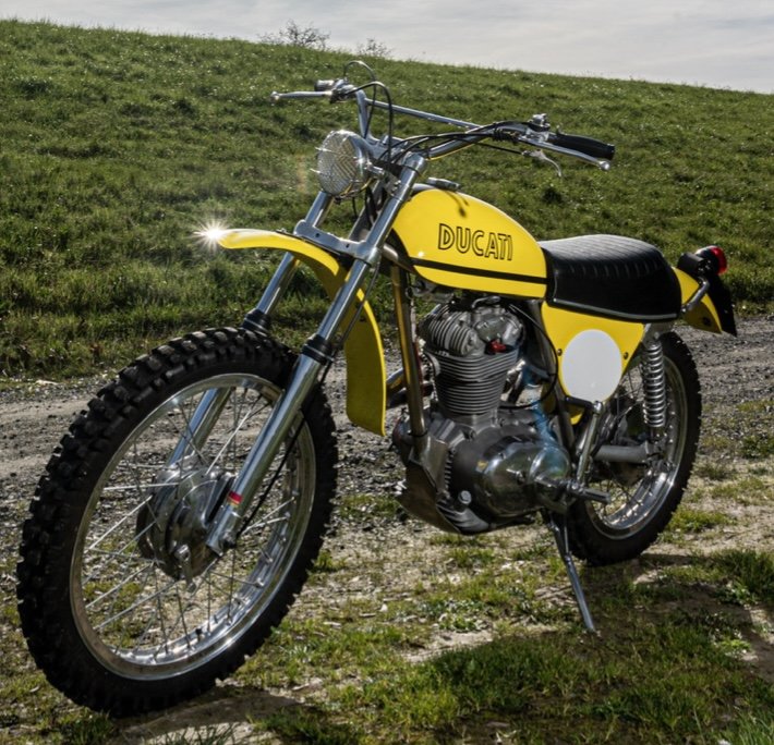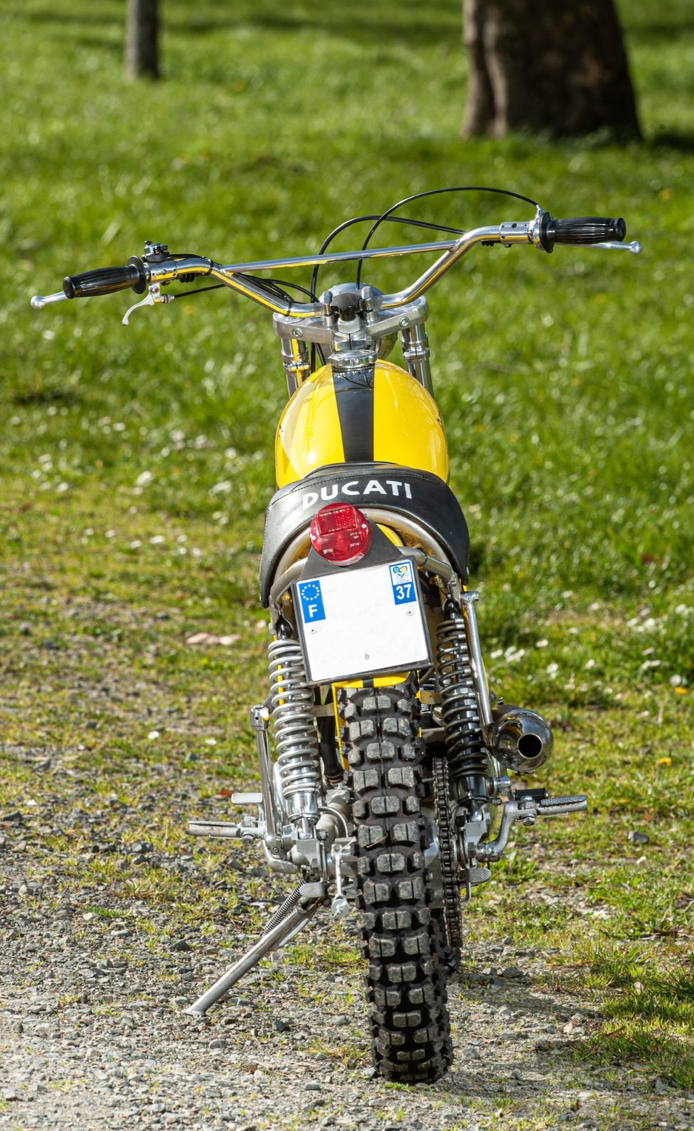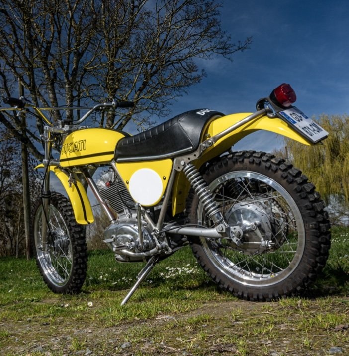 La Ducati 450R/T est produite à moins de 500 exemplaires. La nôtre est présentée dans une rare version avec cadre nickelé, vraisemblablement destinée au marché américain. Notre moto est un exemplaire de deuxième main en parfait état, restauré en 2022 par Gilbert Bouvet. Les pièces d'origine ont été conservées par le propriétaire et pourront être remises à l'acquéreur, à l'instar des compteurs (non remontés).