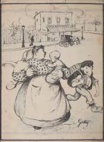 Sans titre, encre et crayon bleu, signé « Gaston » en bas à droite, légendé « Eh! La petite mère c’est y pour vot’ salé cette tête de cochon là? », 45,5 x 31 cm ;