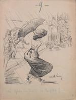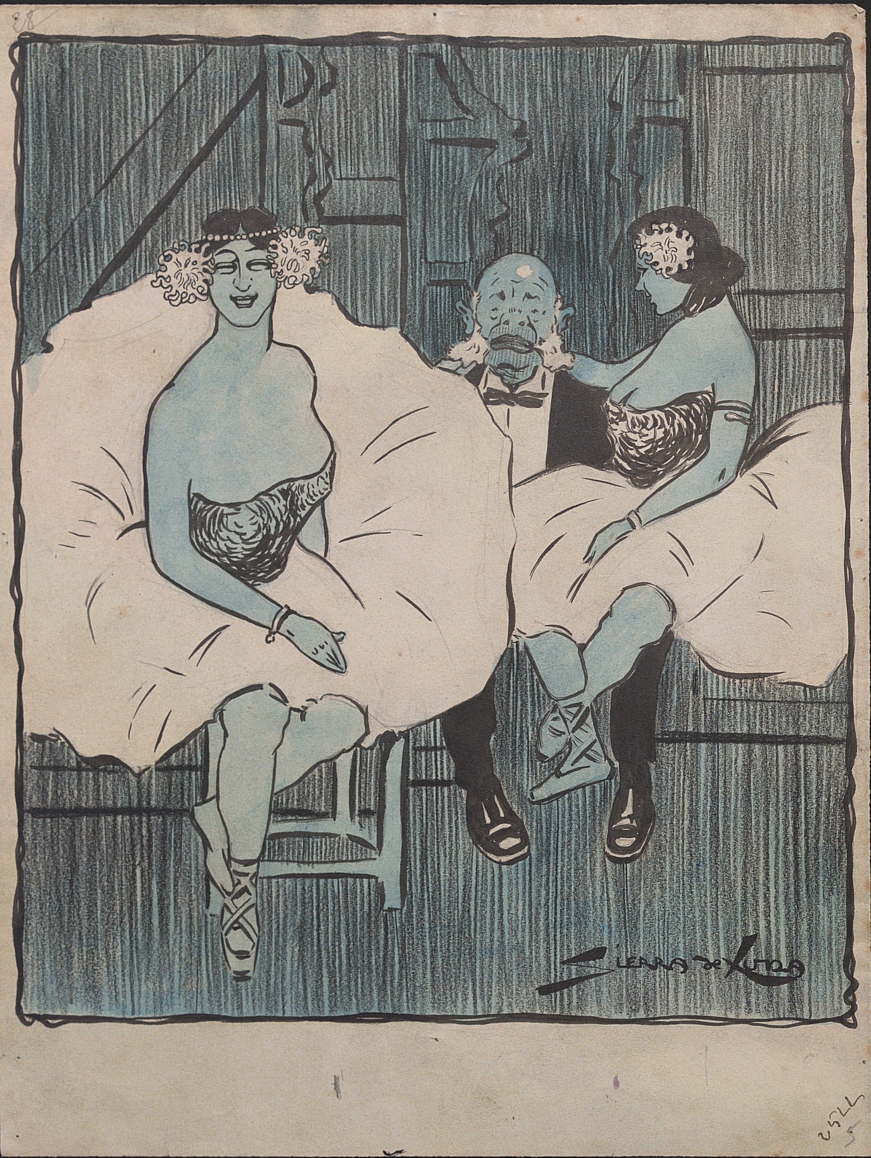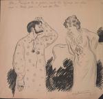 Sierra de Luna, Propos de coulisses, encre et crayon bleu, signé en bas à droite, titré et légendé à la plume au dos « Tu sais la petite Arlette s’est faite fiche une amende de un louis. Qu’est-ce qu’elle a fait? Il parait qu’elle a mordu la langue au directeur », 31,5 x 24 cm.