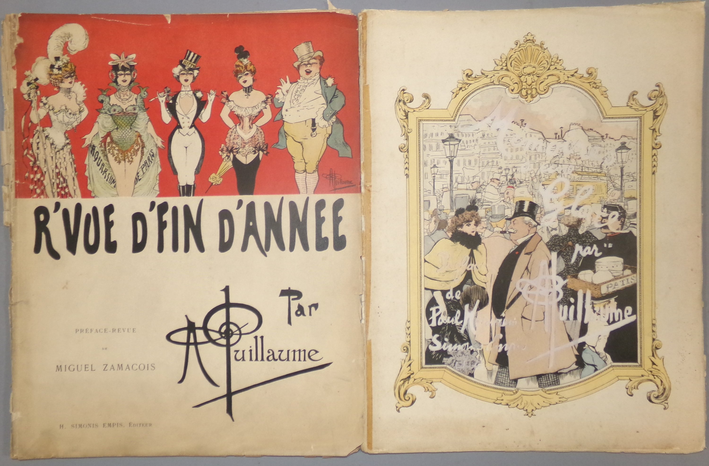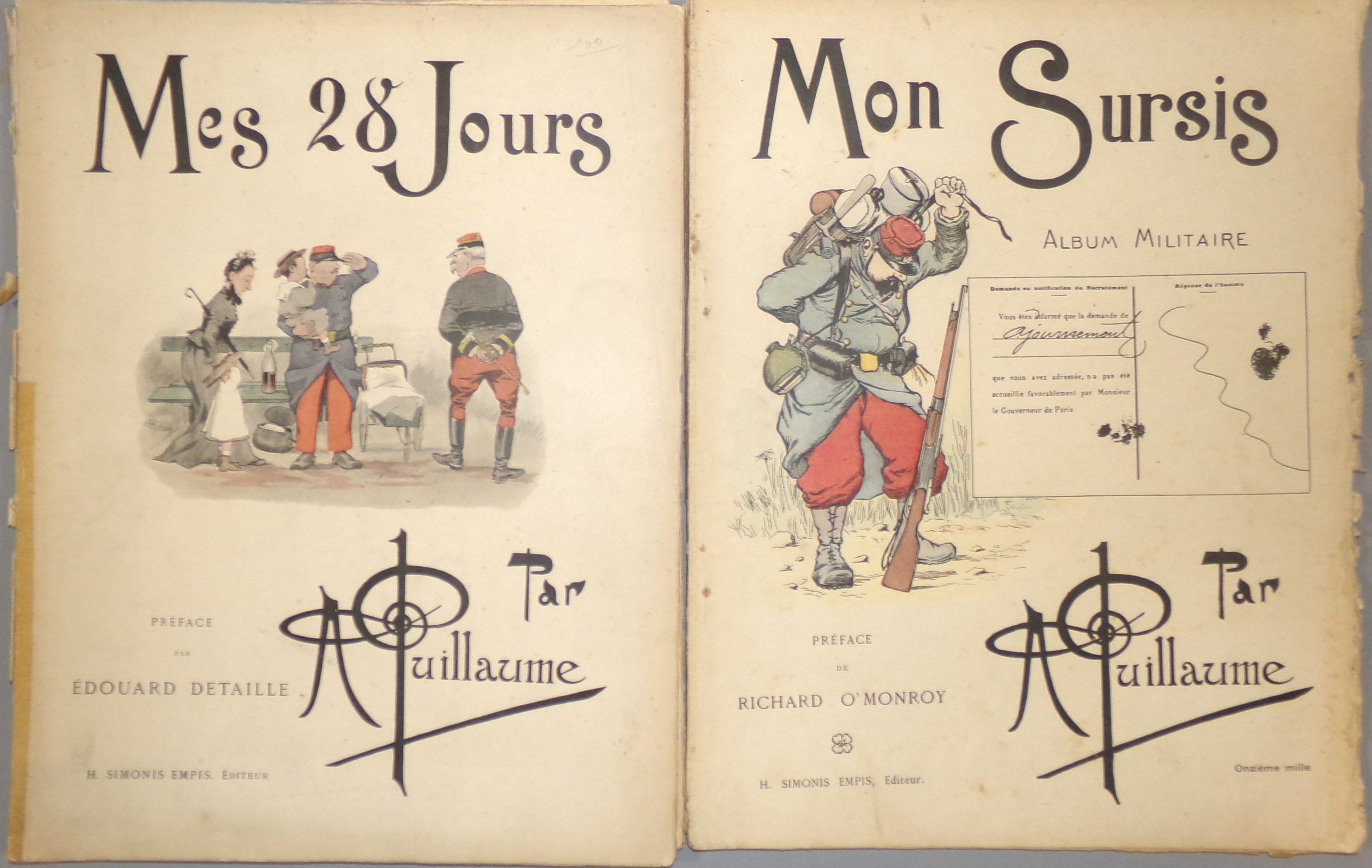 Réunion de 9 albums grand in-4 broch. ou rel. illustrés par des dessins satiriques en couleurs ou en noir d’Albert Guillaume, édités par H. Simonis Empis, Paris, vers 1895-1900: Mes 28 jours (2 ex.) ; Mon sursis ; Mémoires d’une glace (2 ex.) ; Pour vos beaux yeux ; R’vue d’fin d’année ; Des bonhommes 1ère (2 ex.) et 2ème série.