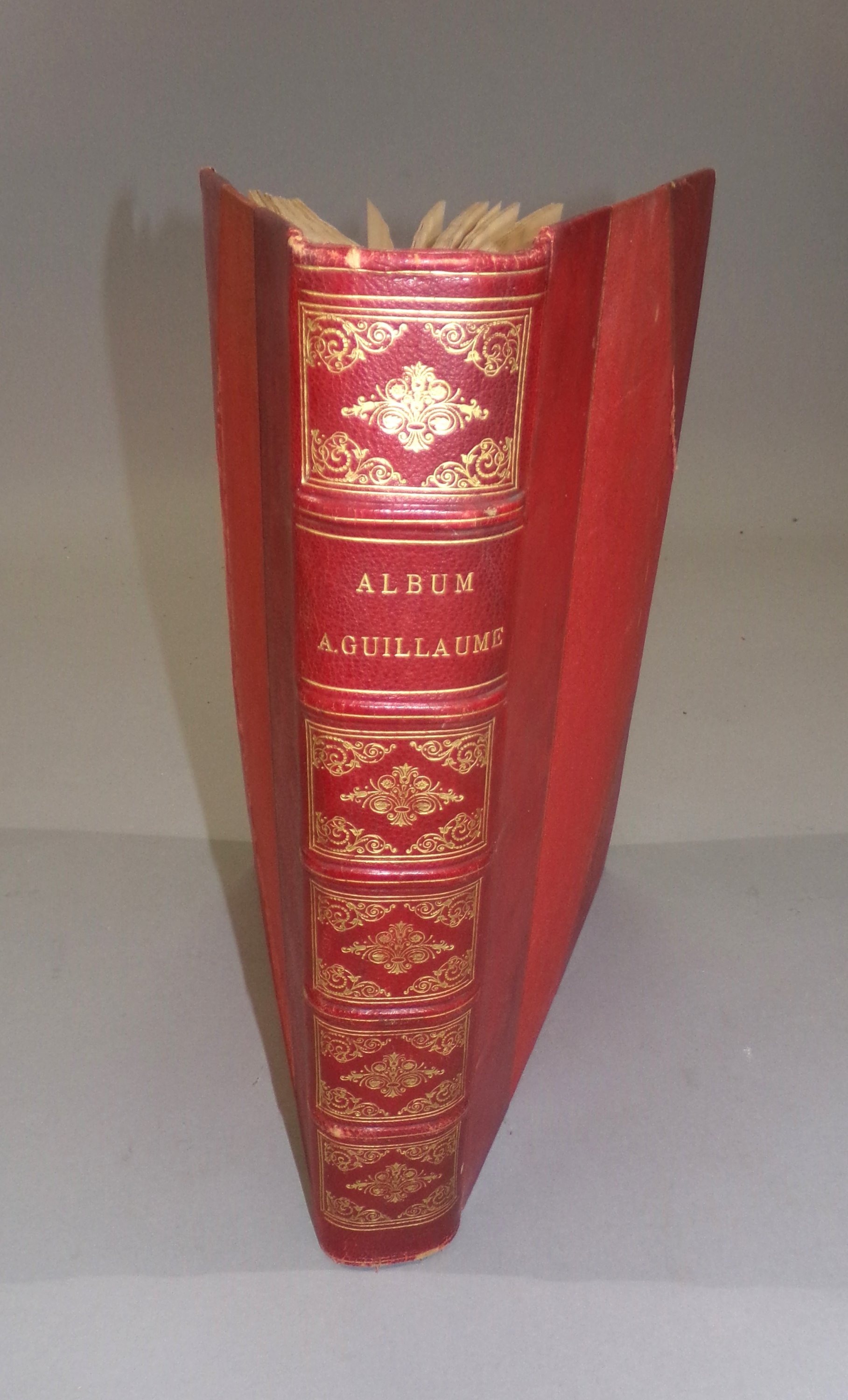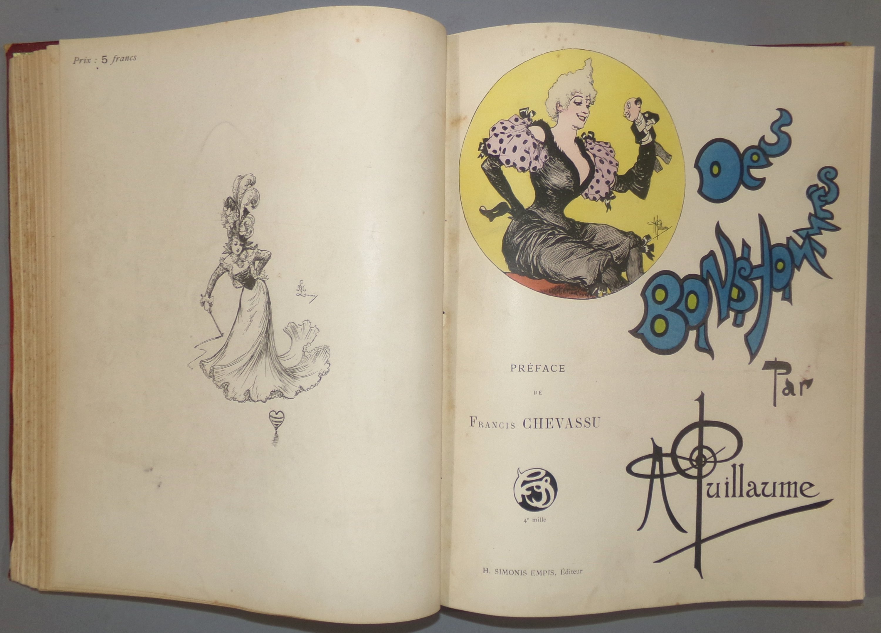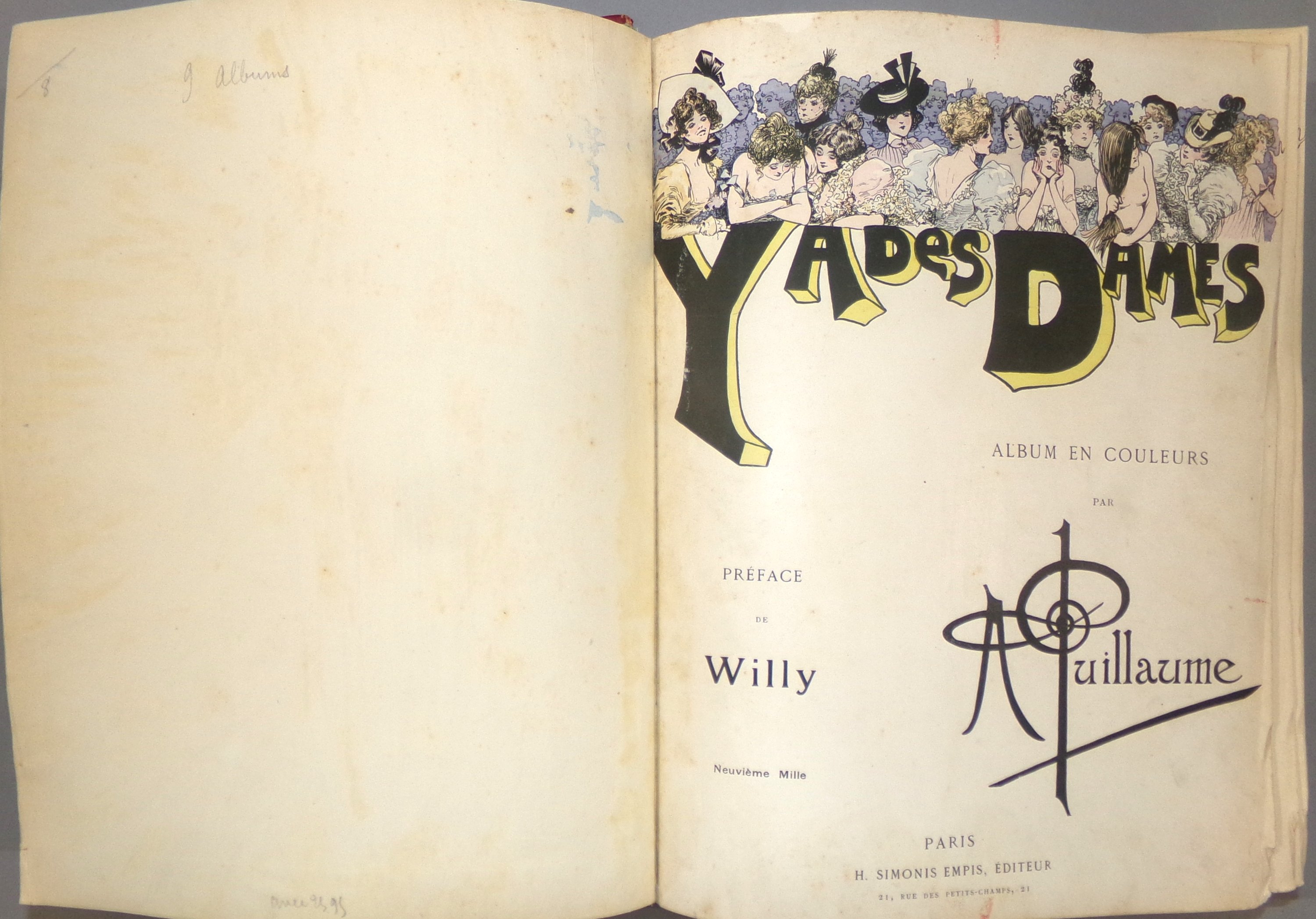 Album factice grand in-4 rel. ½ chagrin réunissant 9 albums illustrés par des dessins satiriques en couleurs ou en noir d’Albert Guillaume, édités par H. Simonis Empis, Paris, vers 1895-1900: Y a des dames ; P’tites femmes ; Entre femmes ; Des bonhommes ; Mémoires d’une glace ; Mes campagnes ; Etoiles de mer ; Madame est servie ; Faut voir.