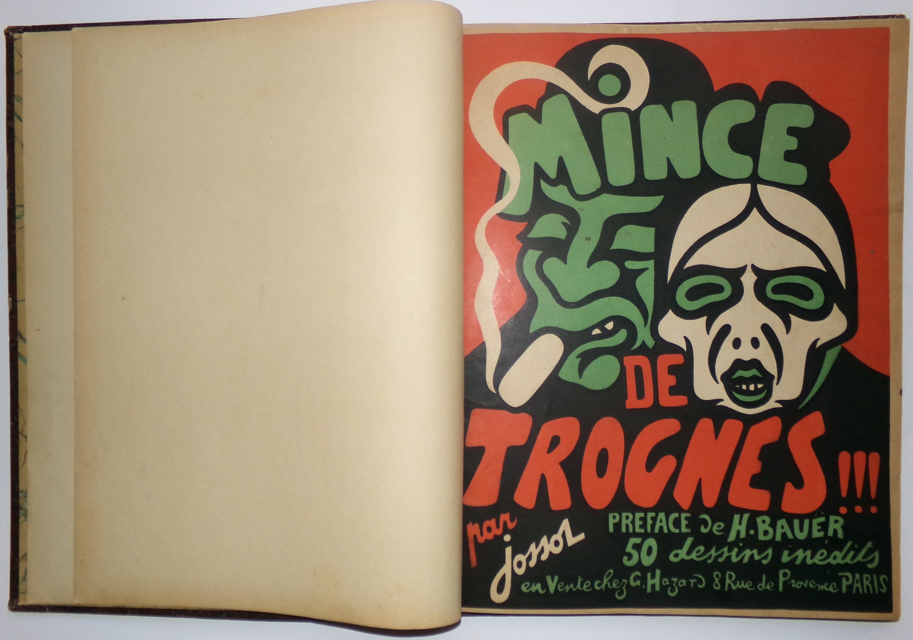 Mince de trognes!!! Préface de H. Bauer. 50 dessins inédits. Paris, Hazard, [1896]. In-fol. rel. ½ basane. Conserve sa couverture lithographiée en couleurs. Contient 50 sujets en noir avec leur légende typographiée. Bel exemplaire.