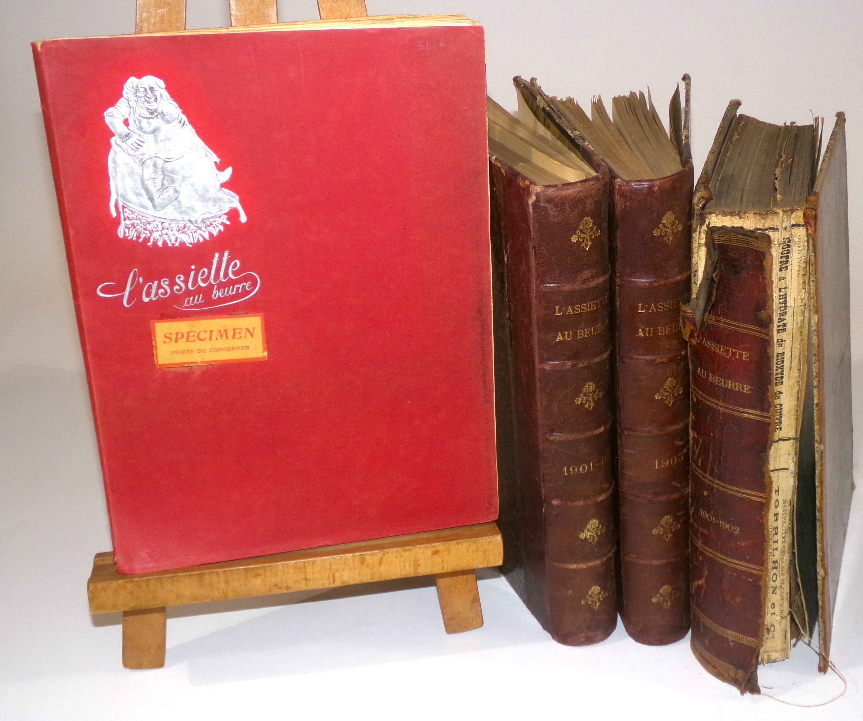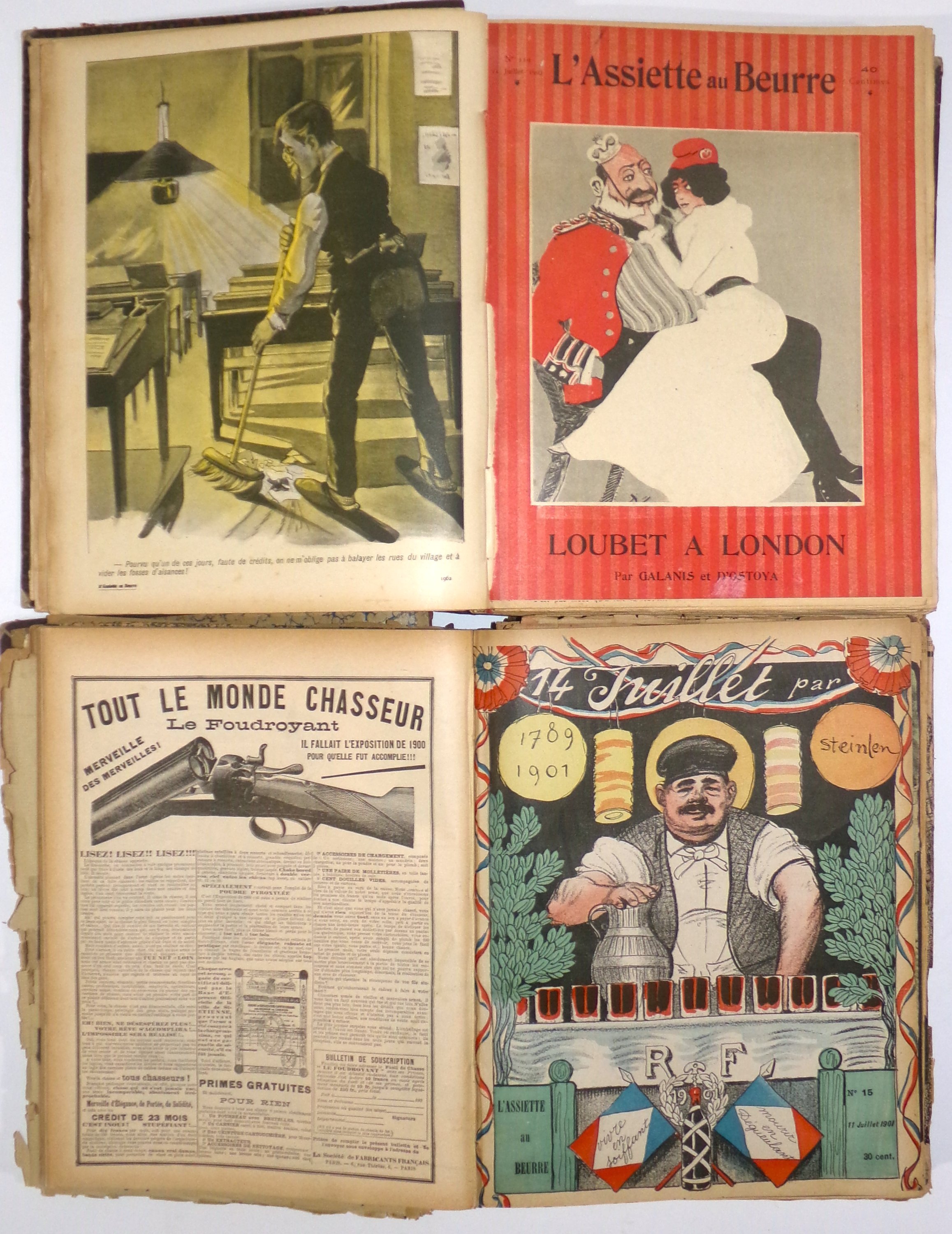 1 vol., 1901, comprenant n° 1 au n°45, tête de collection, dont n°15 « Le 14 juillet » par Steinlen, y compris 4 n° « Les Tartines de l’Assiette au Beurre » (15 et 22 août, 5 et 9 septembre 1901) (qqs num. rognés, qqs pages détachées, qqs déchirures, plis) (rel. en l’état) ;