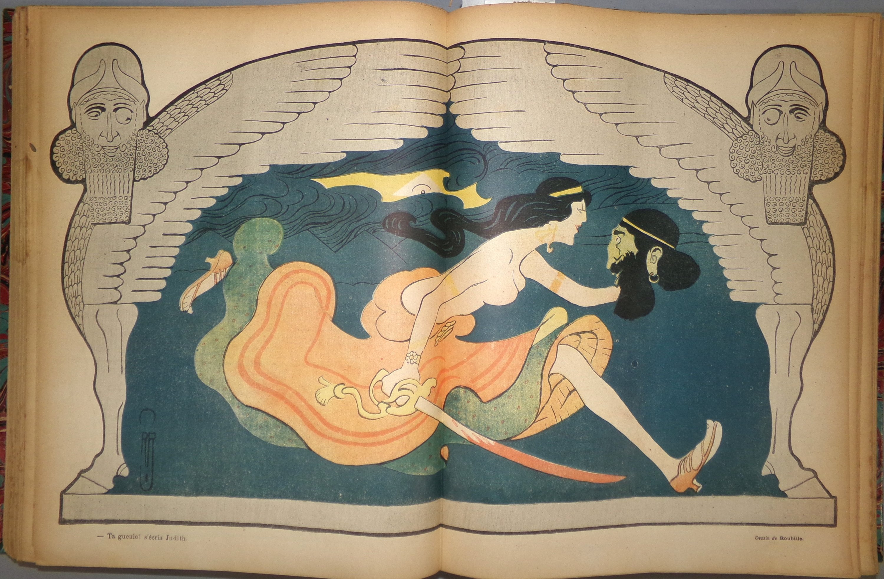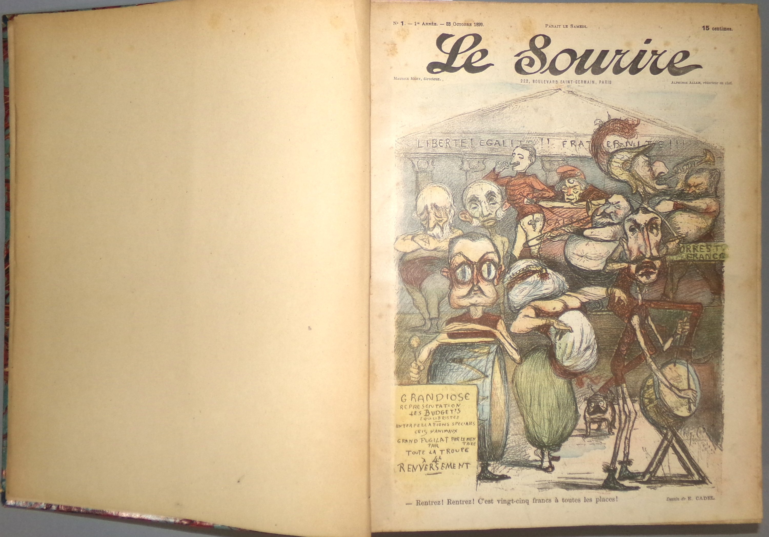 Rare tête de collection de cette revue humoristique illustrée, dirigée par Maurice Méry. Textes d’Alphonse Allais rédacteur en chef sous son nom et sous divers pseudonymes comme Esope fils, Tristan Bernard, Dominique Lebeau, Georges Auriol, Max Jacob sous le pseudonyme de Léon David, etc. Abondantes illustrations de Cappiello, Devambez, Capy, Poulbot, Pourriol, Villemot, Hermann-Paul, Hansi, Léandre, Jacques Villon, Abel Faivre, Maurice Radiguet, Gottlob, Depaquit, Rouveyre, Ferdinand Bac, Iribe, Gus Bofa, Hansi, dont 23 dessins de Sacha Guitry parus du 24 octobre 1903 au 30 juillet 1904.
