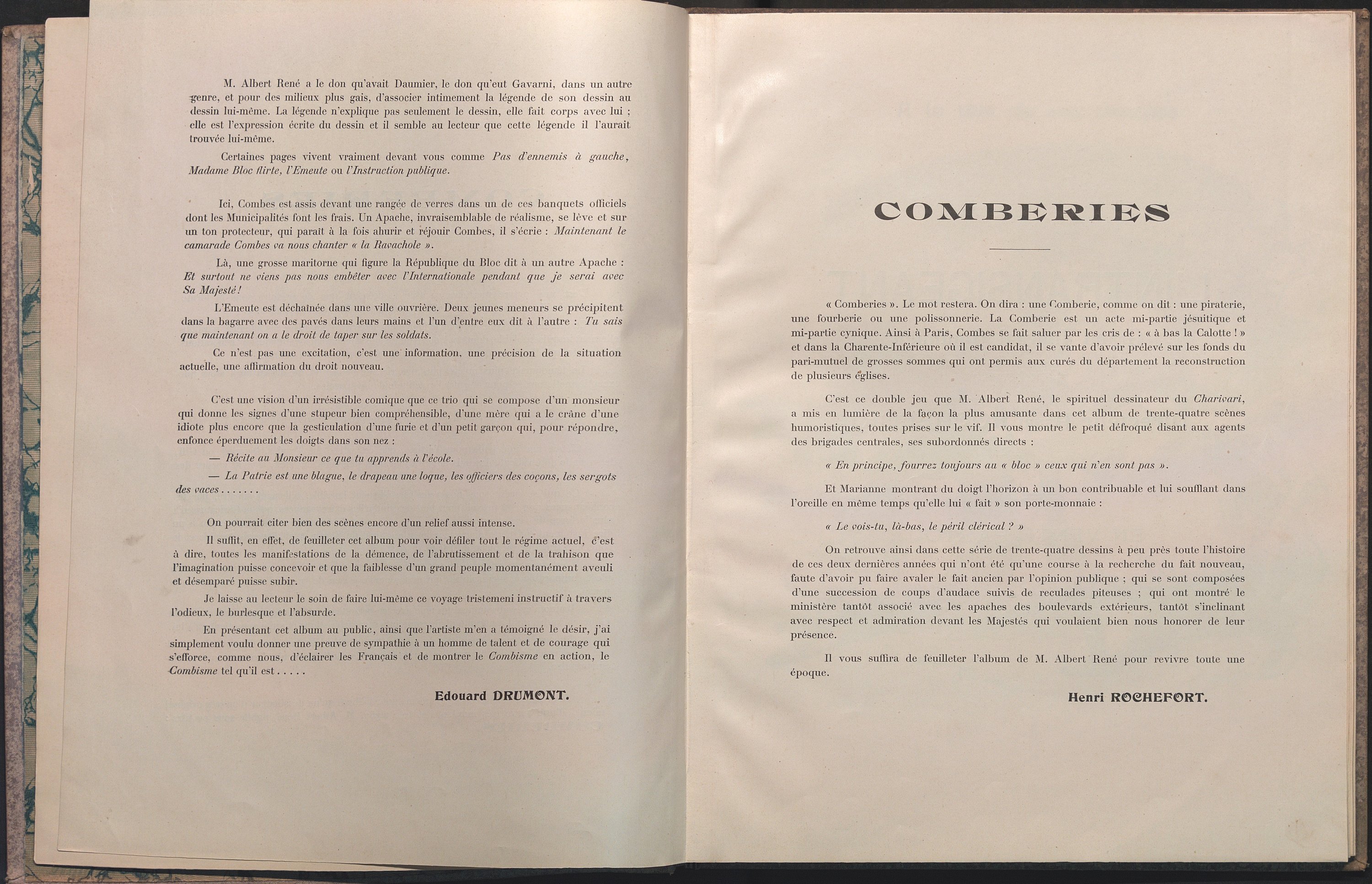 Comberies. Préfaces d'E. Drumont et H. Rochefort. Paris, Librairie antisémite, s.d. [sept. 1904]. In-4 rel., 34 dessins par Albert-René Morice.