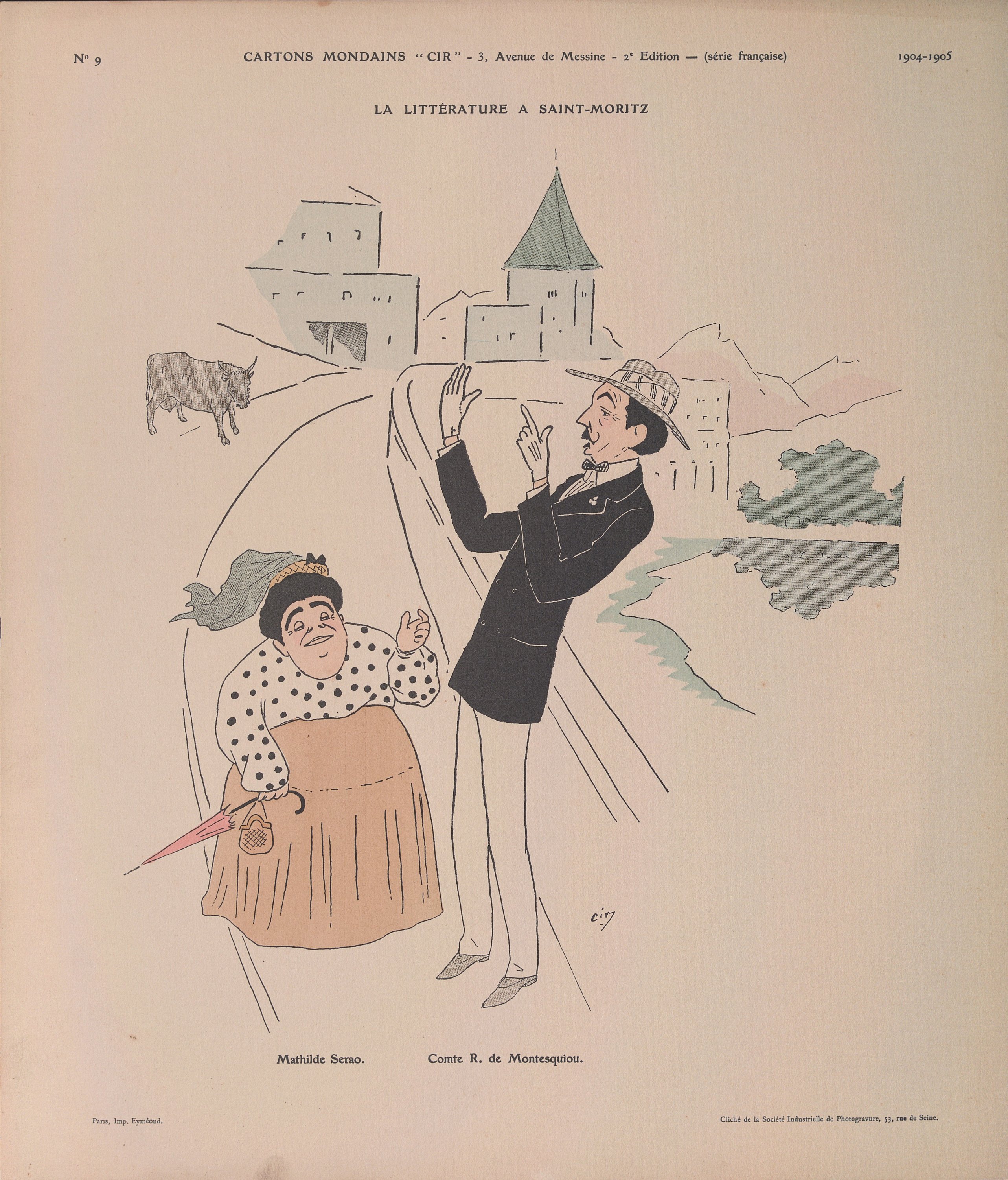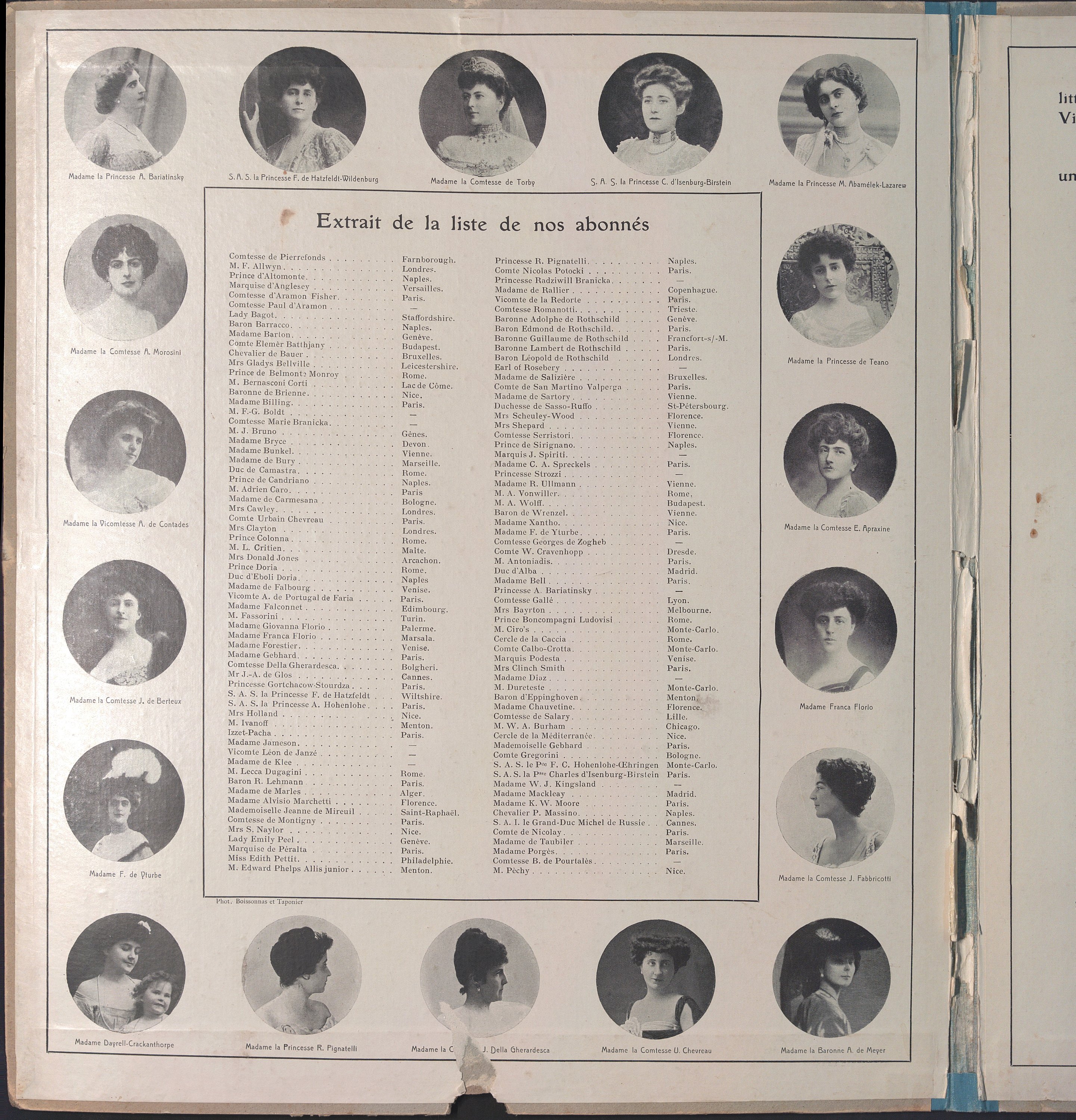 Elles représentent des personnages composant le gotha de l’époque: princes, aristocrates, hommes d’affaires, etc, dont le duc de Devonshire devant l’Hôtel de Paris à Monte-Carlo ; le grand-duc Michel de Russie au Golf-Club à Cannes ; le Maharaja Duleep Singh à Monte-Carlo ; le duc et la duchesse de Marlborough à Paris ; lord et lady de Grey au Carlton restaurant à Londres ; James Gordon Bennet junior homme de presse américain et fils du fondateur du New York Herald ; comte de Montesquiou ; etc. Peu courant (rousseurs éparses)