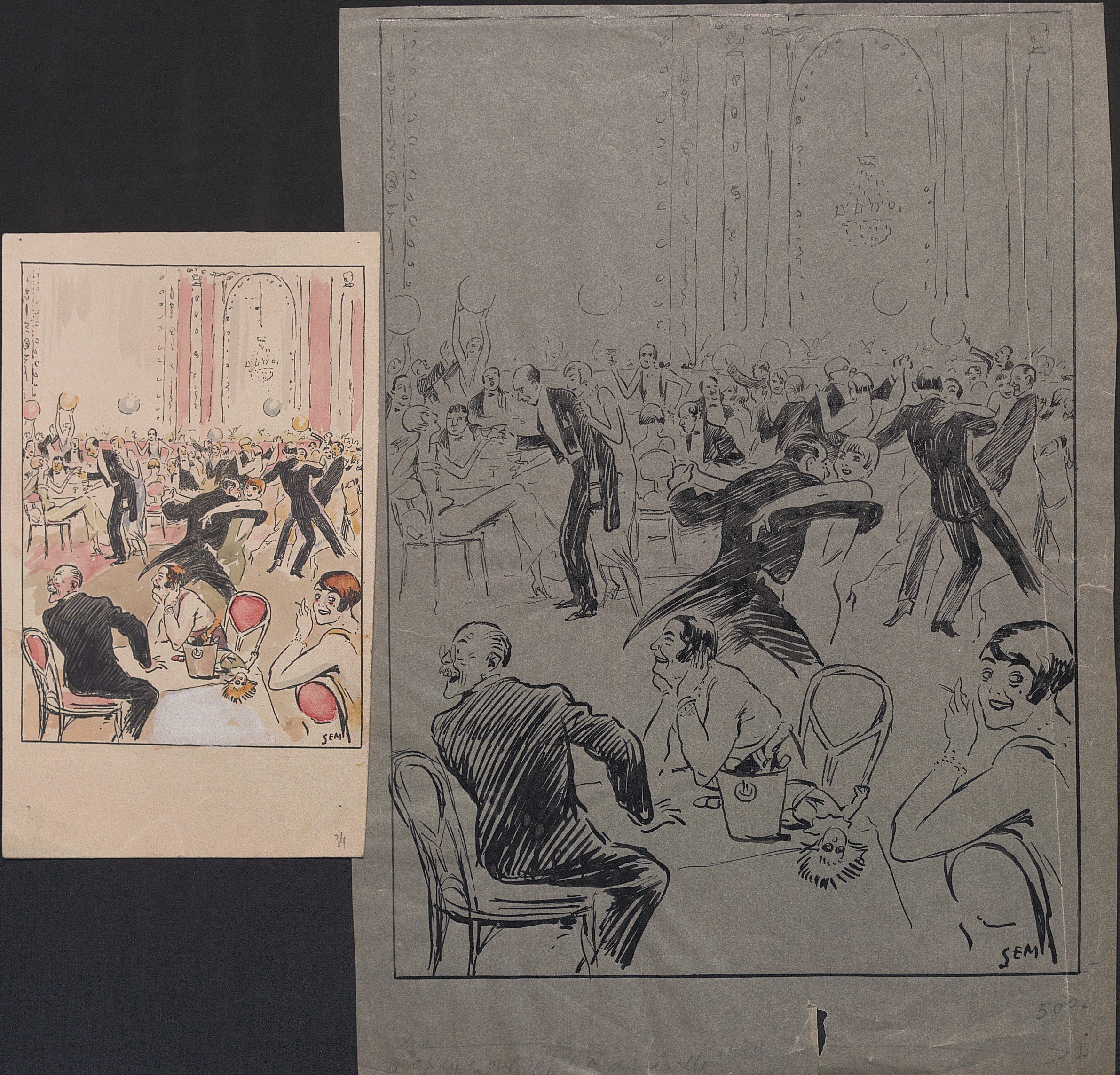 Soirée dansante, encre sur calque, signé, 31,5 x 22 cm et encre à rehauts aquarellés sur papier fort, signé, 18 x 11 cm ;