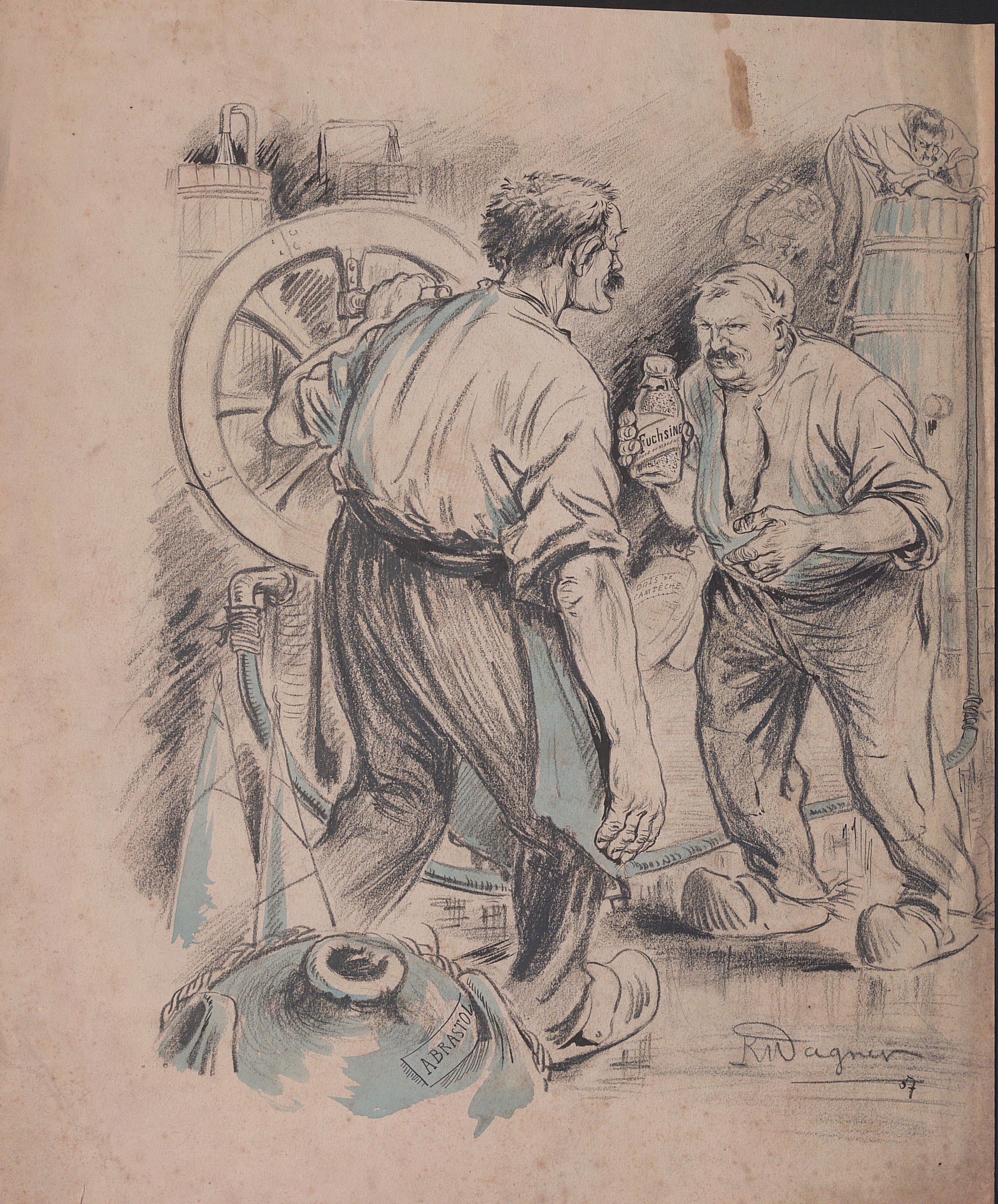Fabrication de la fuchsine, fusain et rehauts aquarellés bleu, signé en bas à droite « R. Wagner », 39,5 x 32,5 cm (petites déchirures en marge, légères rousseurs et tâches).