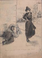 Sans titre, encre, fusain et crayon bleu, signé en bas à droite « P. Gonzague-Privat », légendé « Ca f ich’ tout son pognon au mastroquet et les tites femmes à s’tapent Malheur!! », 41 x 29 cm ;