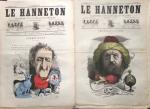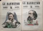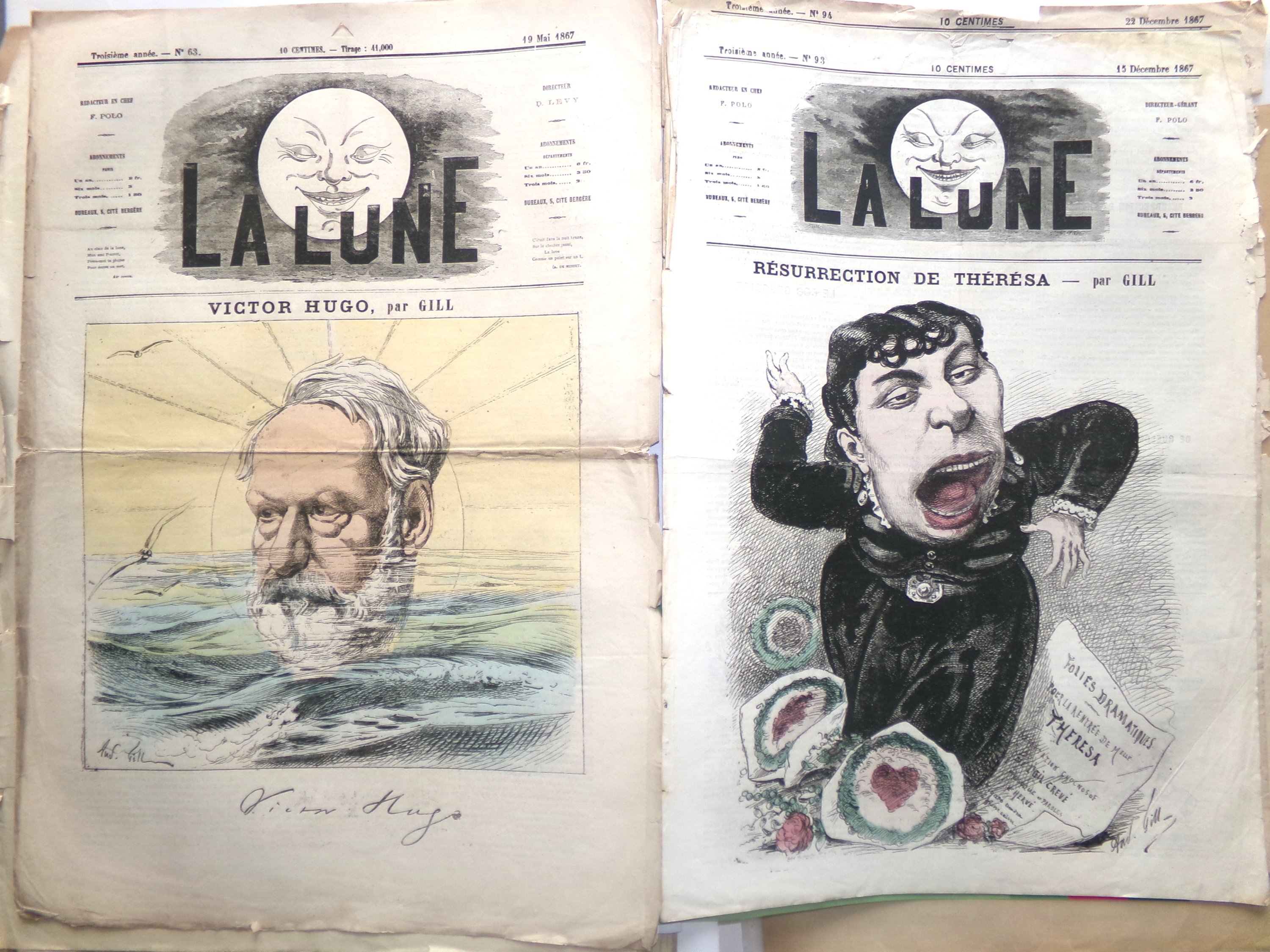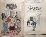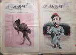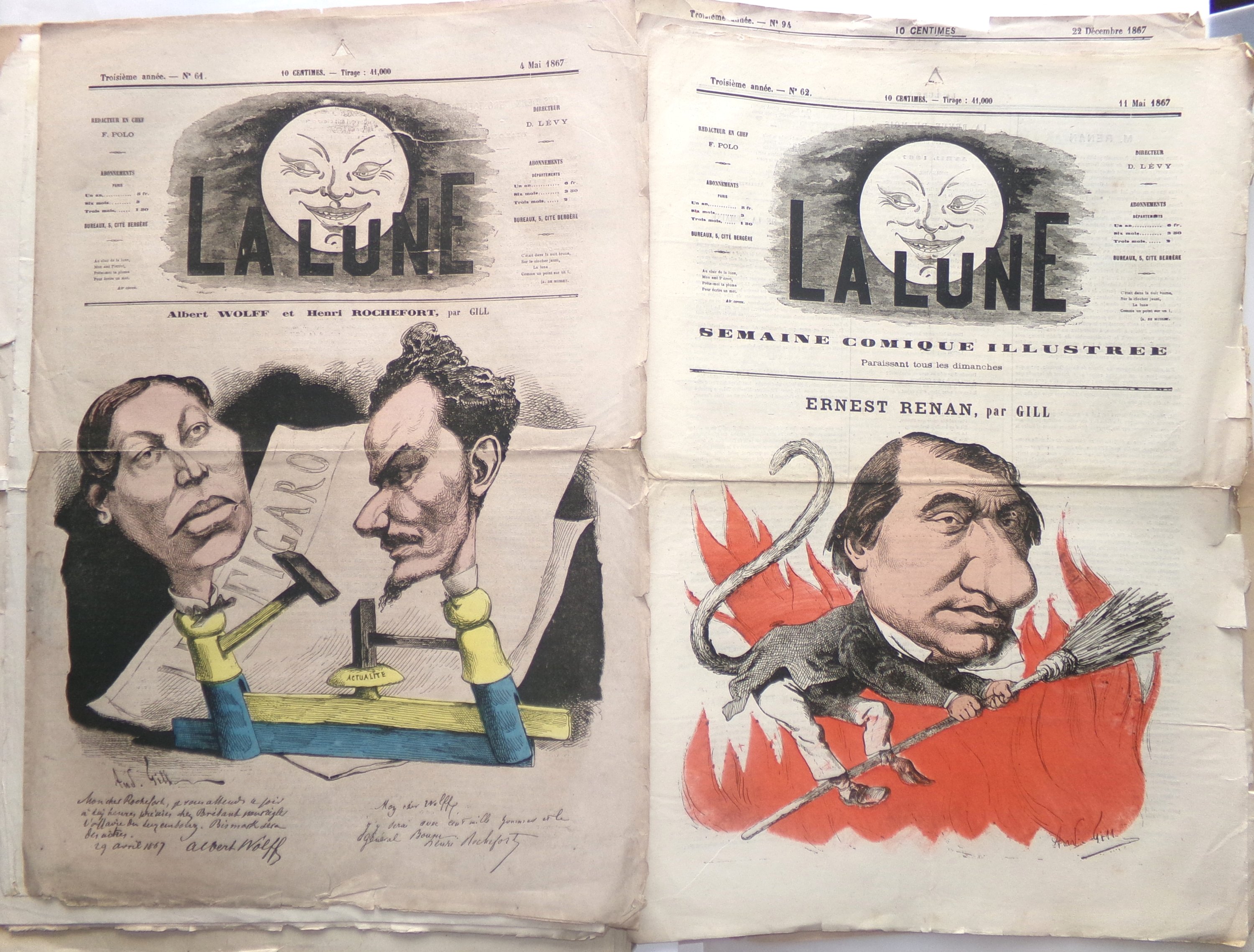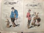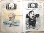 Lot de + de 100 numéros dépareillés de journaux parus entre 1867 et 1913, dont: La Lune (15 ex.), La Lune Rousse (10 ex.), Le Hanneton (11 ex.), Le C ri (5 ex.), La Comédie politique, Le Carillon, Le Clou, Le Tam-Tam, Le Titi, Drolatic-Industry, Le Géant, Gil Blas, La Nouvelle Lune, Paris-Comique, La Silhouette, Le Bouffon, Le Bonnet Rouge, etc.