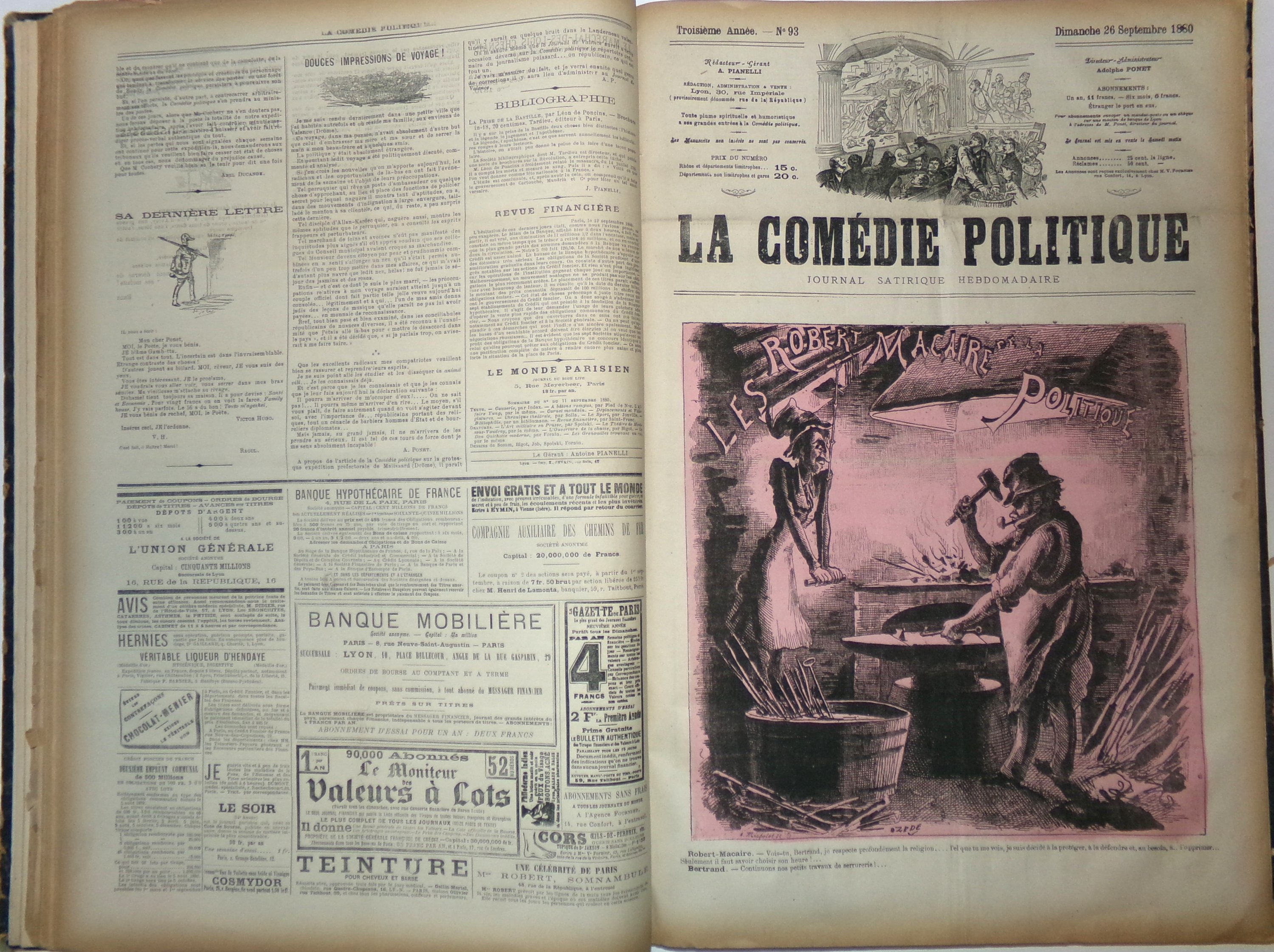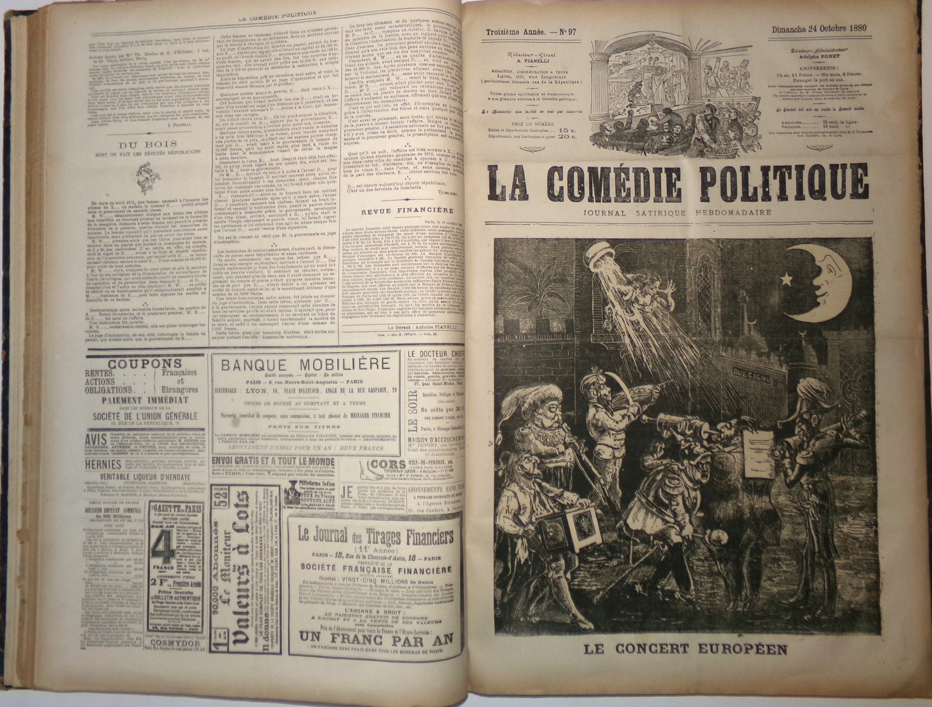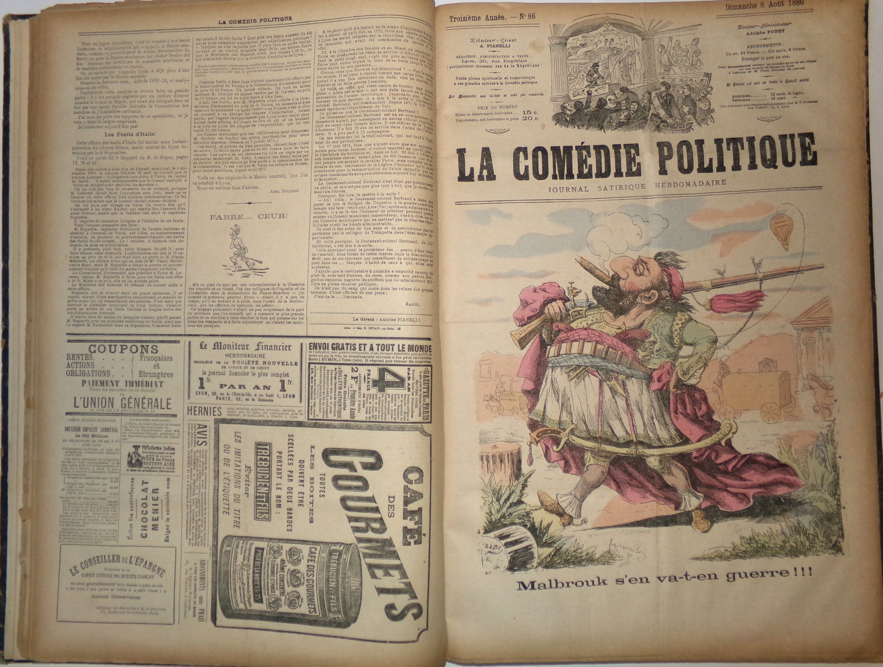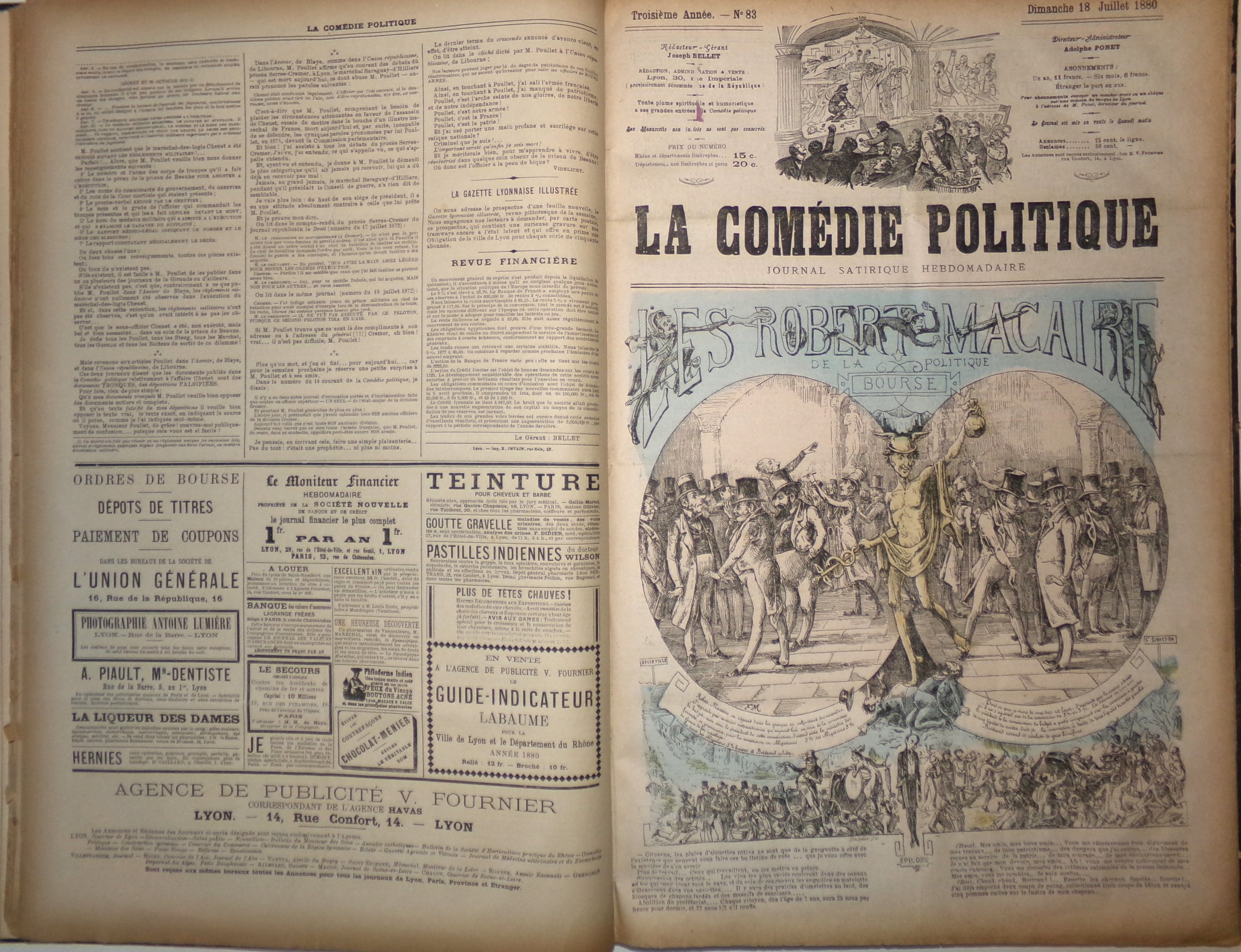 La Comédie politique est un journal fondé en 1871 à Lyon par Adolphe Ponet (1837-1900), ancien typographe devenu journaliste, et membre du Comité impérialiste lyonnais. Initialement pro-Bonapartiste, La Comédie politique est fortement anti-républicaine et ne manque pas de critiquer la mise en oeuvre de la IIIème République sous la présidence de Jules Grévy. La succession des ministres et les remaniements consécutifs du gouvernement dans les années 1880 à 1890 (Ferry, Gambetta, Freycinet) sont l'objet de ses railleries et alimentent les caricatures attractives qui font la Une du journal. De nombreuses interruptions, notamment dues à des procès et à l'emprisonnement de son fondateur.