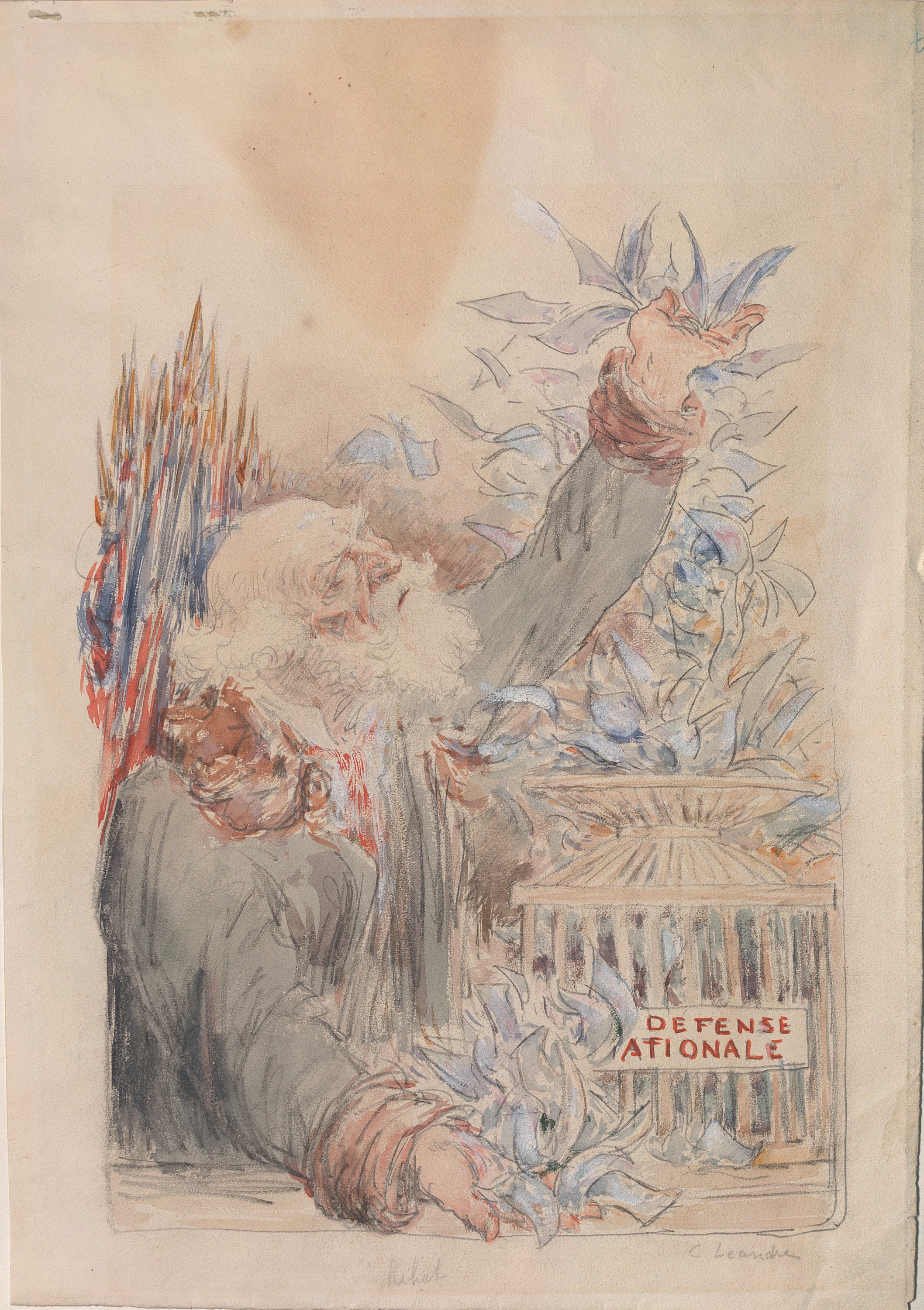 Défense nationale, crayon et aquarelle, sur papier, signé en bas à droite, 43 x 30 cm (tâche).