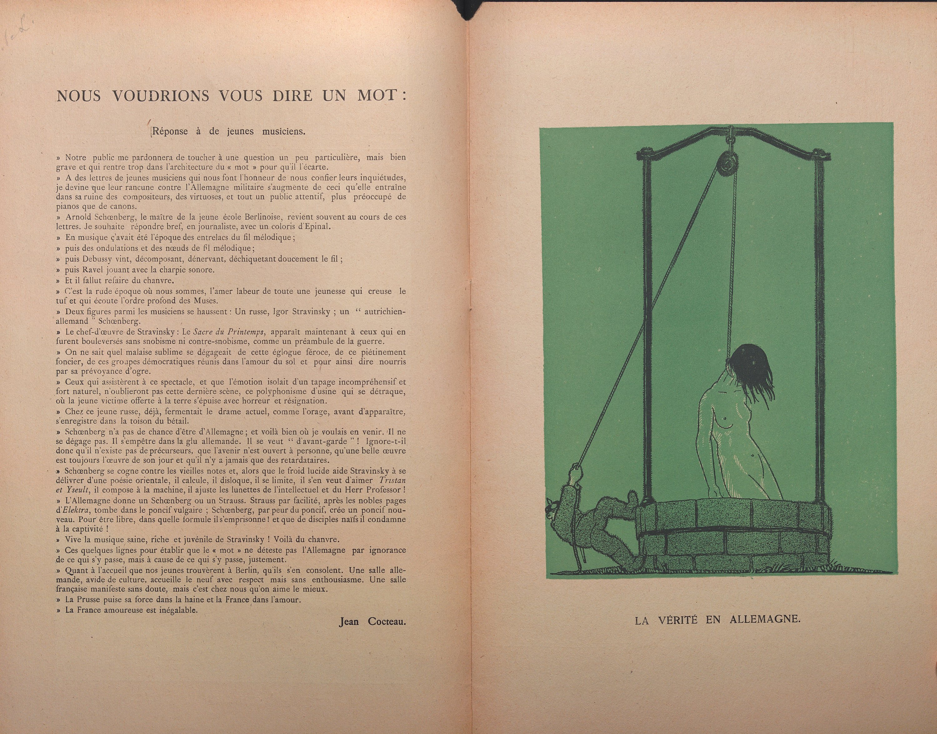 Rare et bel ensemble de cette revue satirique et patriotique, anti-allemande, dirigée par Paul Iribe en collaboration avec Jean Cocteau, que les deux amis, réformés pour raison de santé, fondèrent pour participer à l’effort de guerre.