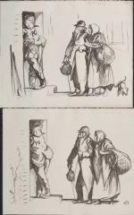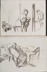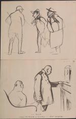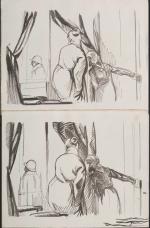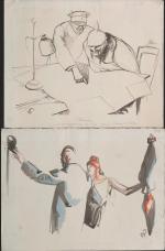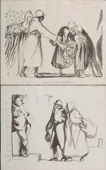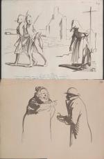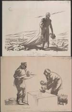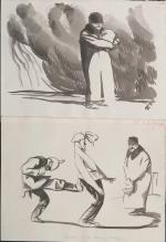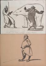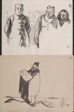 Lot de 36 dessins de presse originaux, à l’encre, aquarelle et fusain, sur papier, en majorité signés, la plupart légendés au crayon, portant au dos cachet de la vente à la Galerie de Chartres du 23-10-2000, env. 25 x 31 cm.