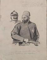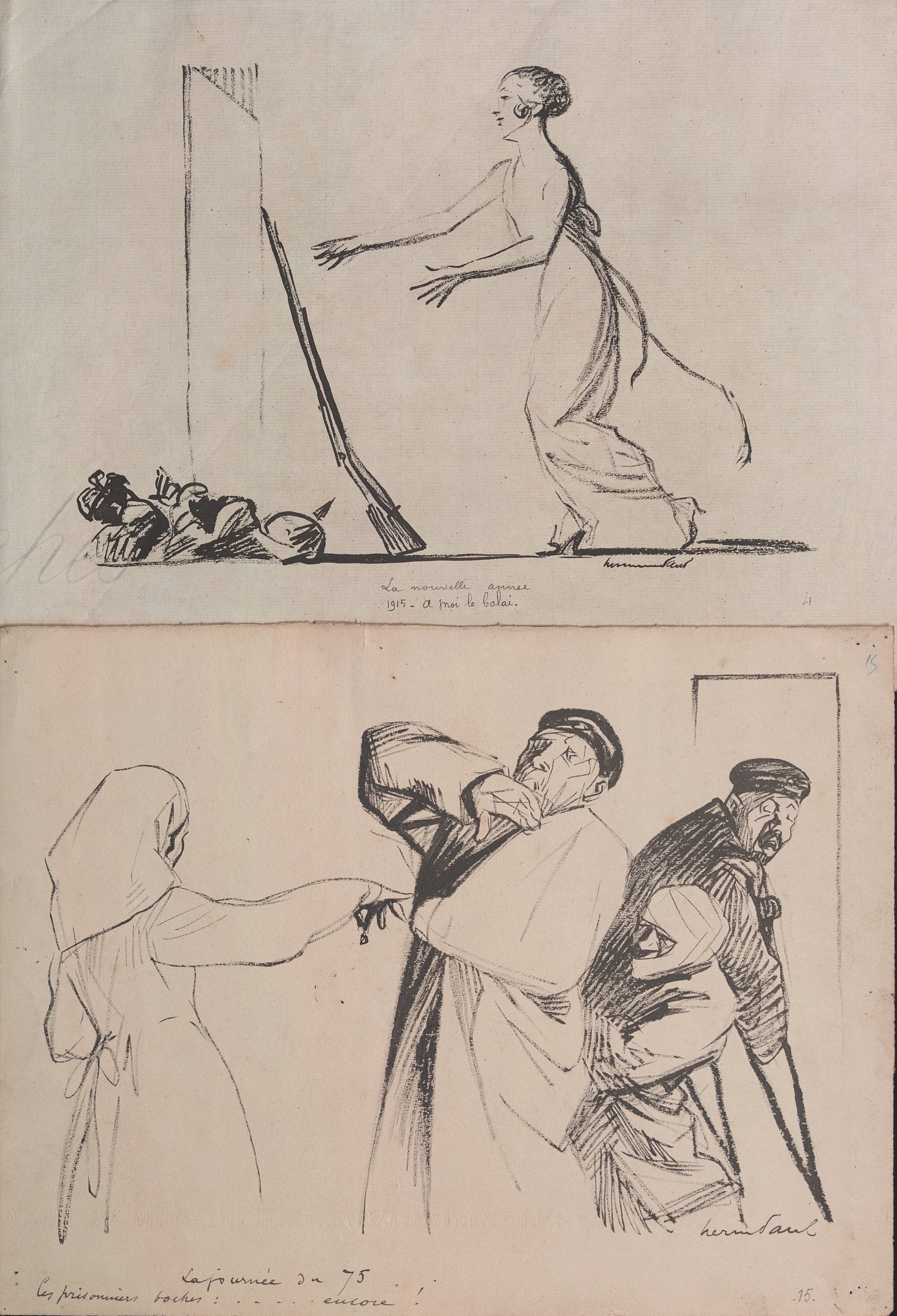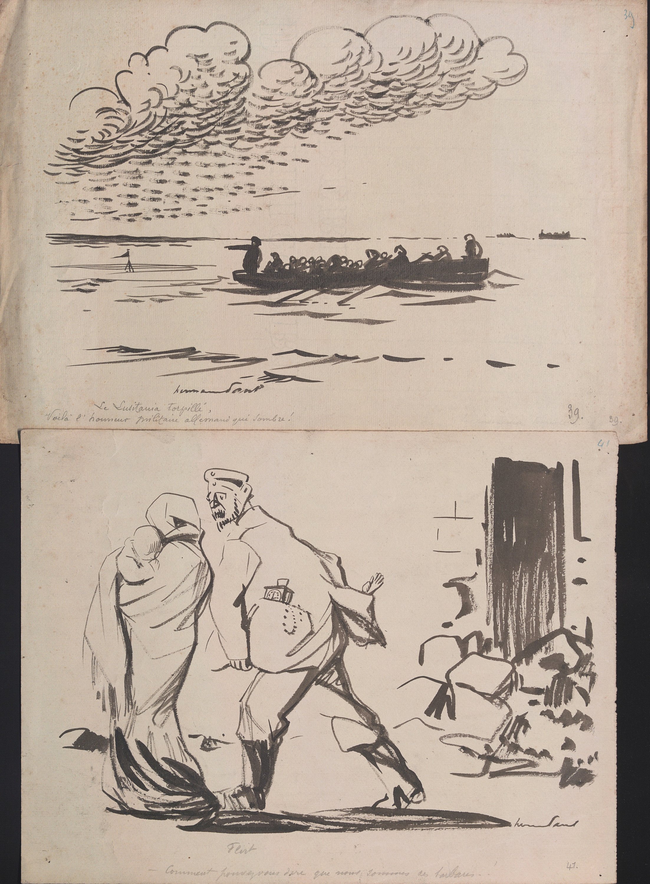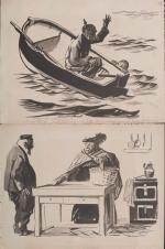 Dont 11 planches signées et en majorité légendées, non datées (sauf 1 pl.), dont: « La journée du 75 » ; « La nouvelle année 1915 » ; « Le Lusitania torpillé » ; « Flirt » ; « Le Boche et le neutre » ; « La dernière mominette » ; « Sur la plage de Scarborough » ; etc.
