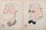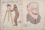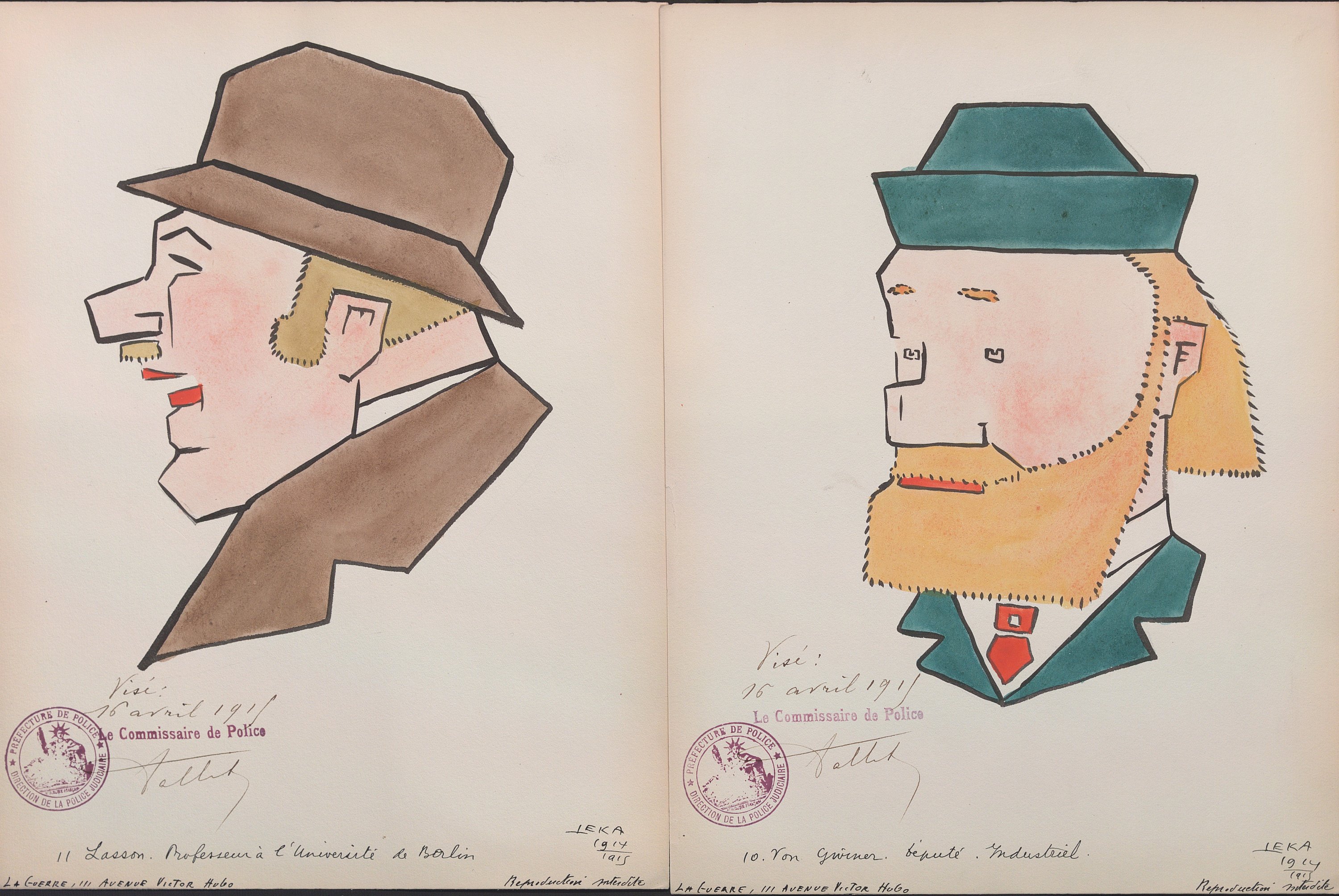 Harry Leka, Leurs intellektuels kubistés par Leka, 16 portraits caricaturés, encre et aquarelle, signés, datés 1914-1915, légendés, chacun portant le visa du commissaire de police de Paris du 16 avril 1915, 31,5 x 23,5 cm ; portraits cubistes de personnalités allemandes ;