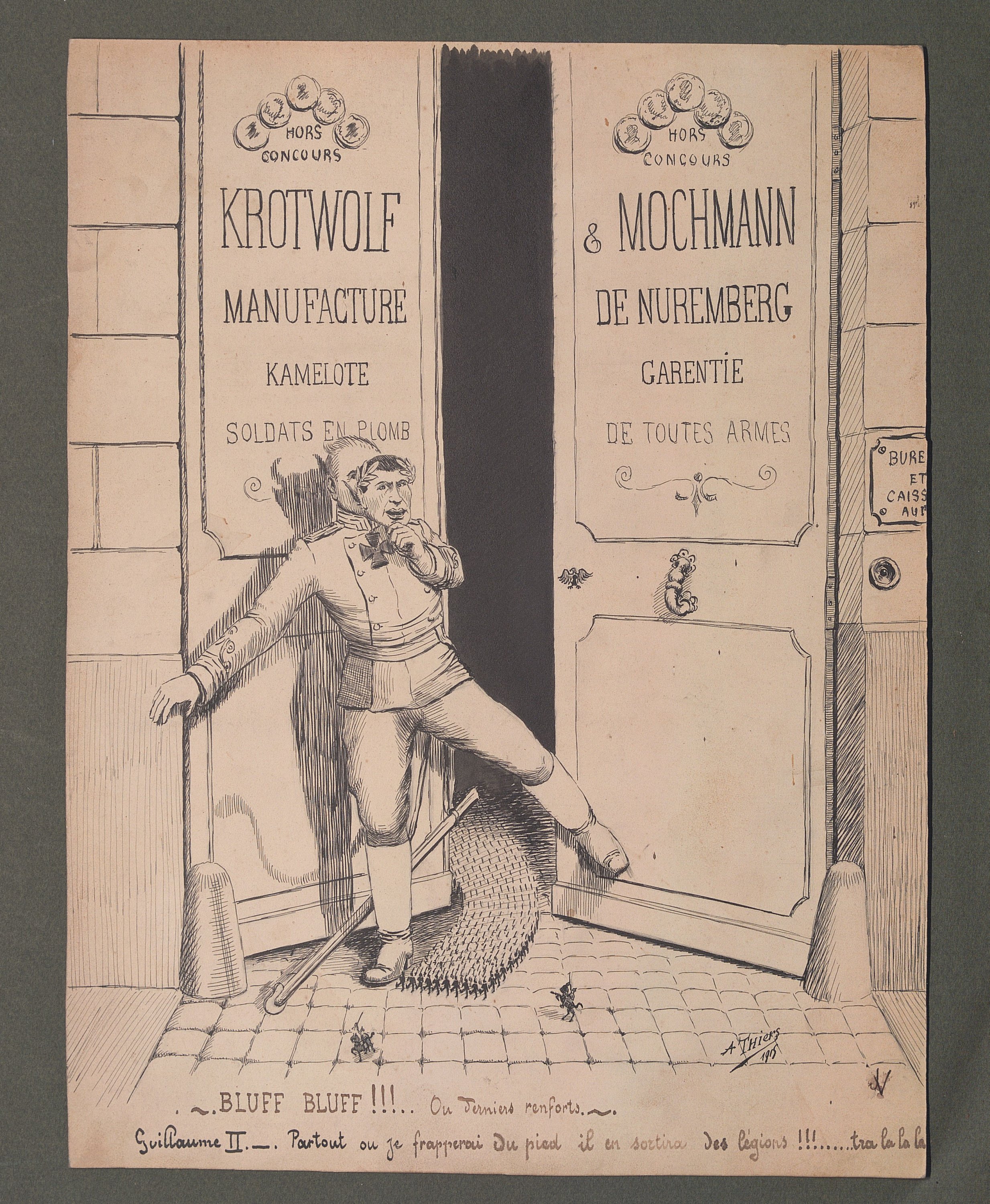 A. Thiers, Bluff Bluff!!! ou derniers renforts, encre, signé et daté 1915, légendé « Guillaume II: Partout où je frapperai du pied il en sortira des légions!!!... tra la la », 31,5 x 23,5 cm ;