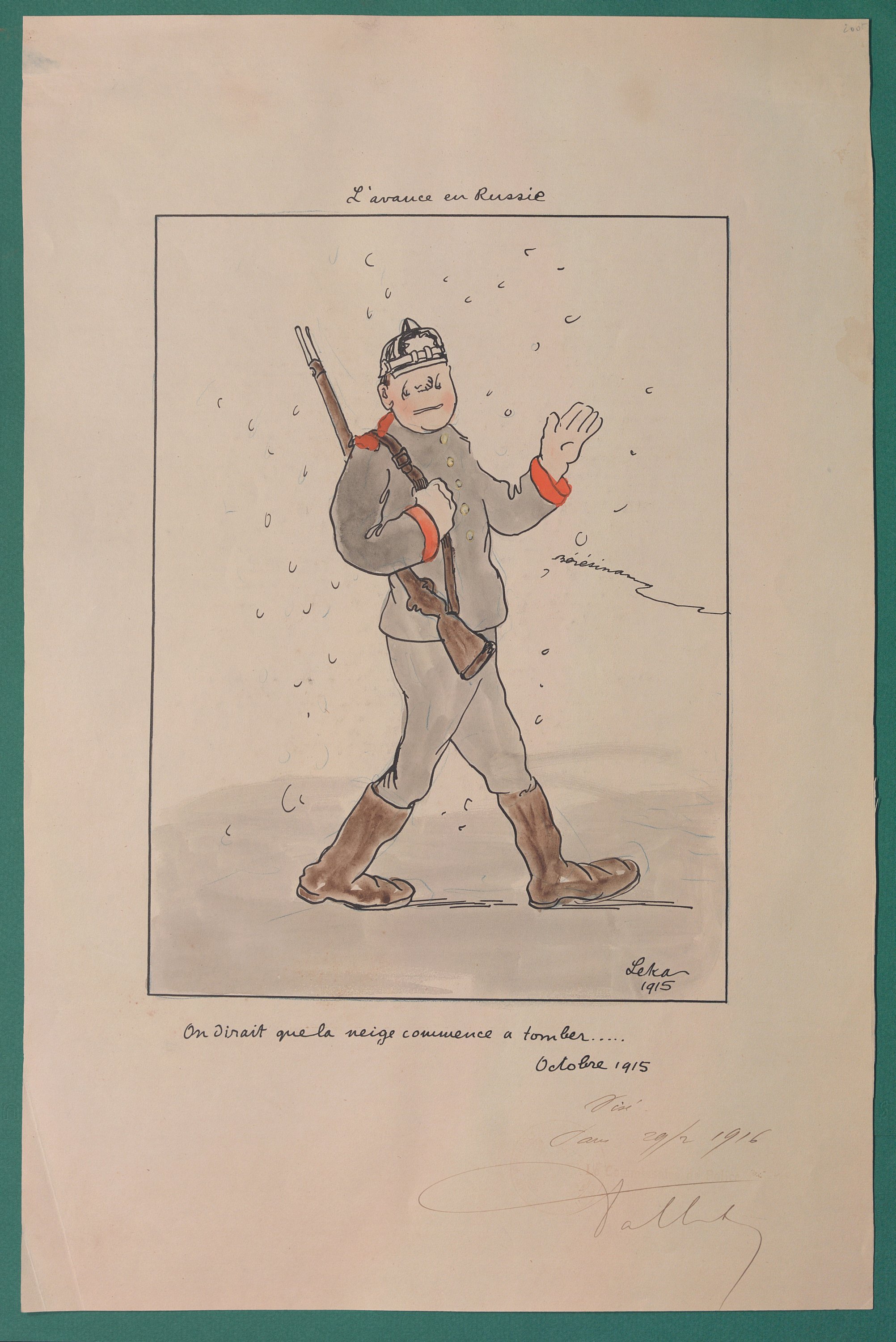 Harry Leka, L’avancée en Russie, encre et aquarelle, signé et daté 1915, légendé « On dirait que la neige commence à tomber octobre 1915 » ; visa du20 février 1916 ; 50 x 32 cm ;