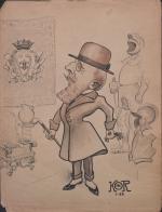 5 épreuves originales sur papier, signées et datées, entre décembre 1921 et avril 1922, scènes satiriques pour la presse finement réalisées sur le thème de la justice, la Compagnie du chemin de fer Paris-Orléans (PO), Philippe duc d’Orléans prétendant orléaniste au trône de France, etc, 33 x 25 cm (petits accdts).